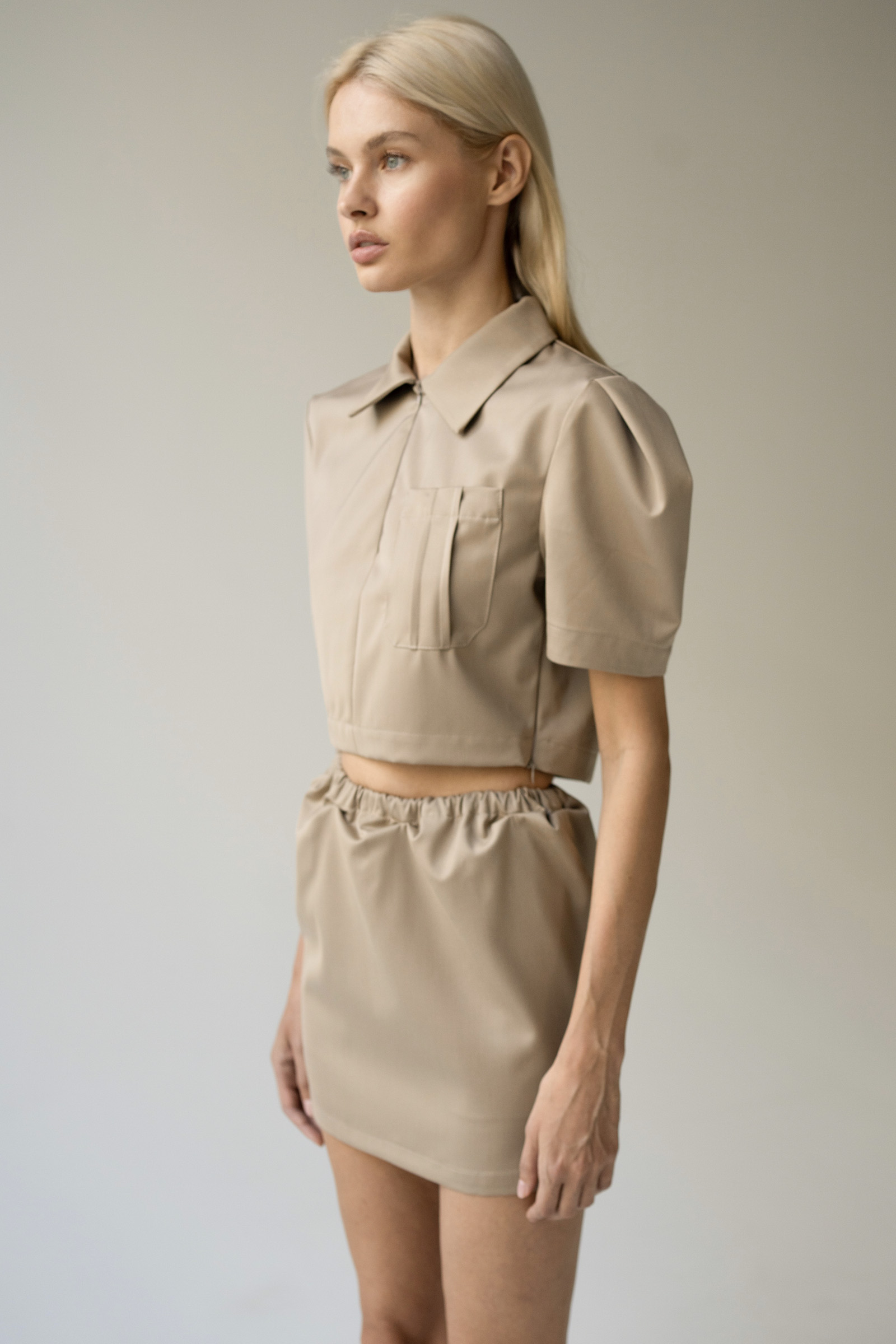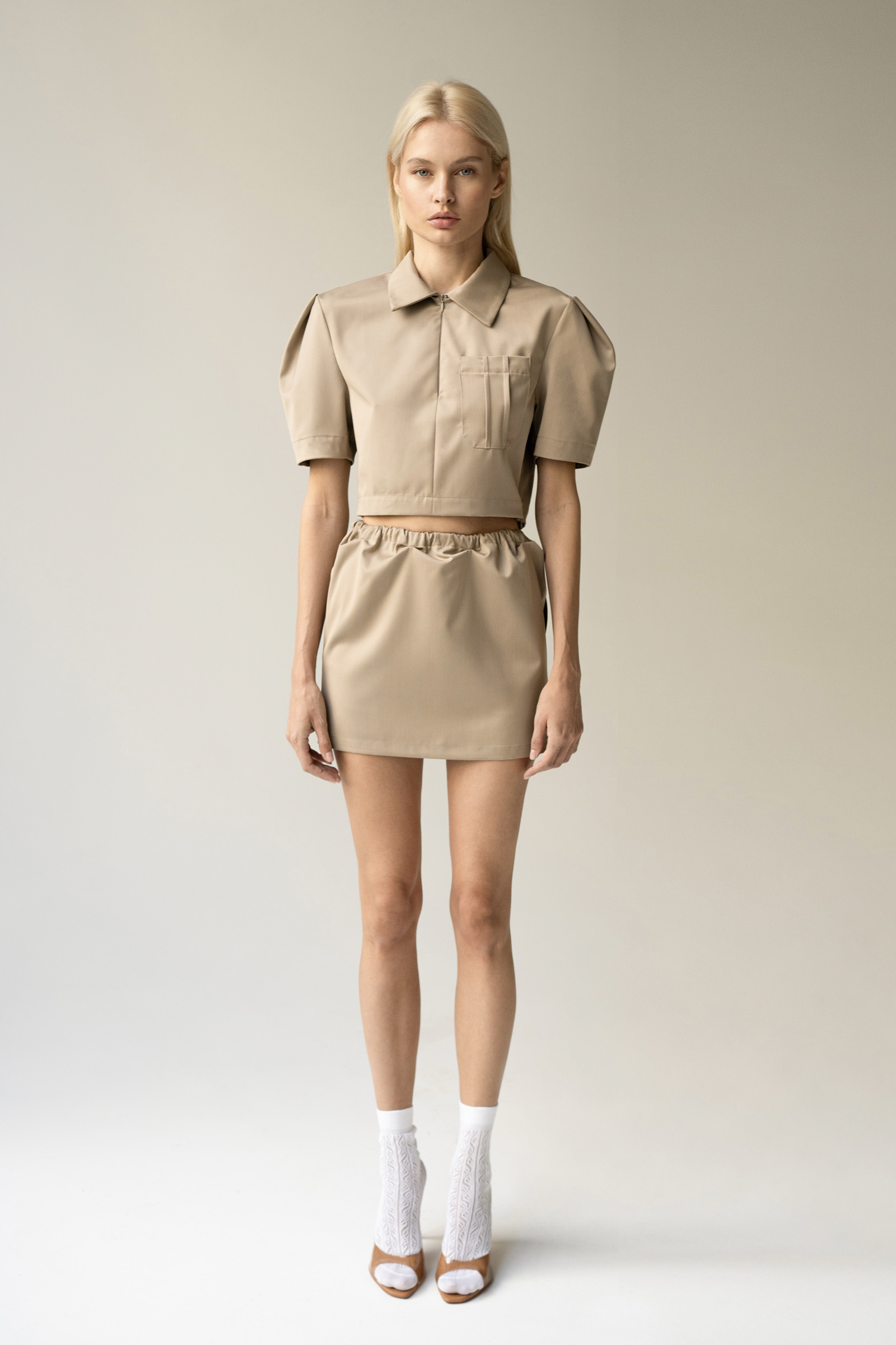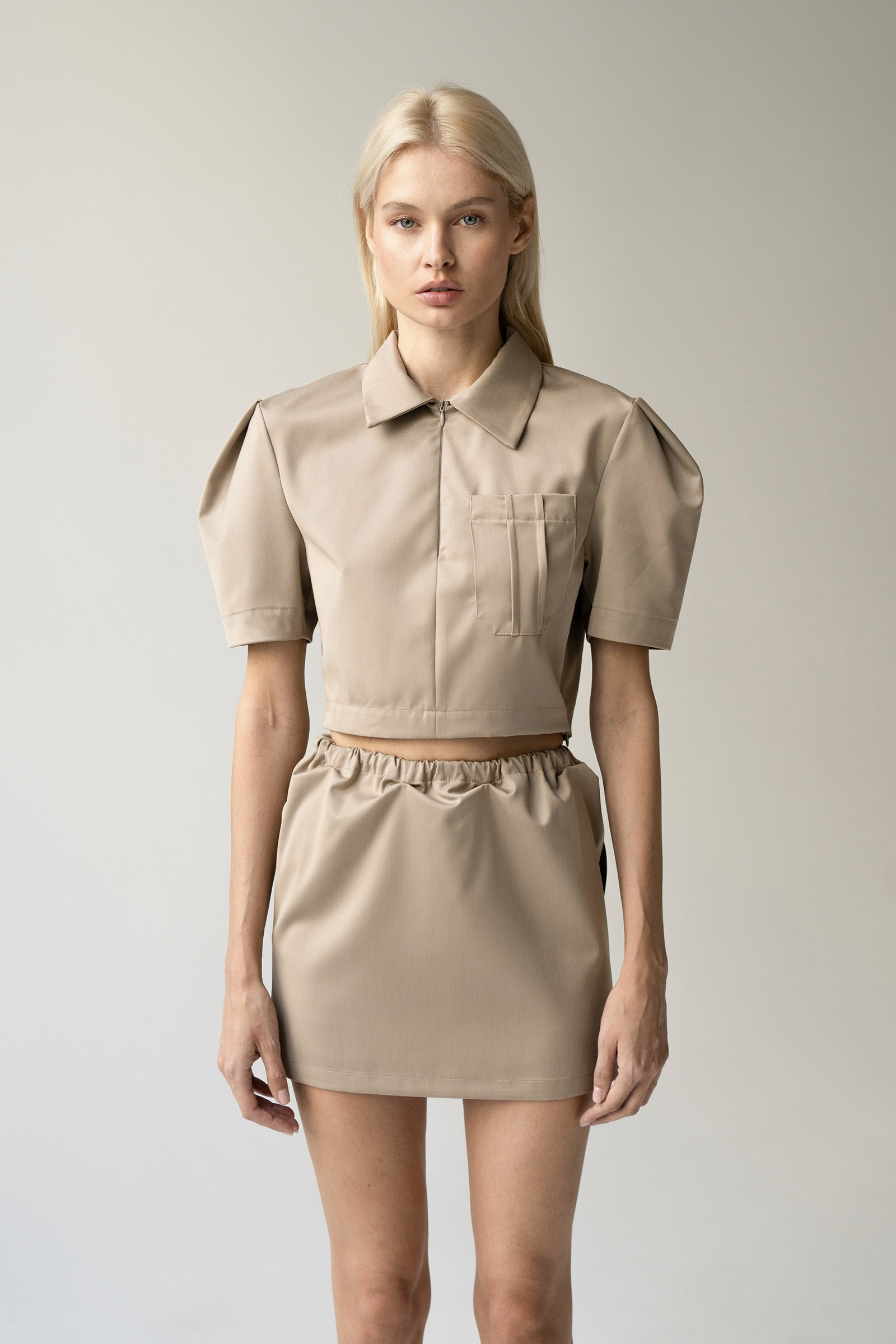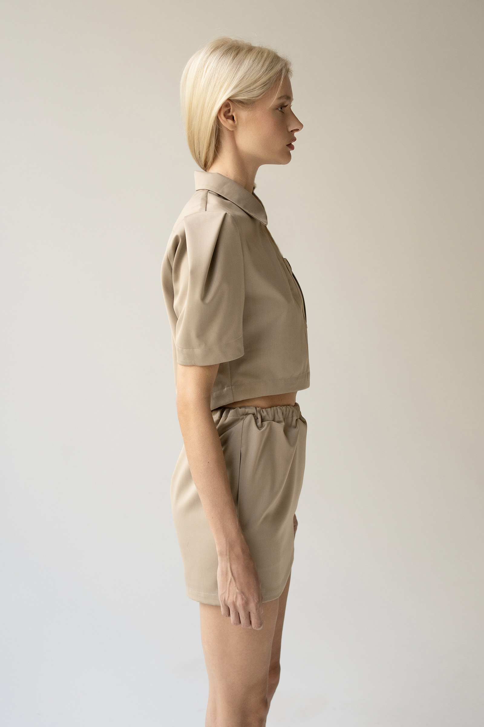 Укороченная блуза свободного кроя с рукавами-фонариками сшили из легкой, костюмной ткани на основе вискозы и хлопка. Застегивается на потайную молнию.