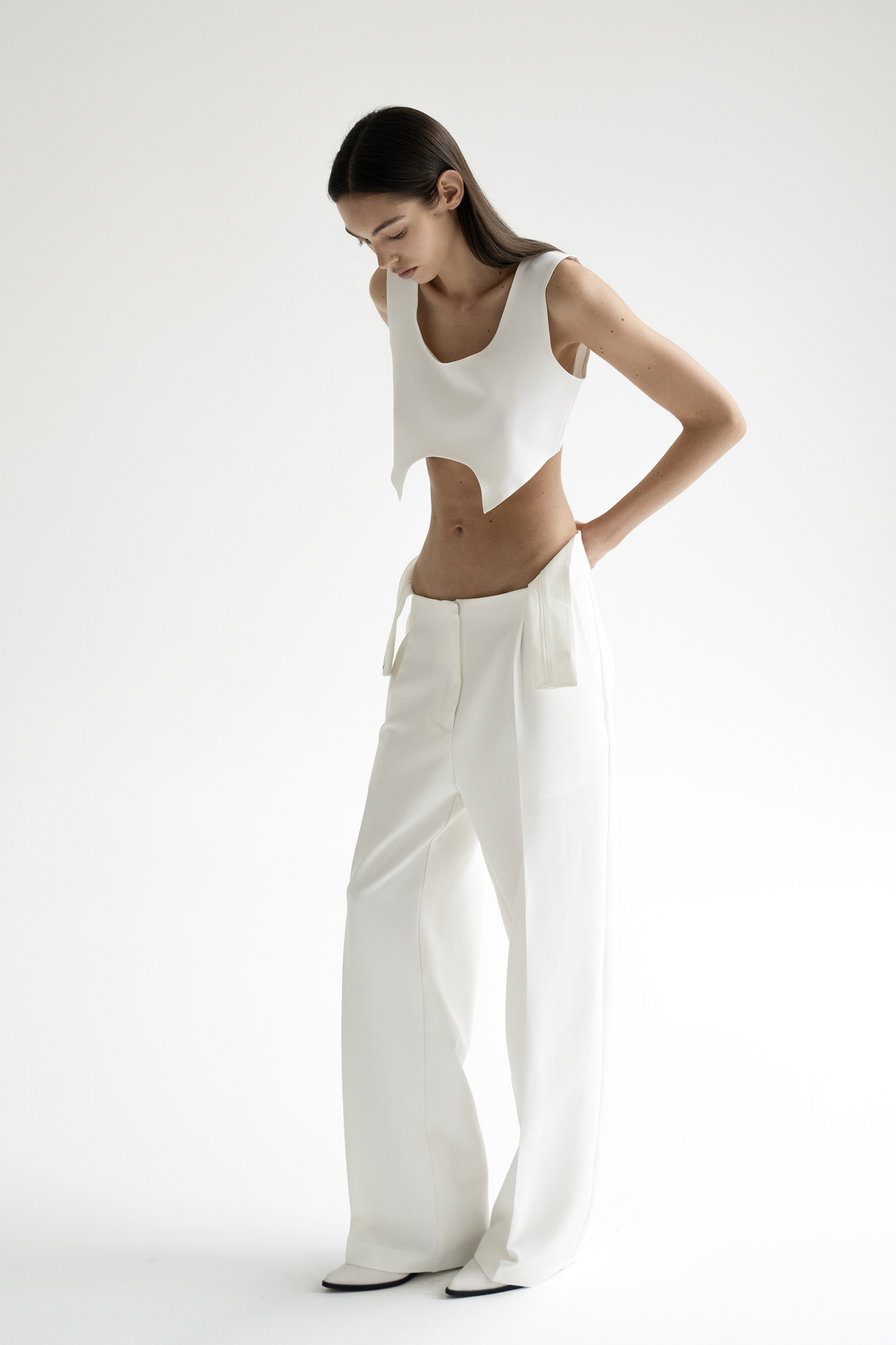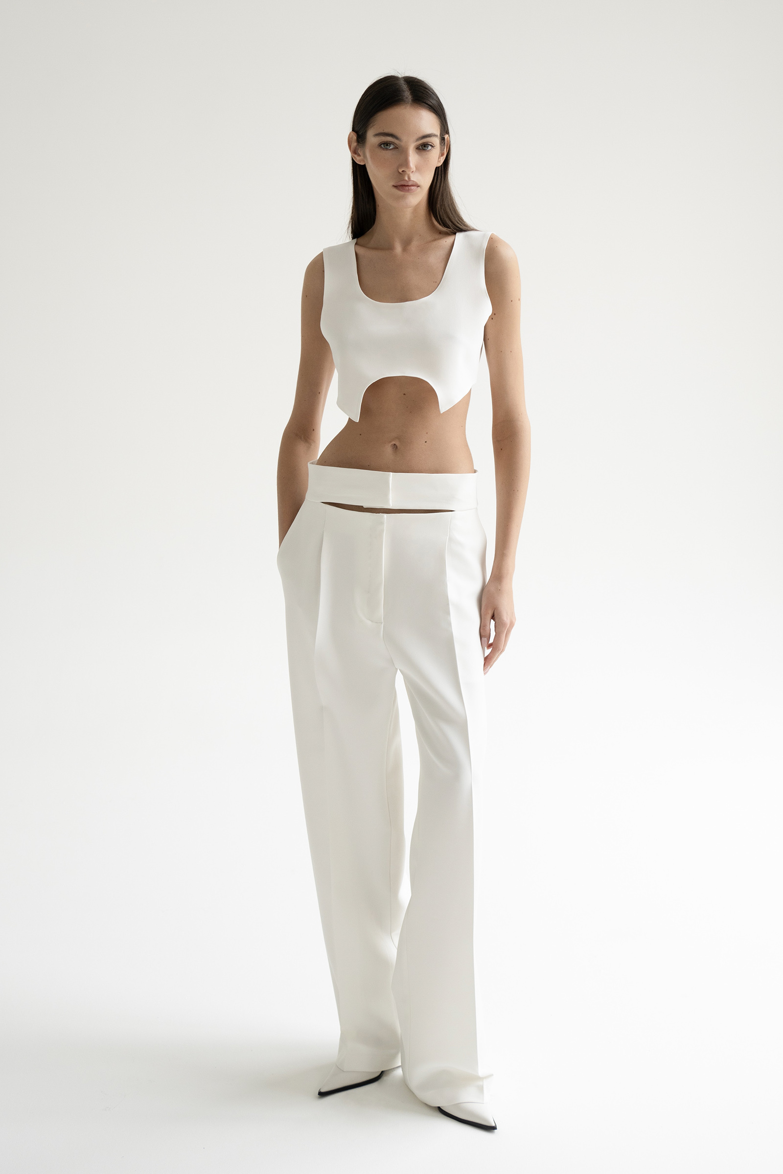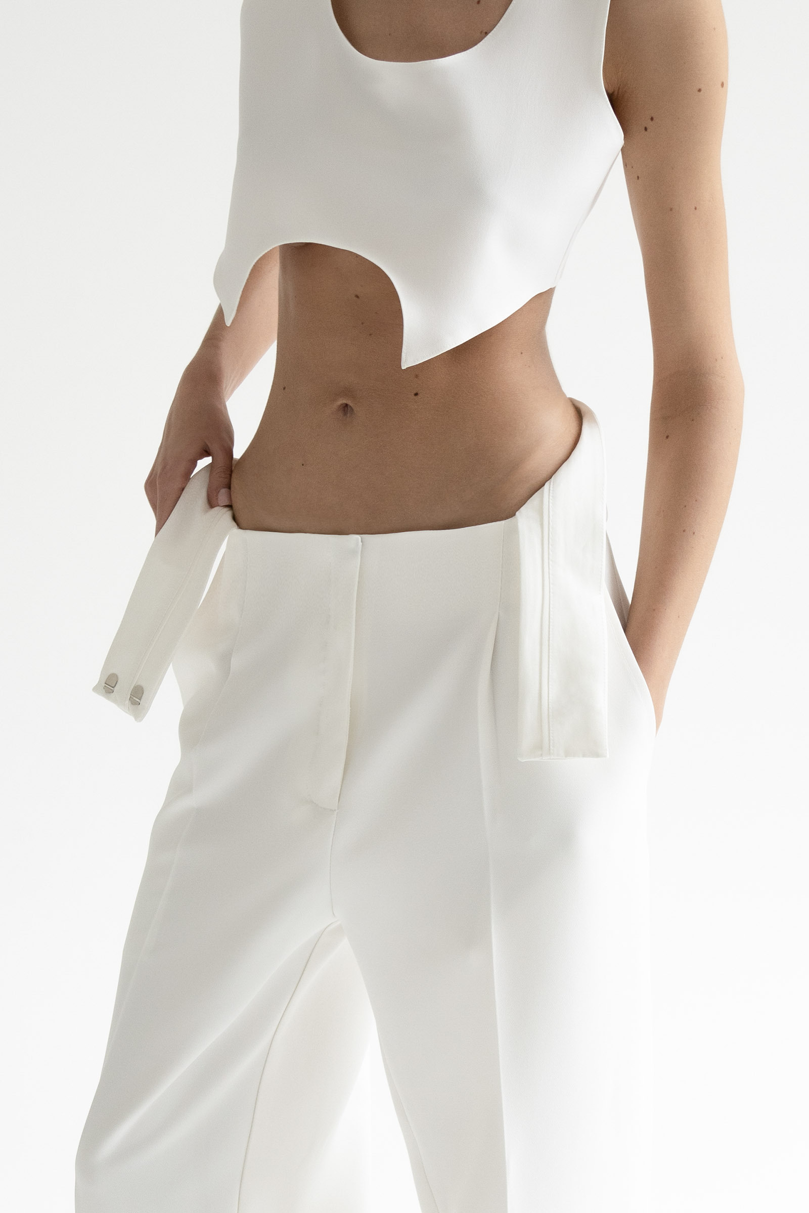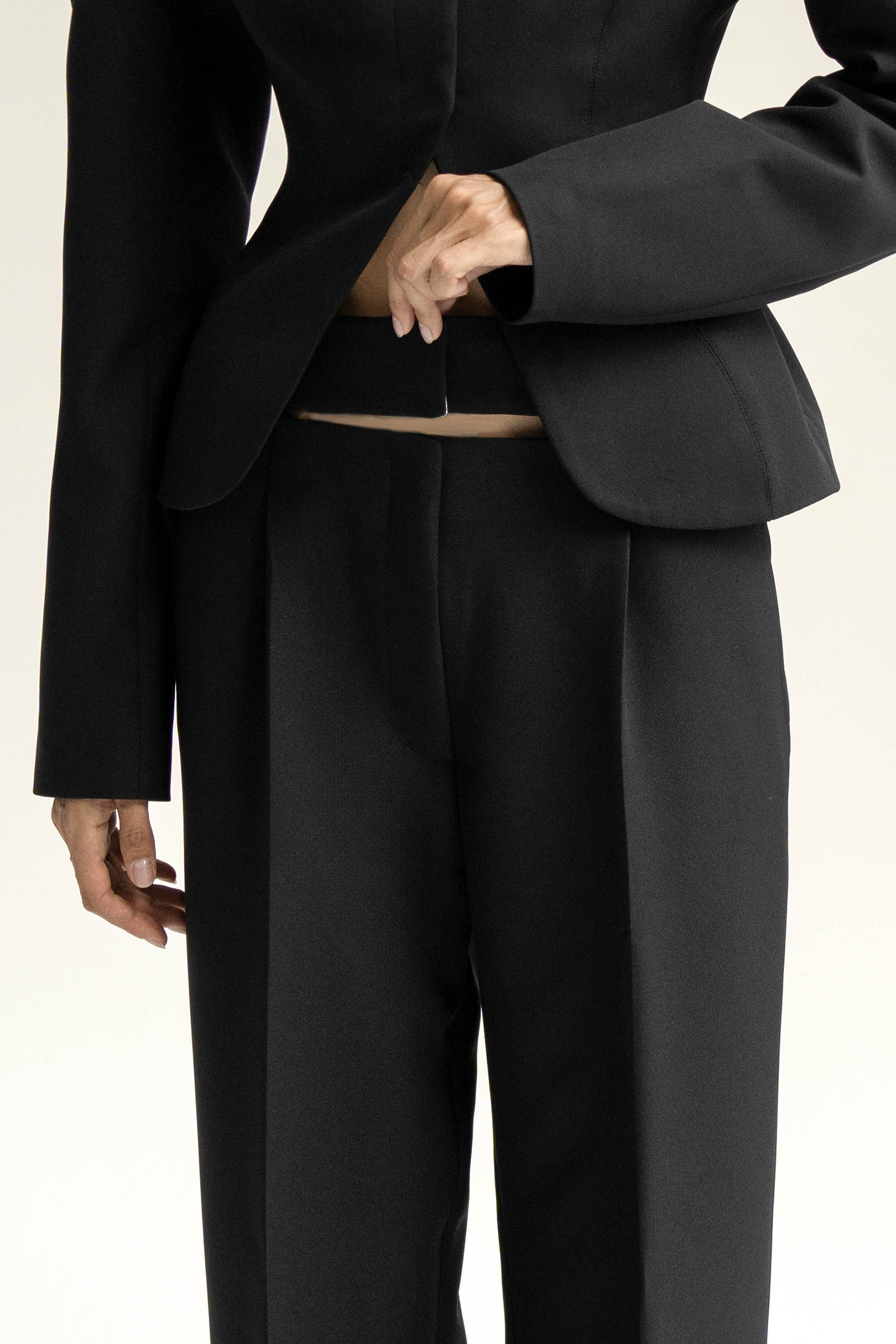 Брюки с средней посадкой и выглаженными стрелками выполнили из костюмной ткани на основе вискозы. Модель с двумя боковыми карманами и с акцентом на поясе. Брюки идеально сочетаются с жакетом и топом Blanche из нашей коллекции.