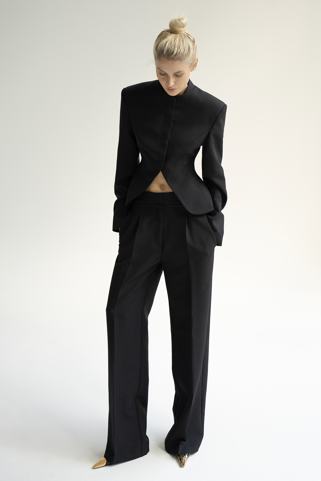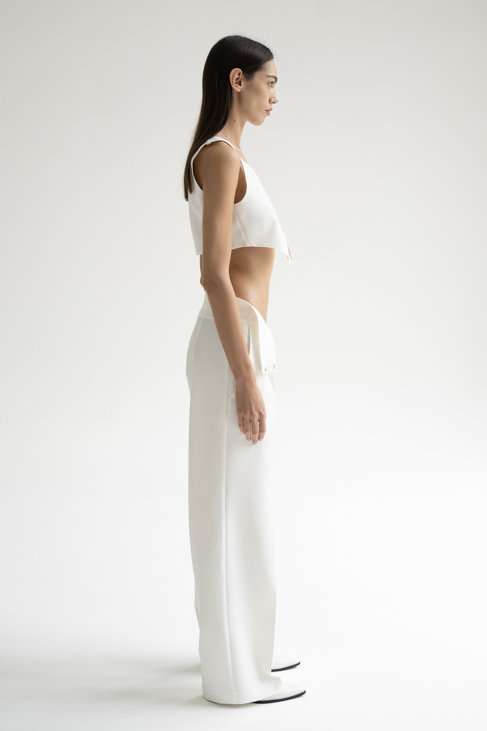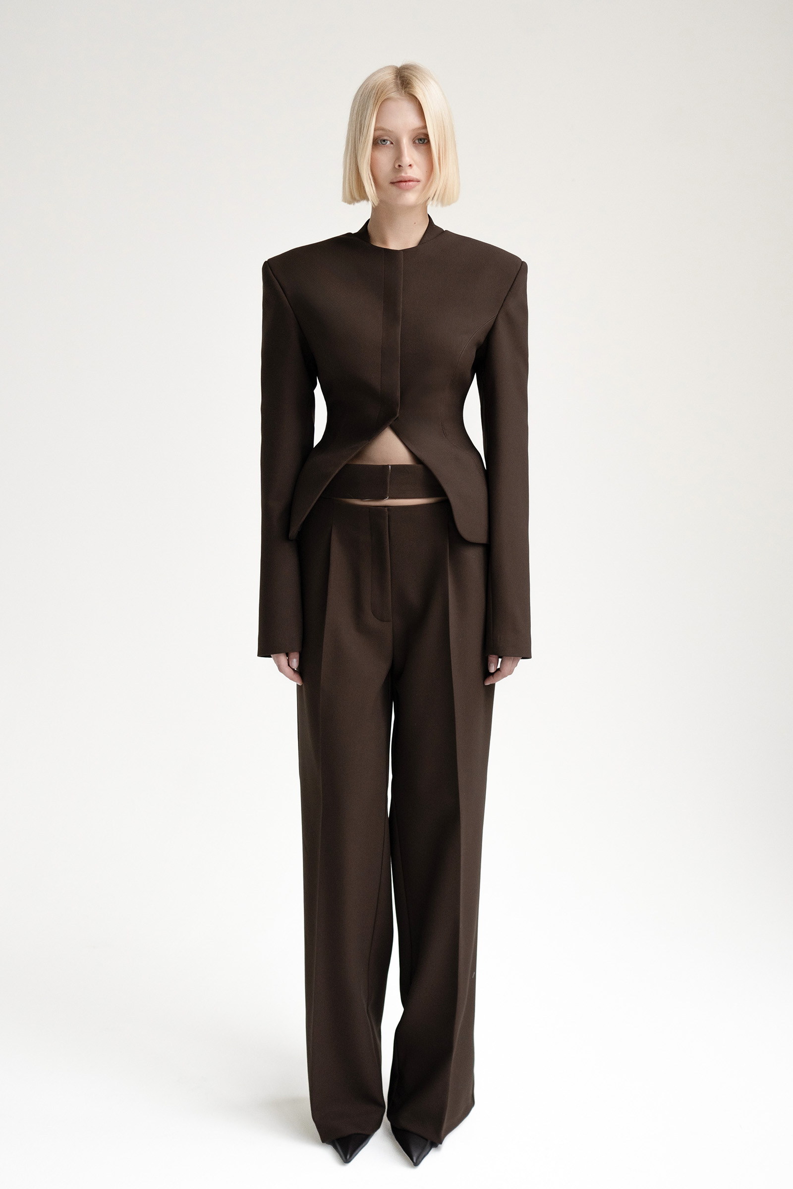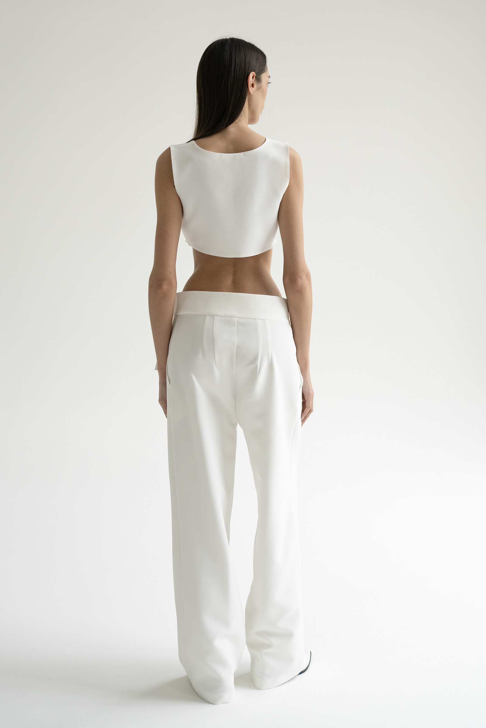 Брюки с средней посадкой и выглаженными стрелками выполнили из костюмной ткани на основе вискозы. Модель с двумя боковыми карманами и с акцентом на поясе. Брюки идеально сочетаются с жакетом и топом Blanche из нашей коллекции.
