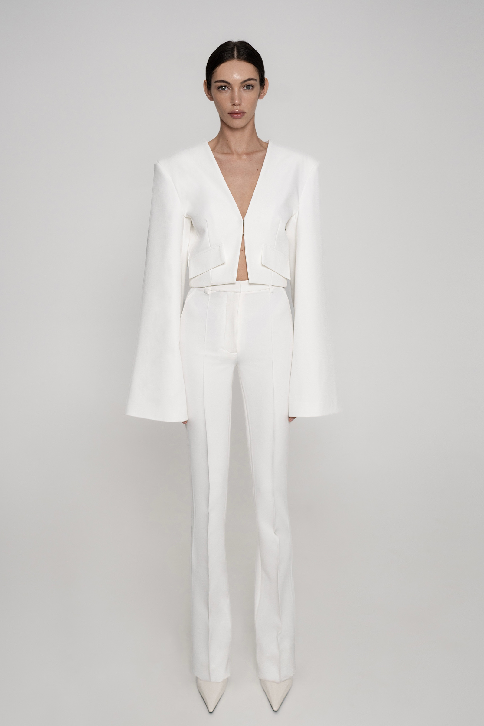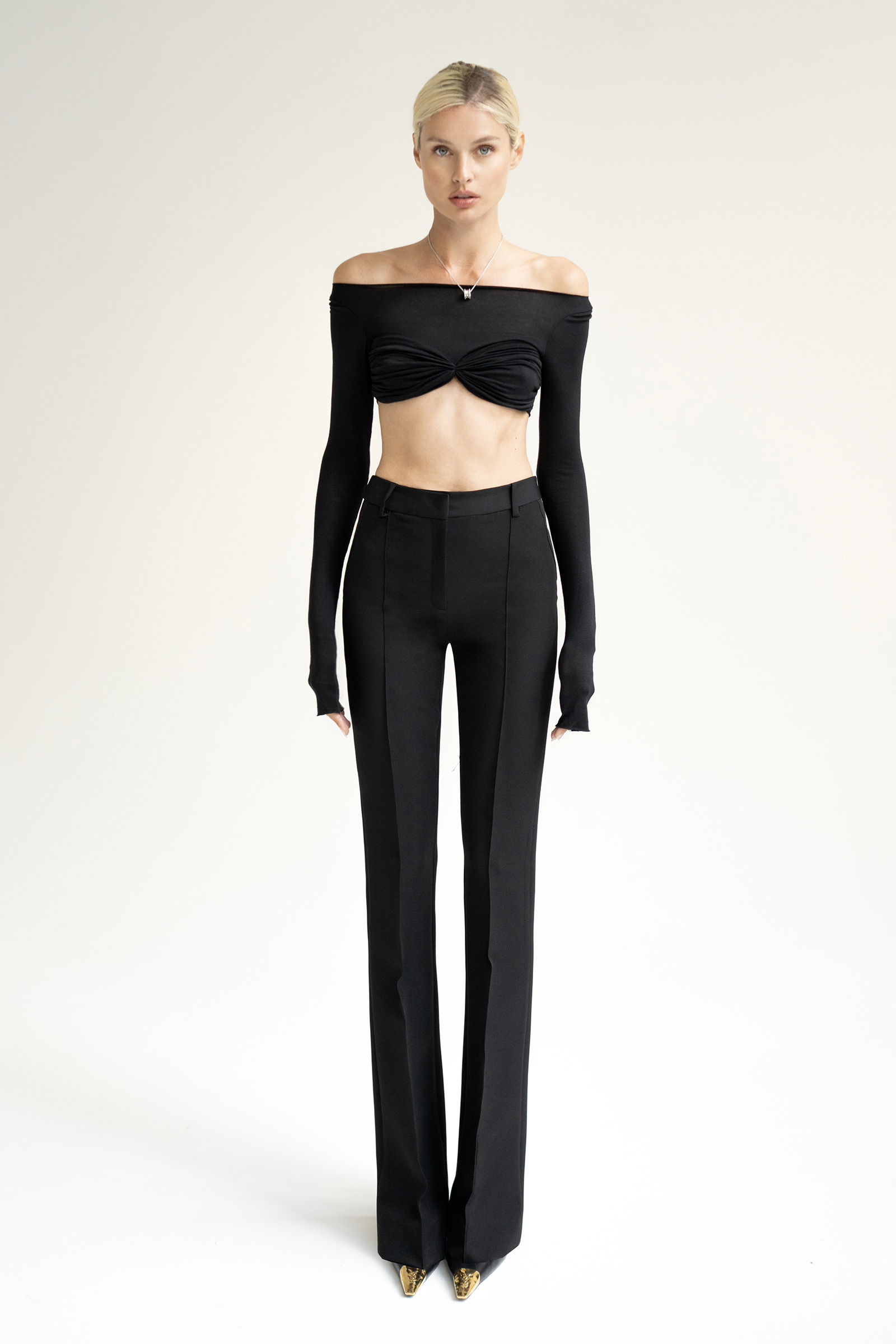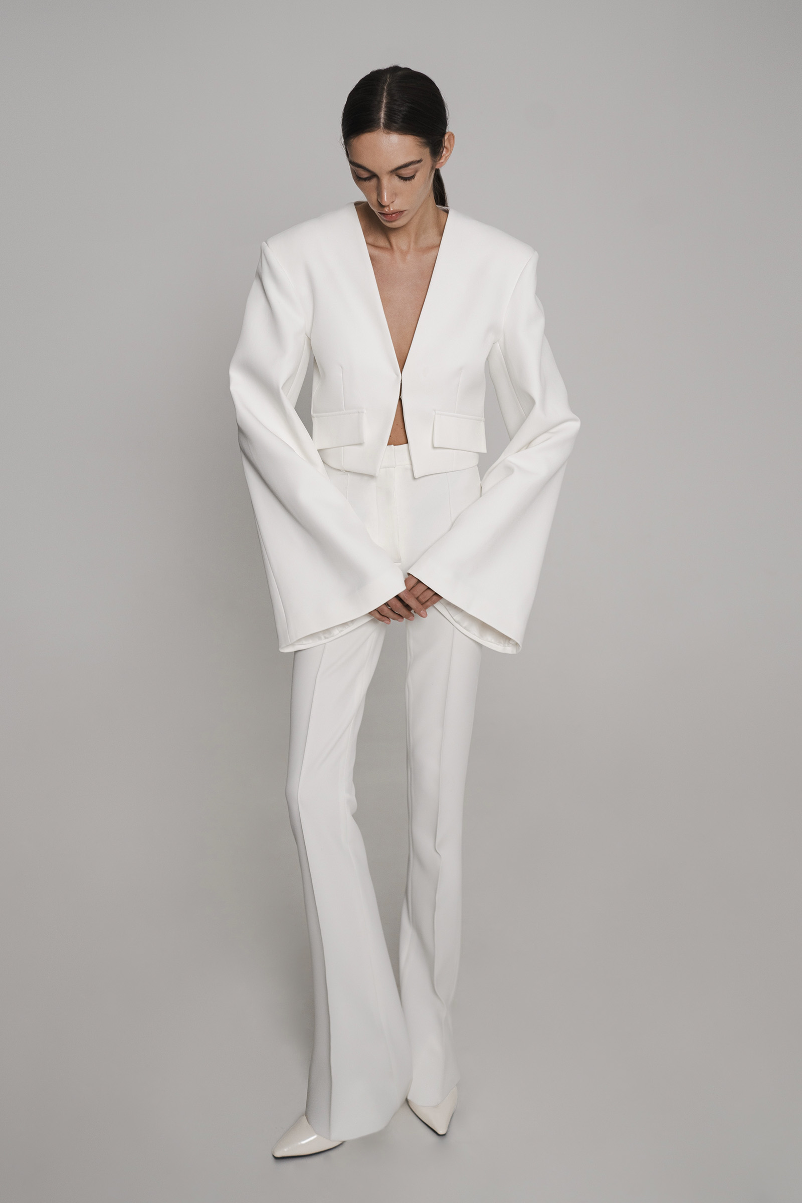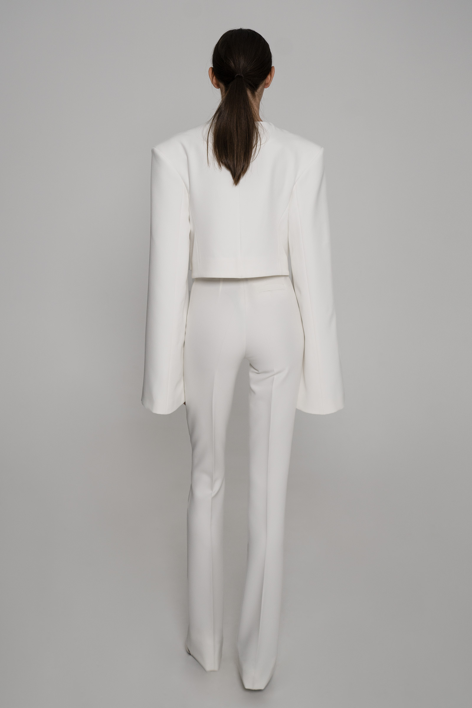 Брюки из костюмной ткани на основе вискозы с идеально выверенным кроем. Чёткие отстроченные стрелки визуально удлиняют ноги, создавая лаконичный и продуманный образ. Лёгкий клёш и высокая посадка подчёркивают силуэт.