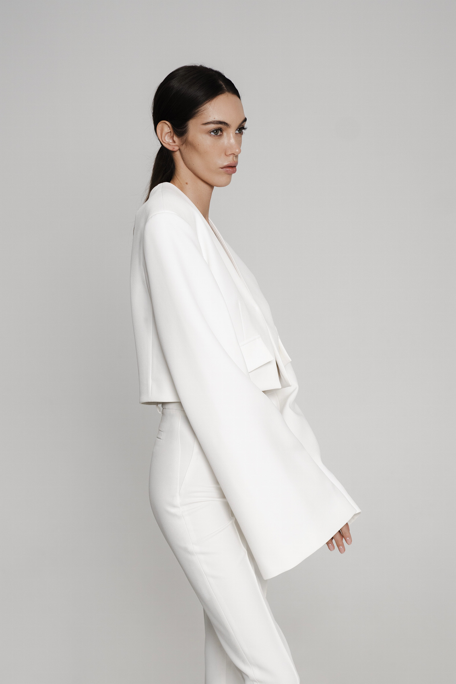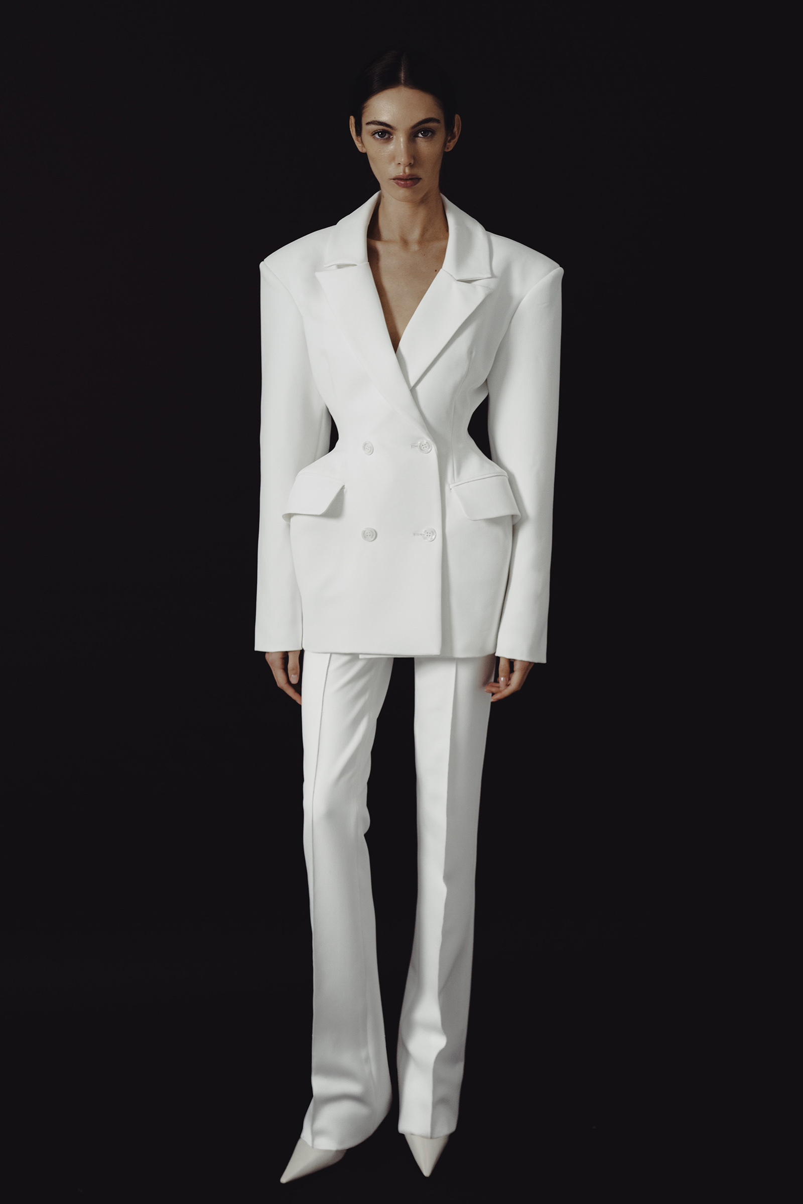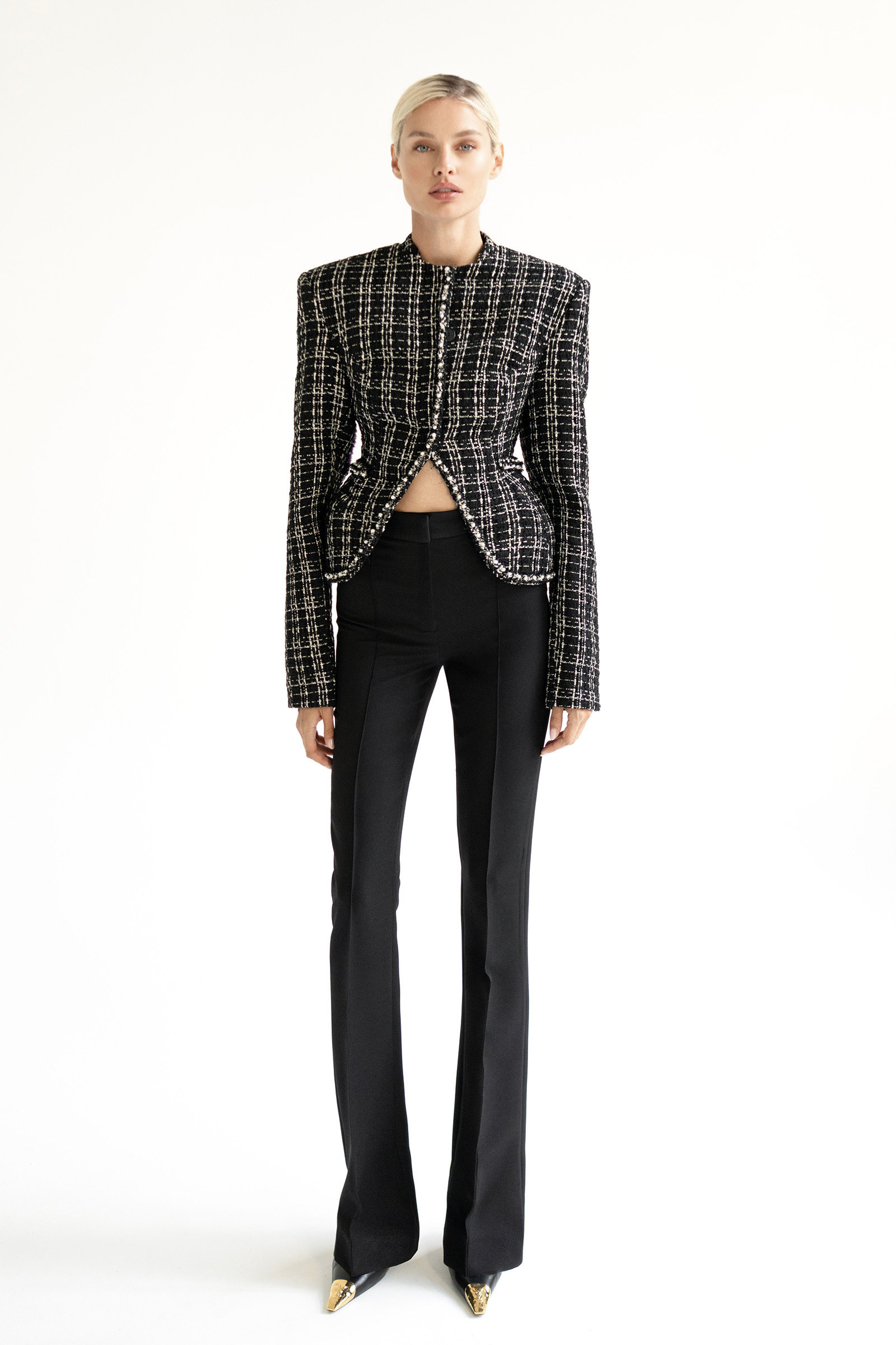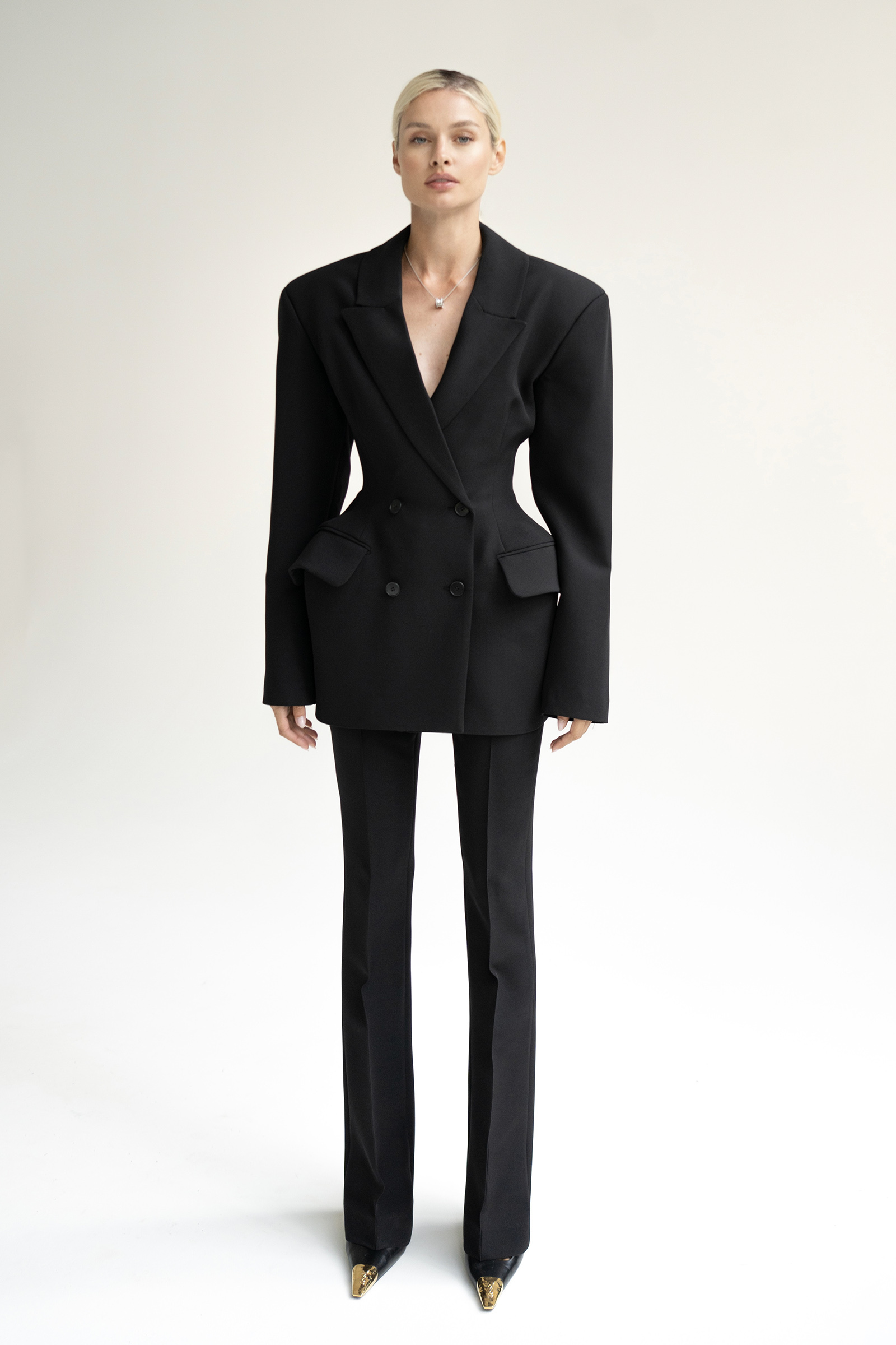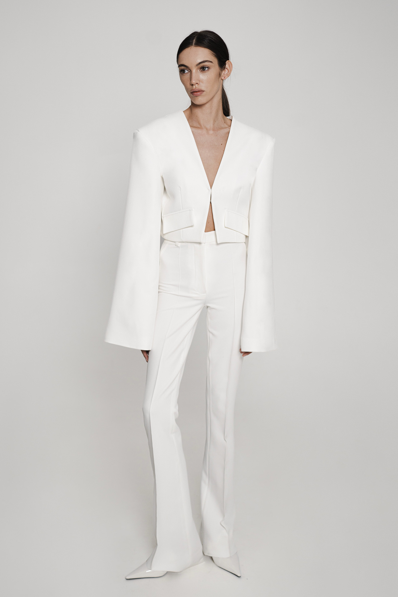 Брюки из костюмной ткани на основе вискозы с идеально выверенным кроем. Чёткие отстроченные стрелки визуально удлиняют ноги, создавая лаконичный и продуманный образ. Лёгкий клёш и высокая посадка подчёркивают силуэт.