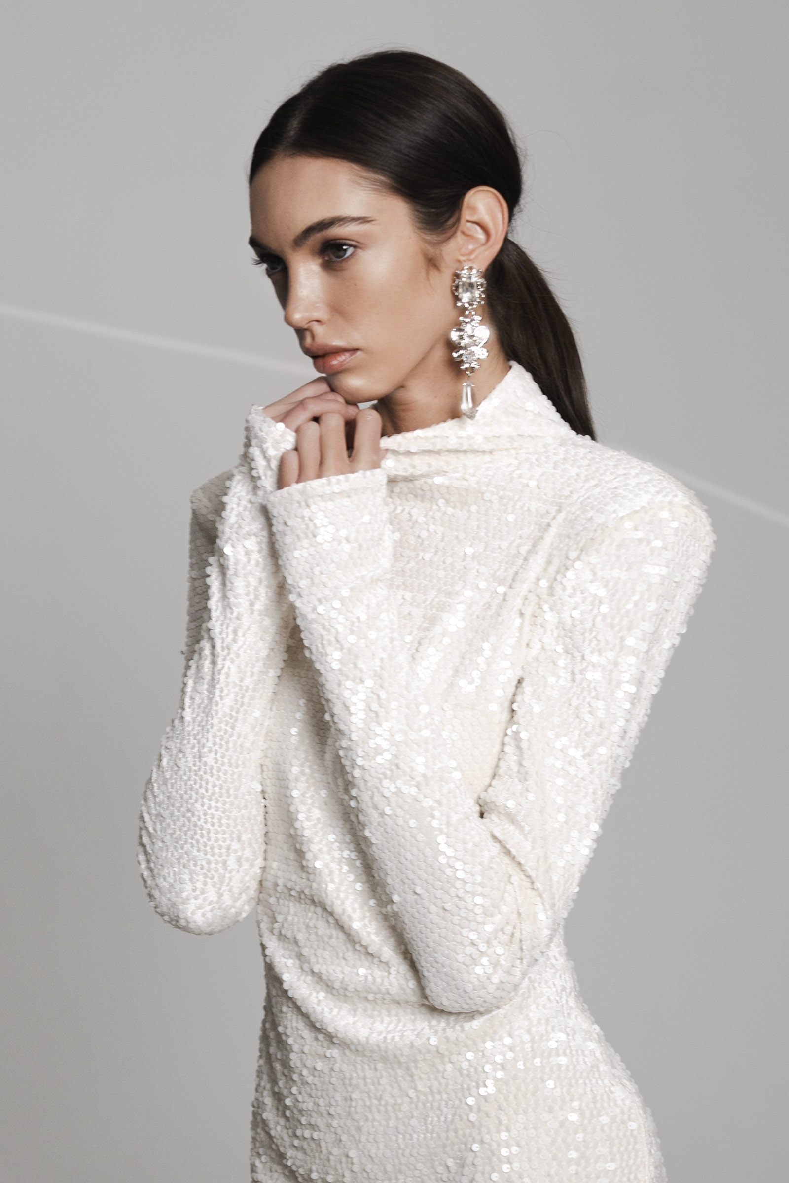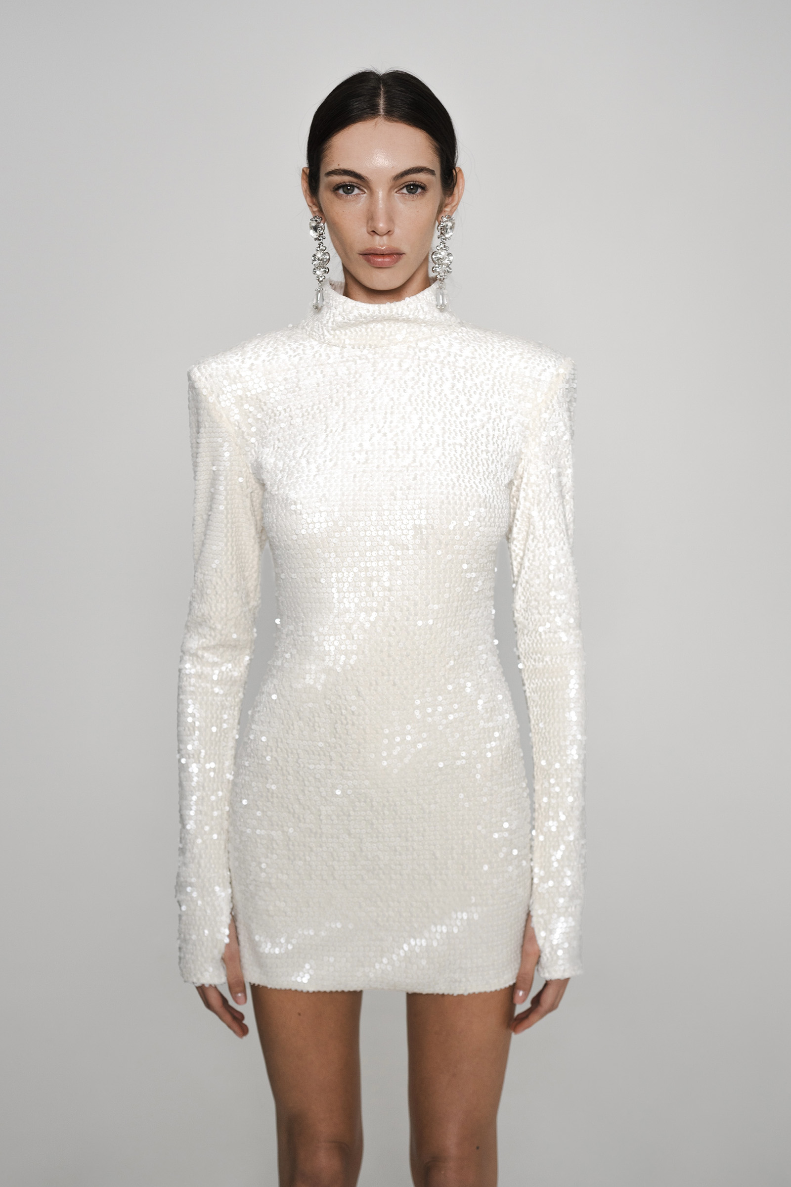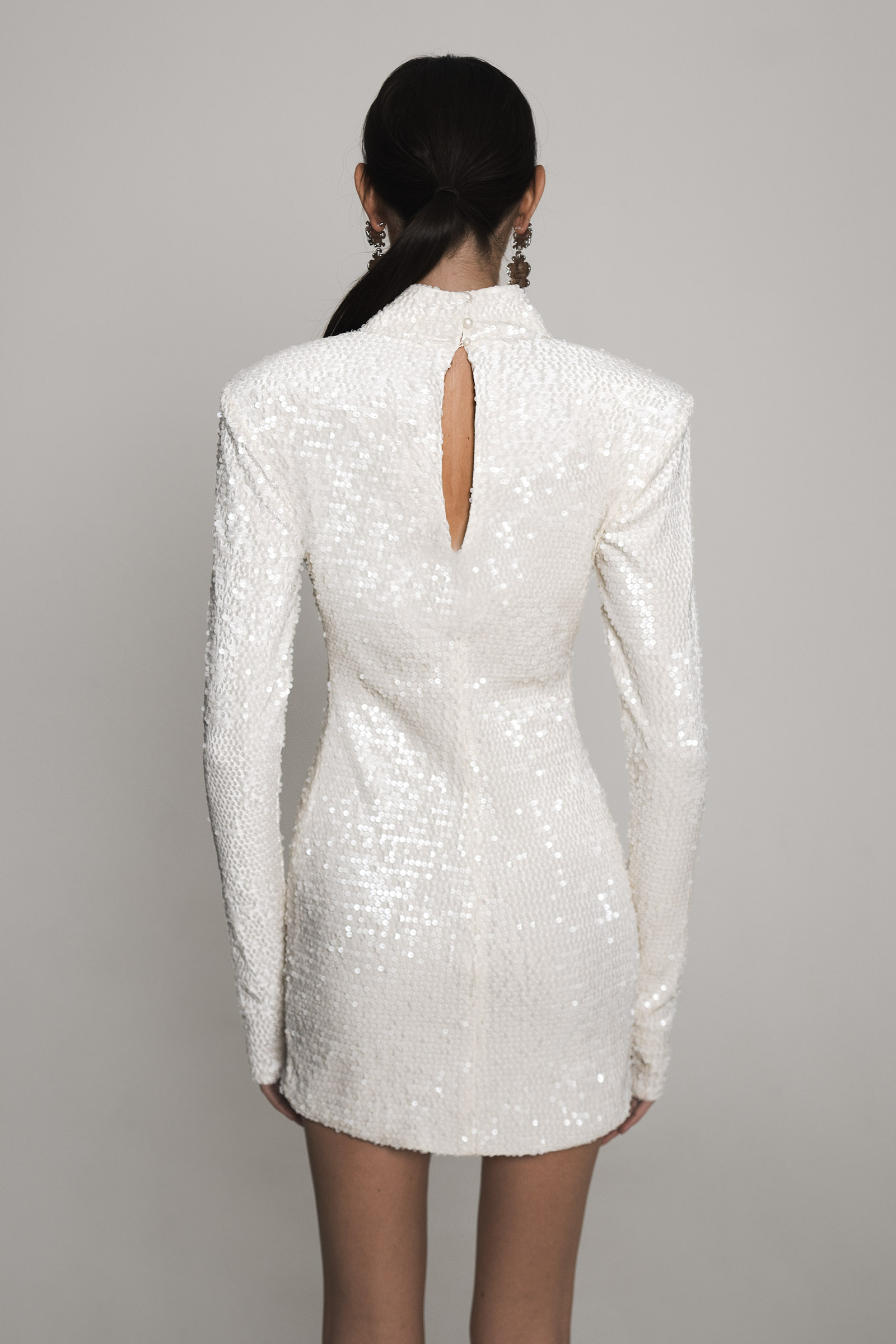Облегающее платье-мини с высоким горлом выполнили из ткани на основе вискозы, полностью расшитой глянцевыми пайетками.