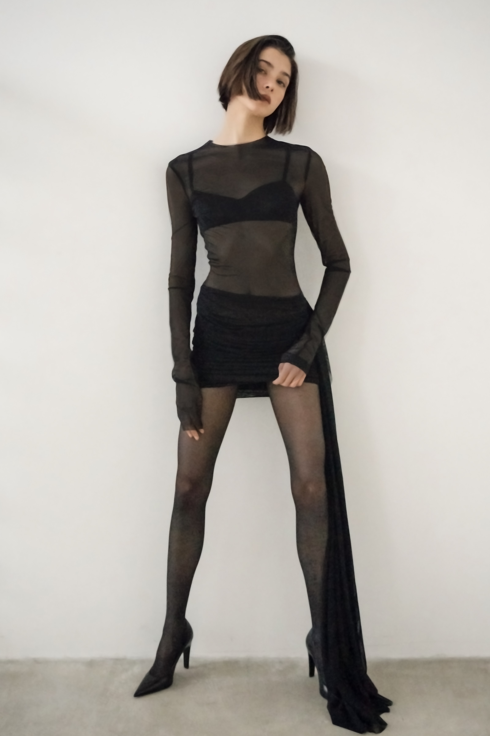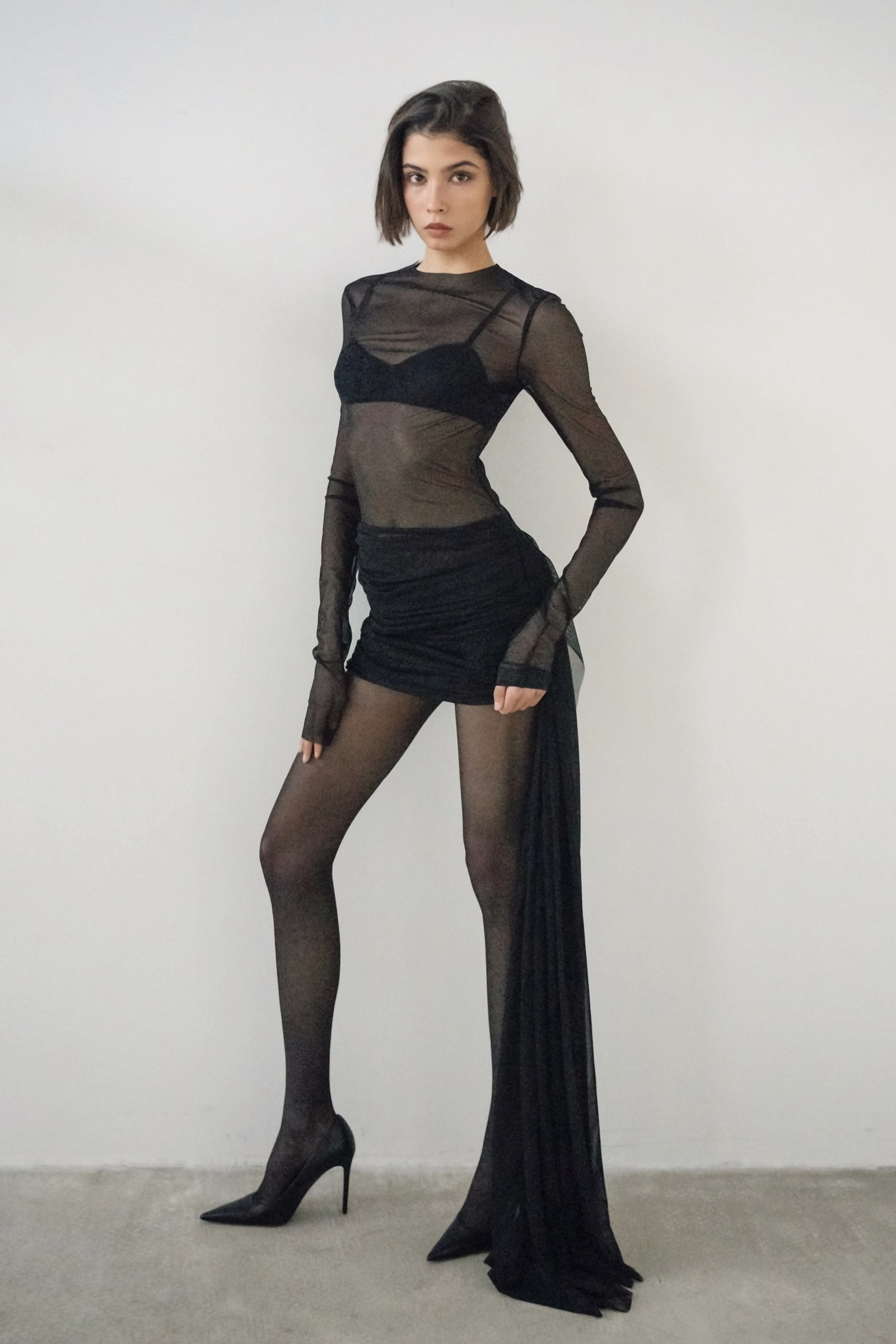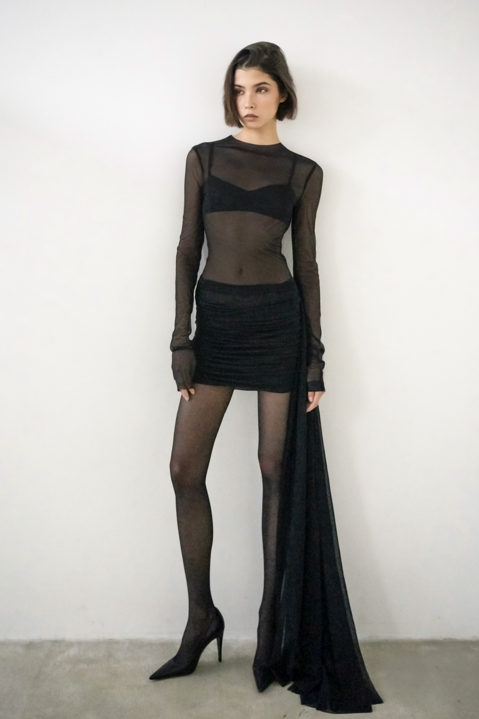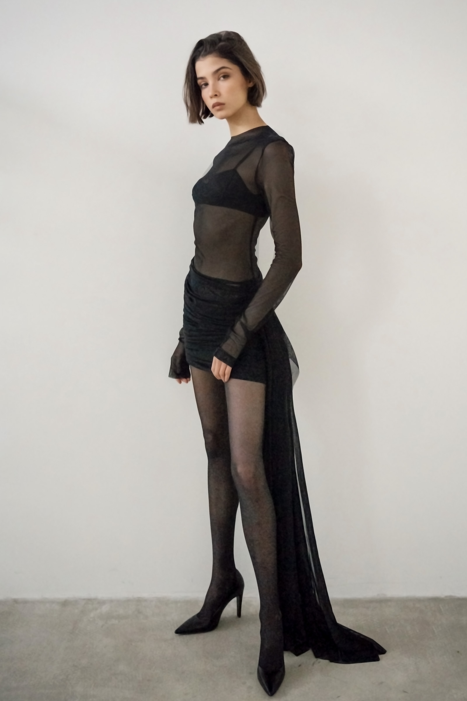 Платье-мини с мягкой асимметричной драпировкой на бедрах и длинным рукавом. Платье дополнили полупрозрачной деталью спускающейся с подола. Для пошива модели использовали легкую полупрозрачную ткань.