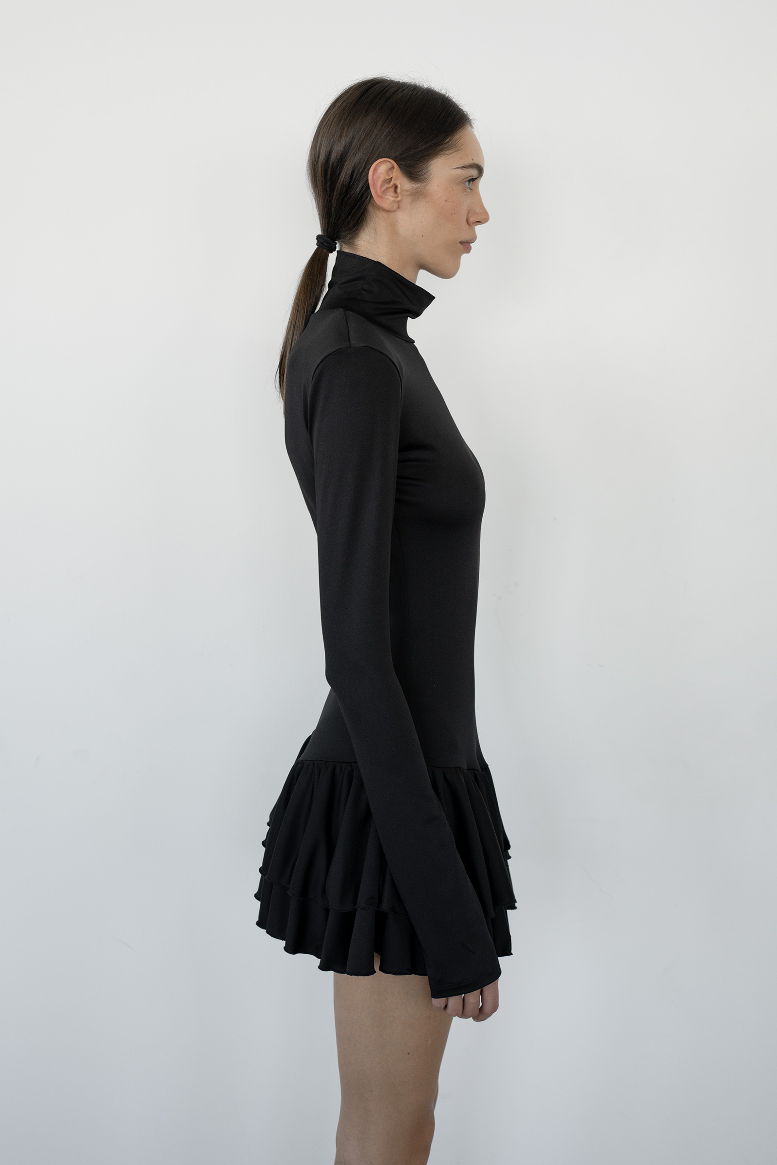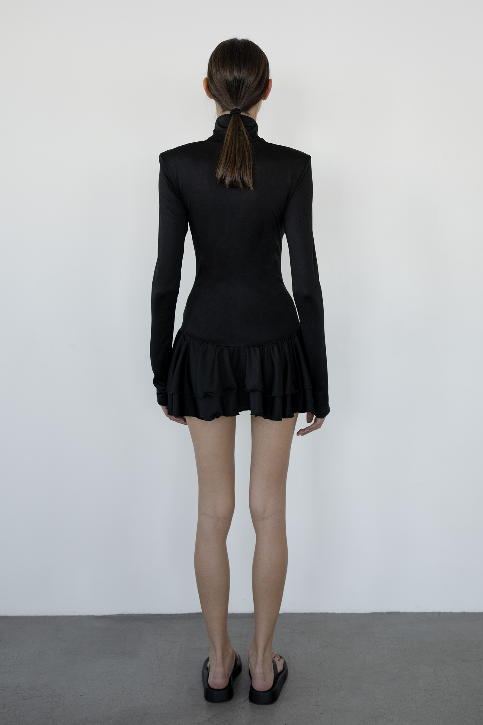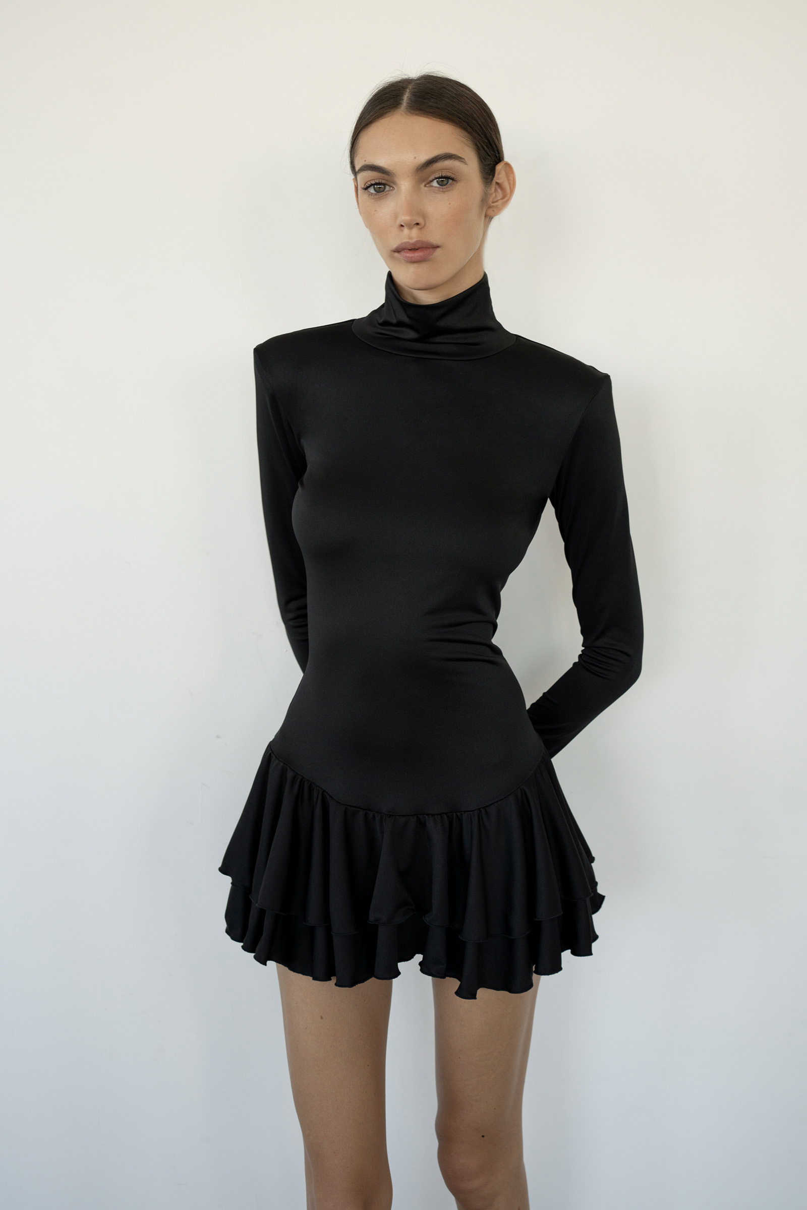Лаконичное платье-мини с акцентными плечами и высоким горлом. Модель дополнили расклешенным двухярусным подолом. Для создания платья использовали эластичный материал на основе вискозы.