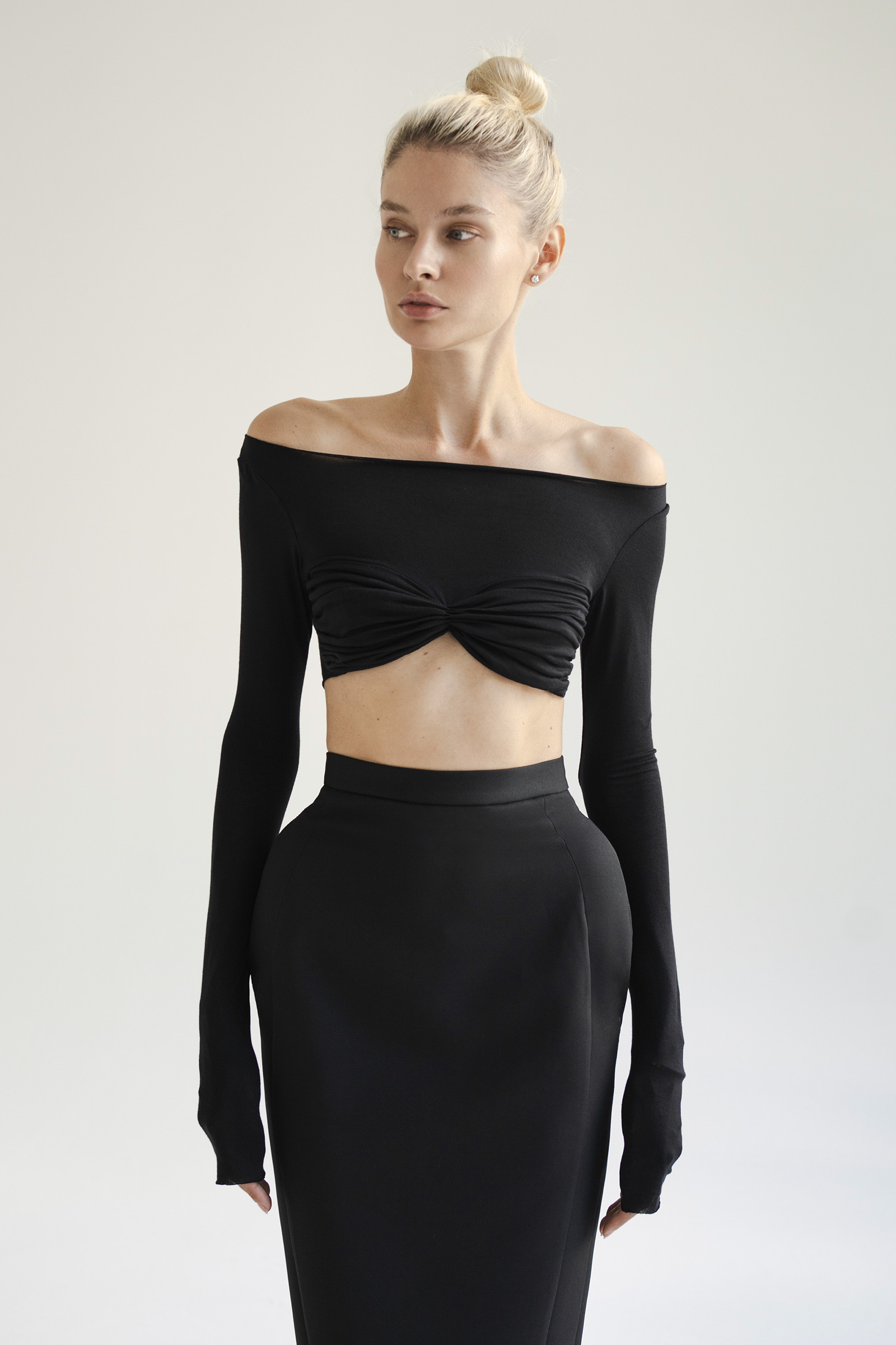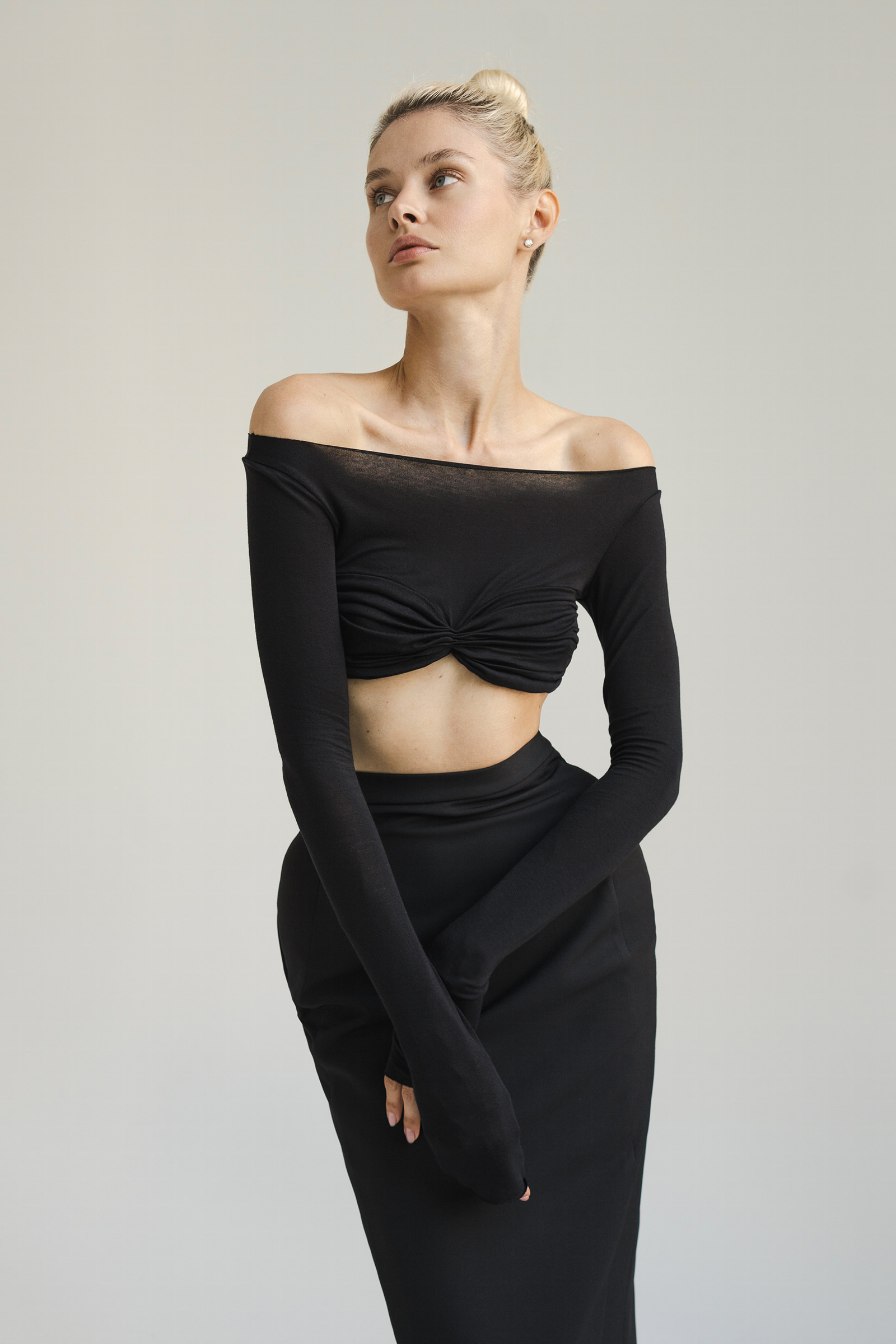 Нежный, трикотажный топ с открытыми плечами. На груди сборка ручной работы и удлиненные, легкие рукава.