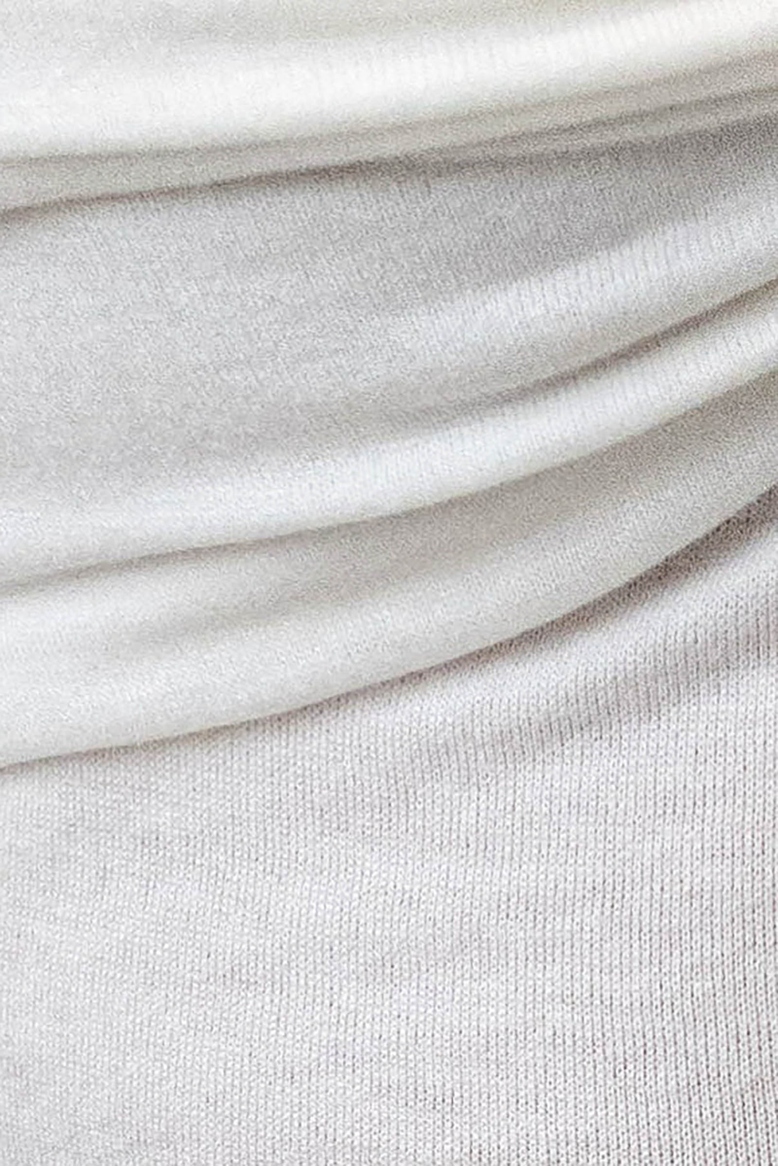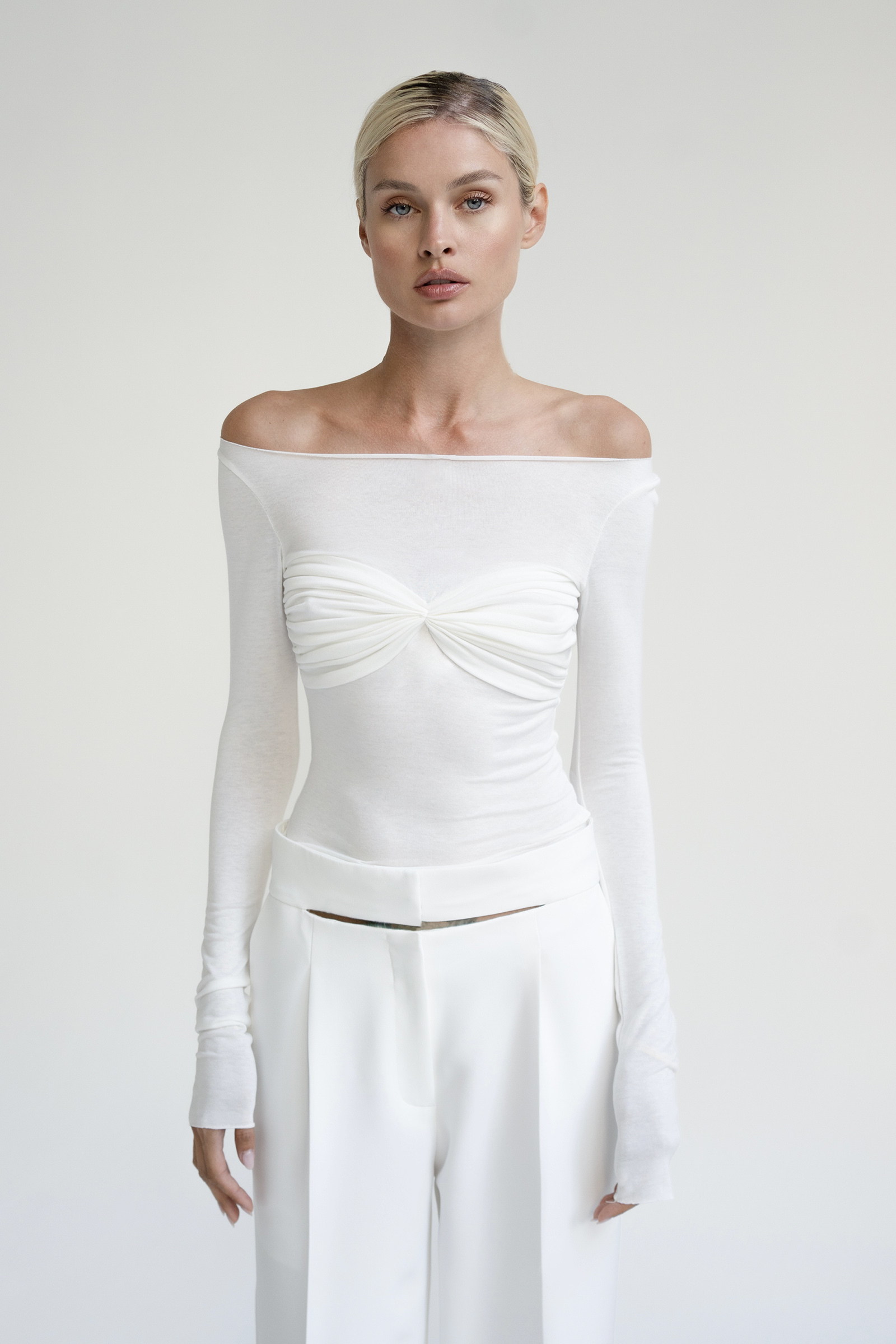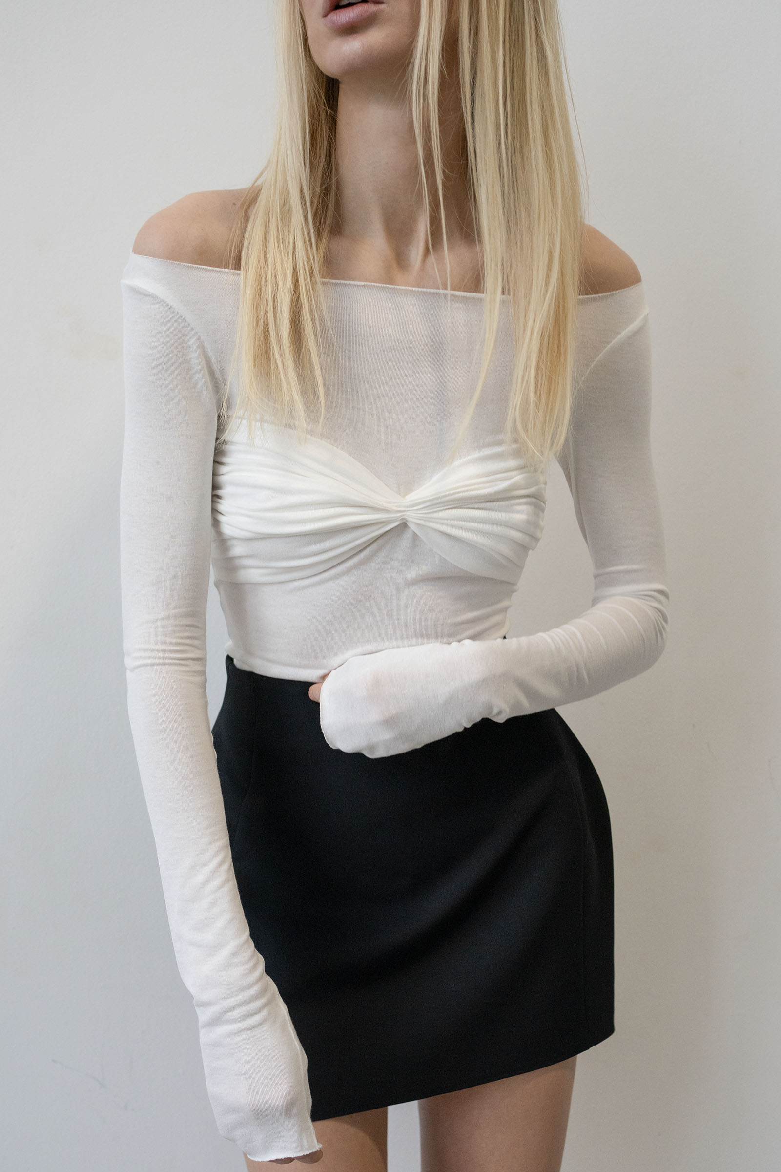 Нежный, трикотажный топ с открытыми плечами. На груди сборка ручной работы и удлиненные, легкие рукава.