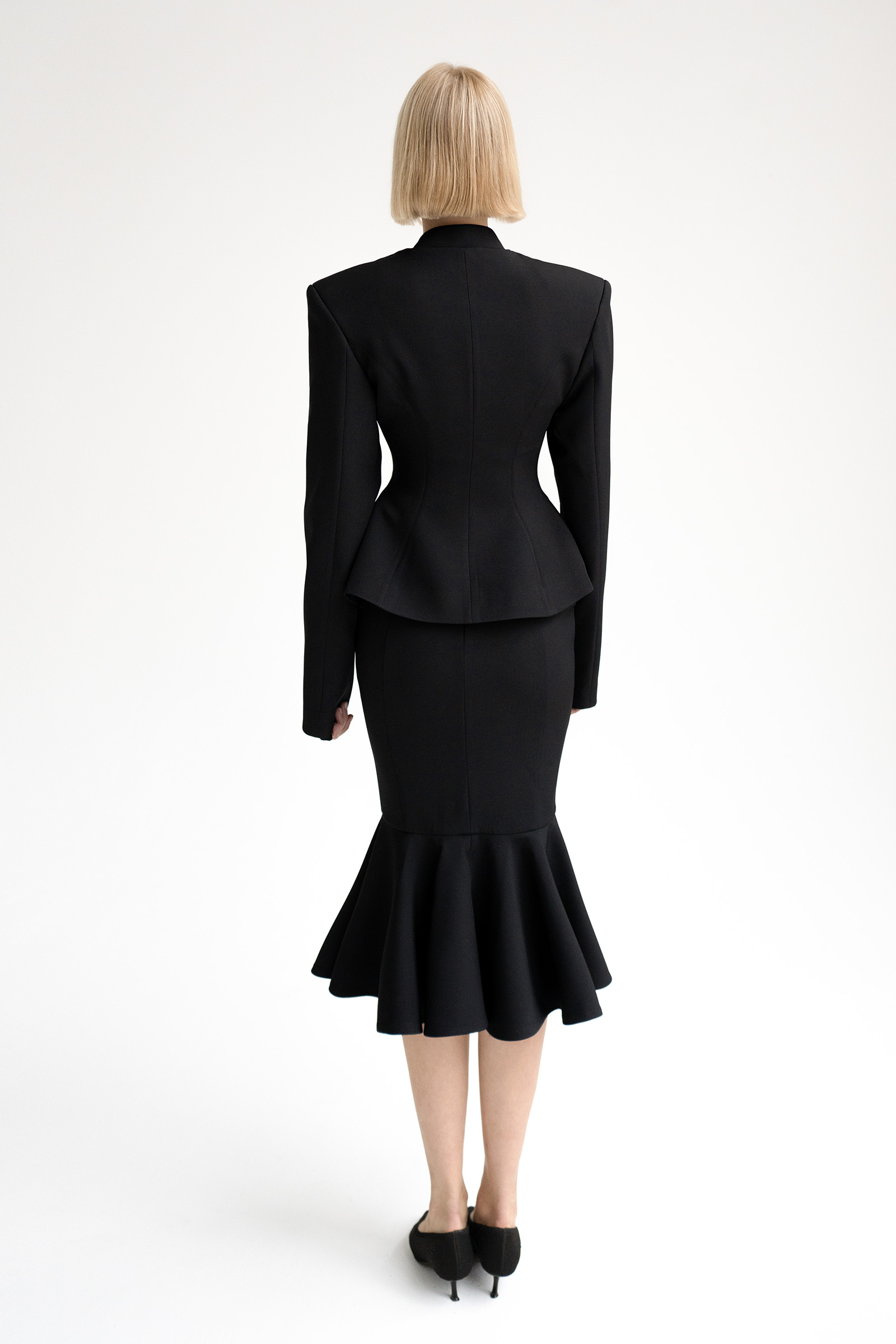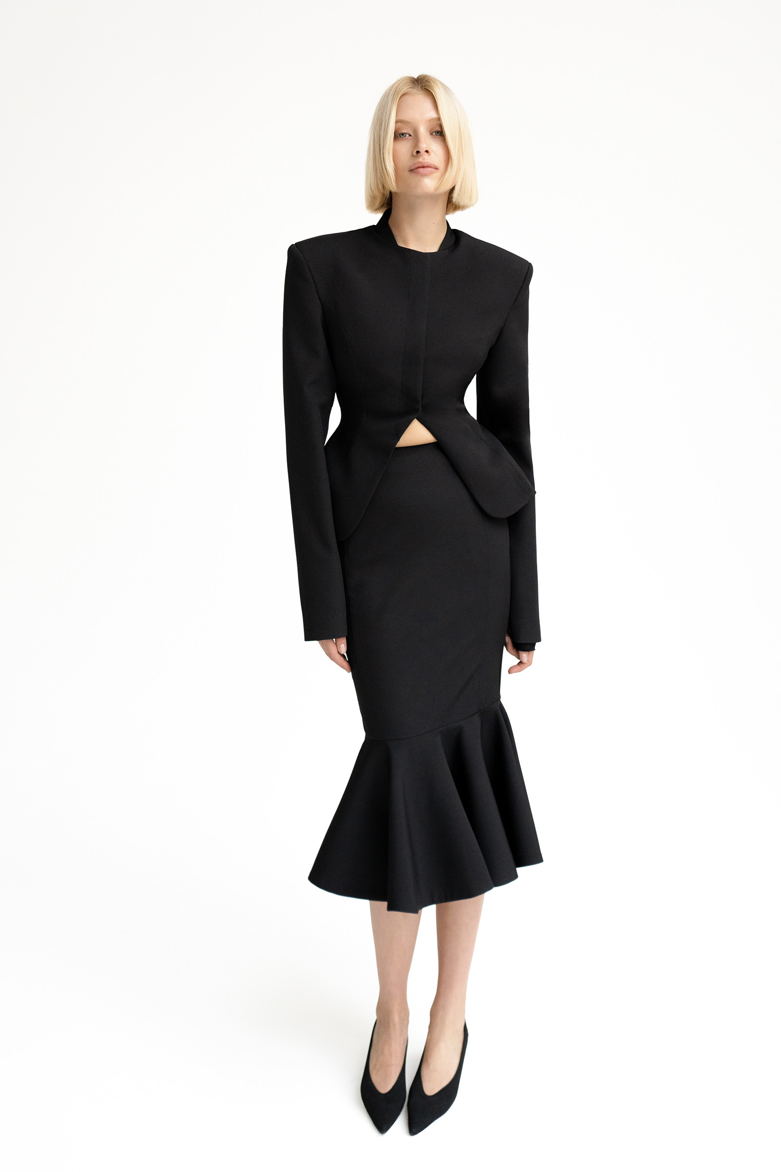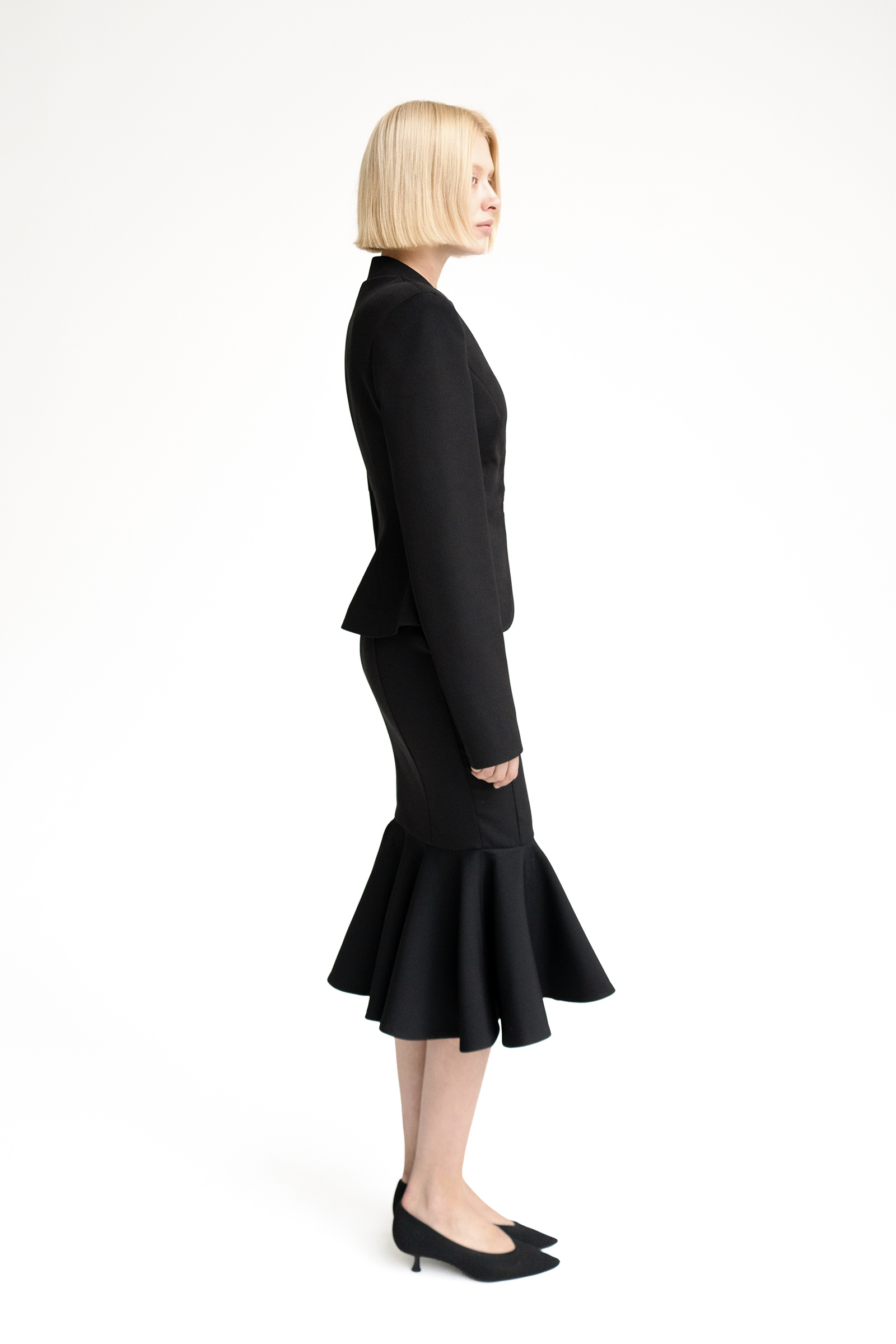 Юбка годе с рельефными швами выполнена из костюмной ткани. Модель с клиновидной кокеткой дополнена двумя карманами.