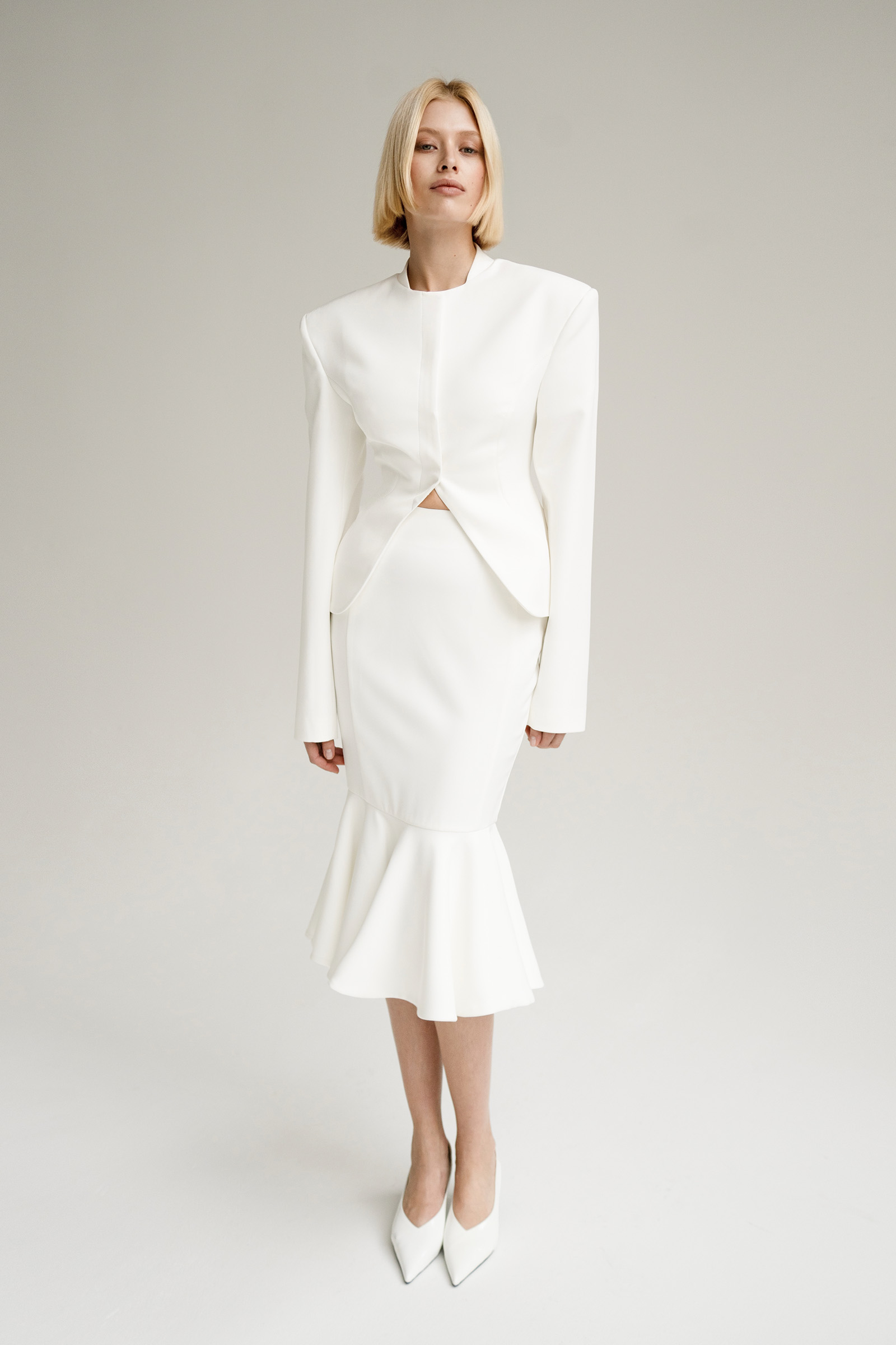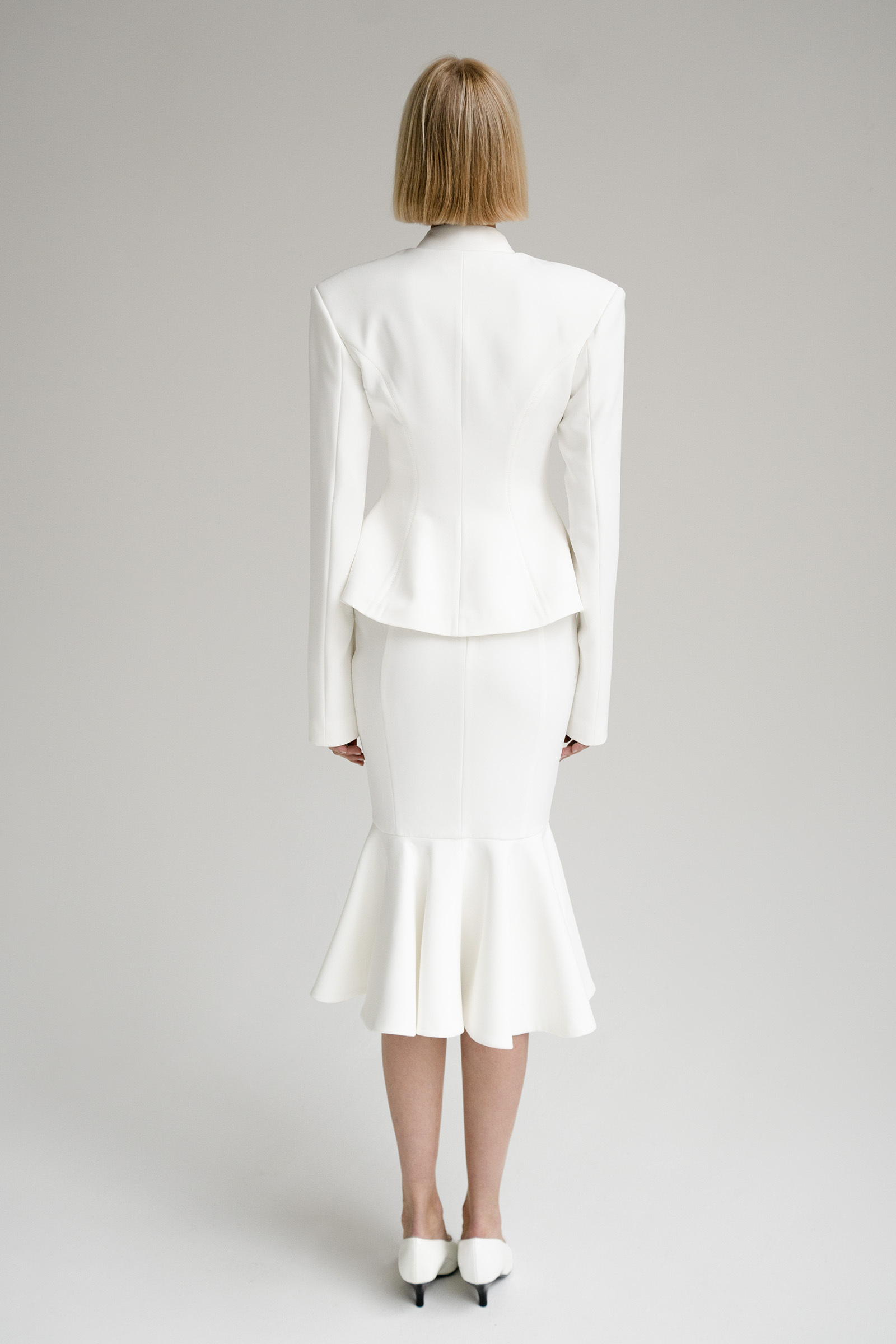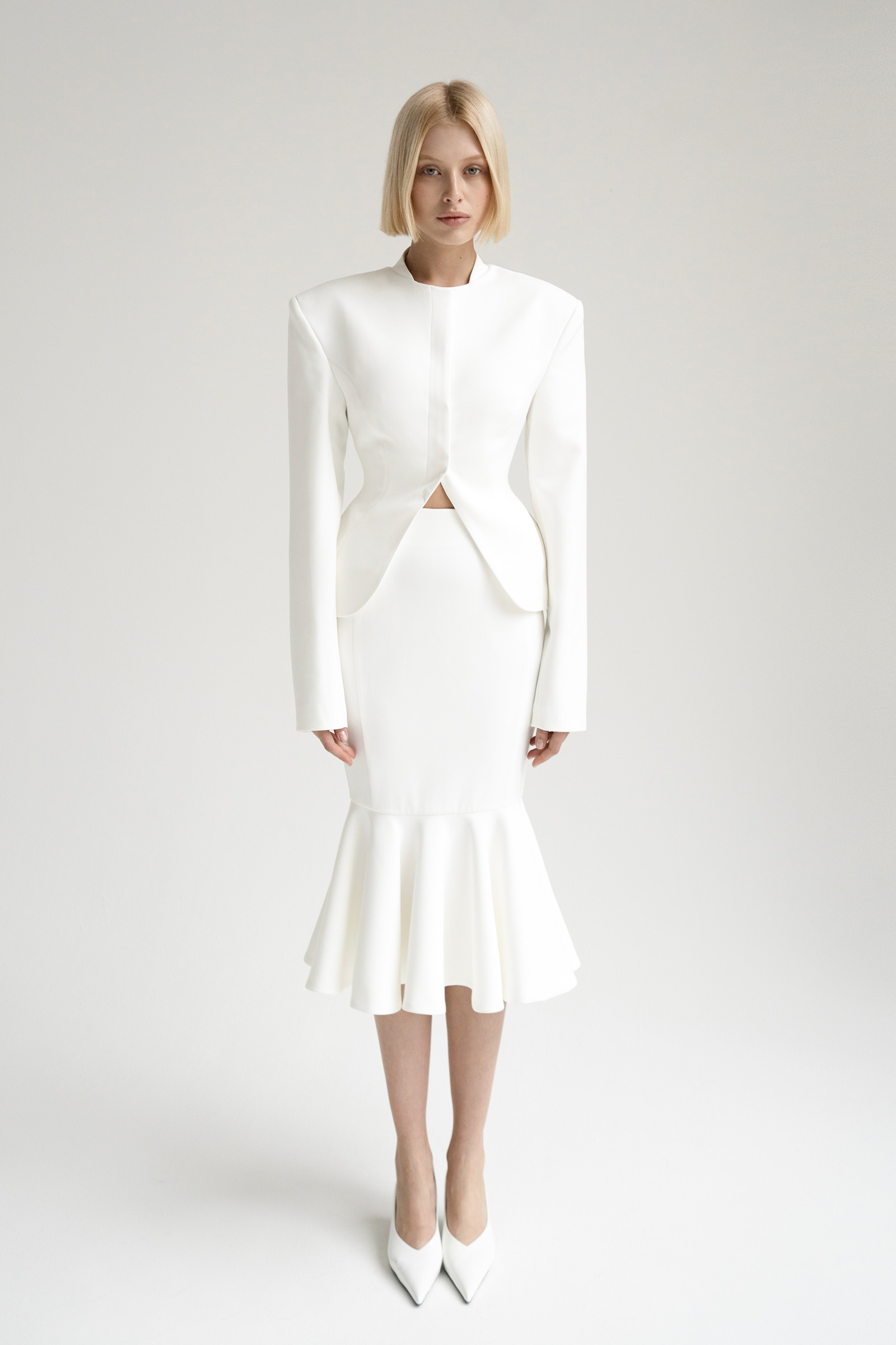 Юбка годе с рельефными швами выполнена из костюмной ткани. Модель с клиновидной кокеткой дополнена двумя карманами.