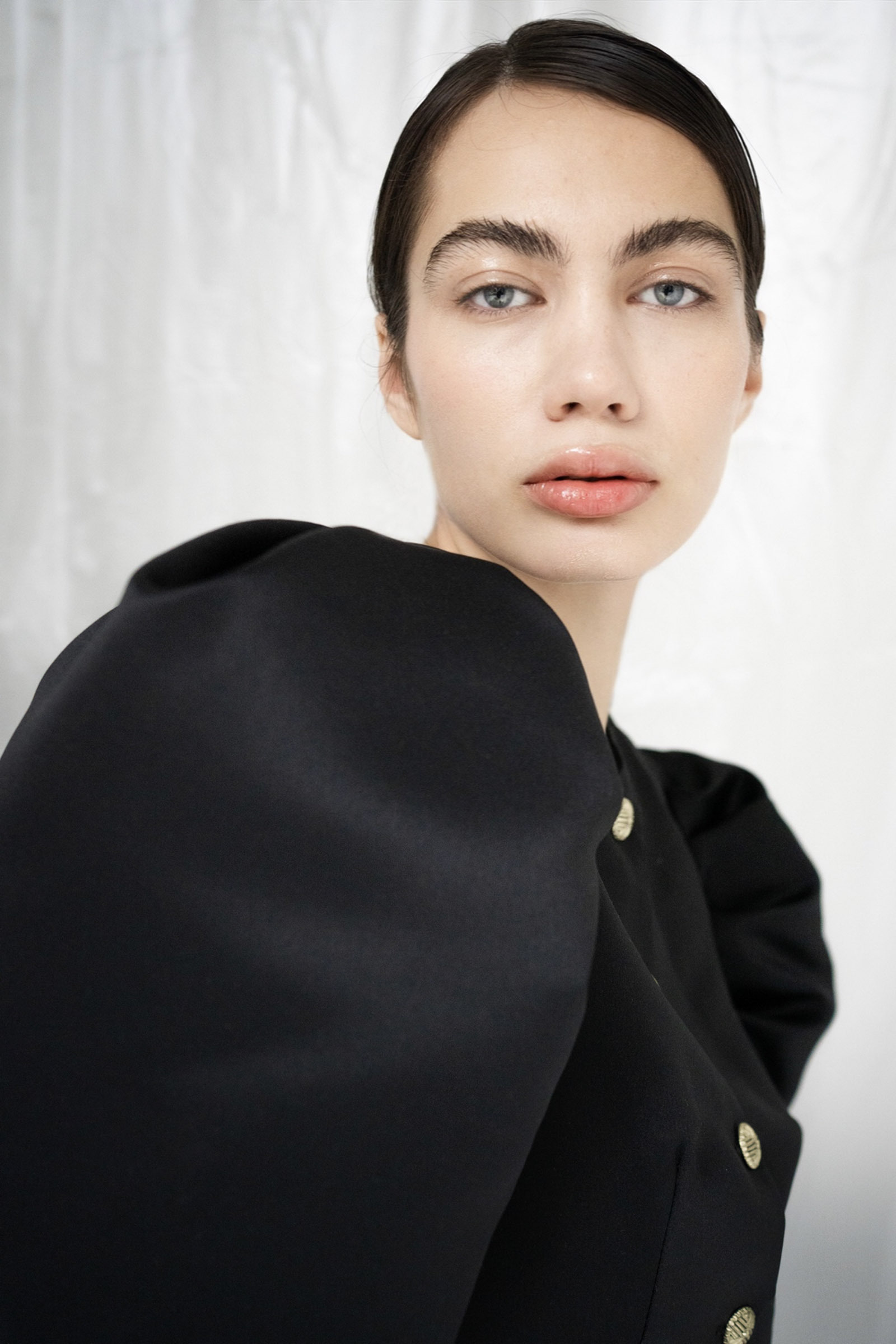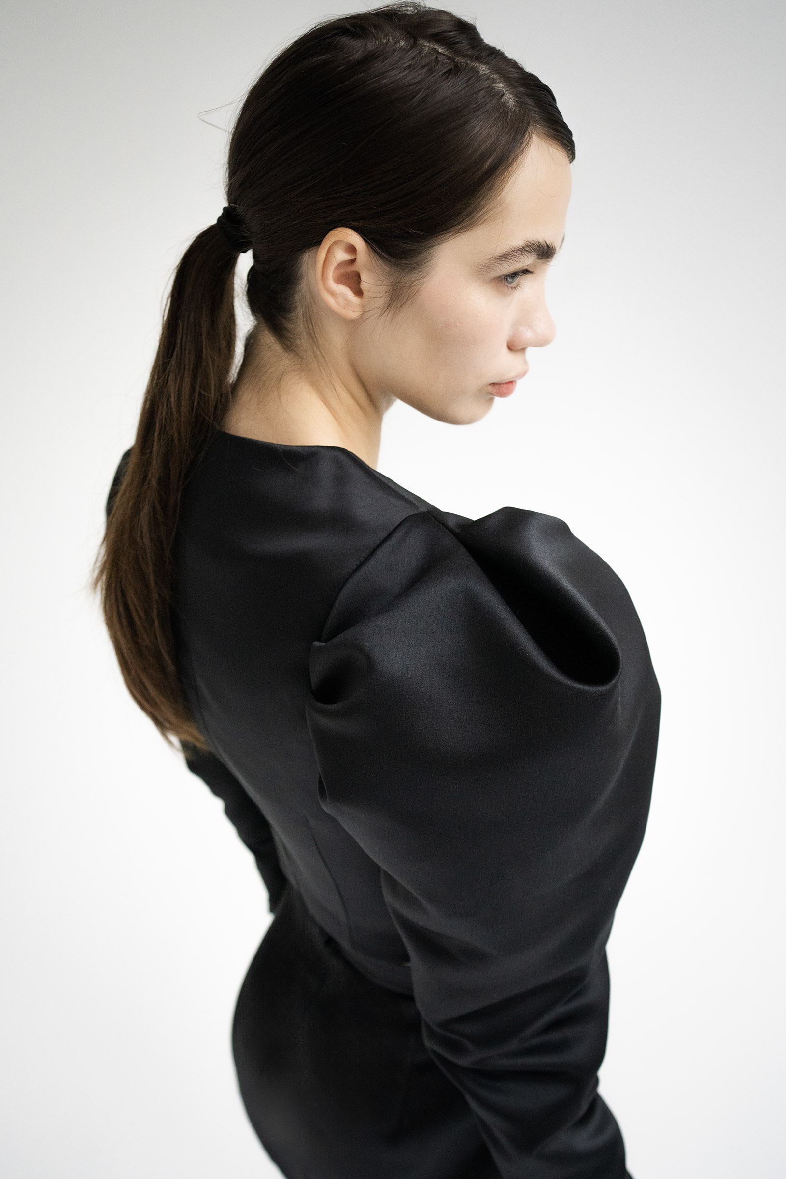 Укороченный жакет c пышными рукавами и сборкой. Изделие застегивается на пуговицы. Модель выполнили из плотного атласа. Жакет идеально сочетается с юбкой Anora из нашей коллекции.