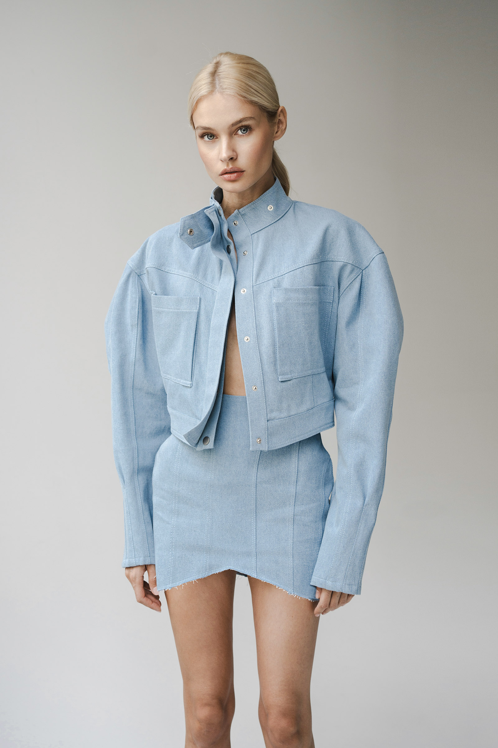 A cropped denim jacket with voluminous sleeves and a high collar. The jacket fastens with snap buttons hidden under a placket. It pairs perfectly with the 10th Floor skirt from our collection.