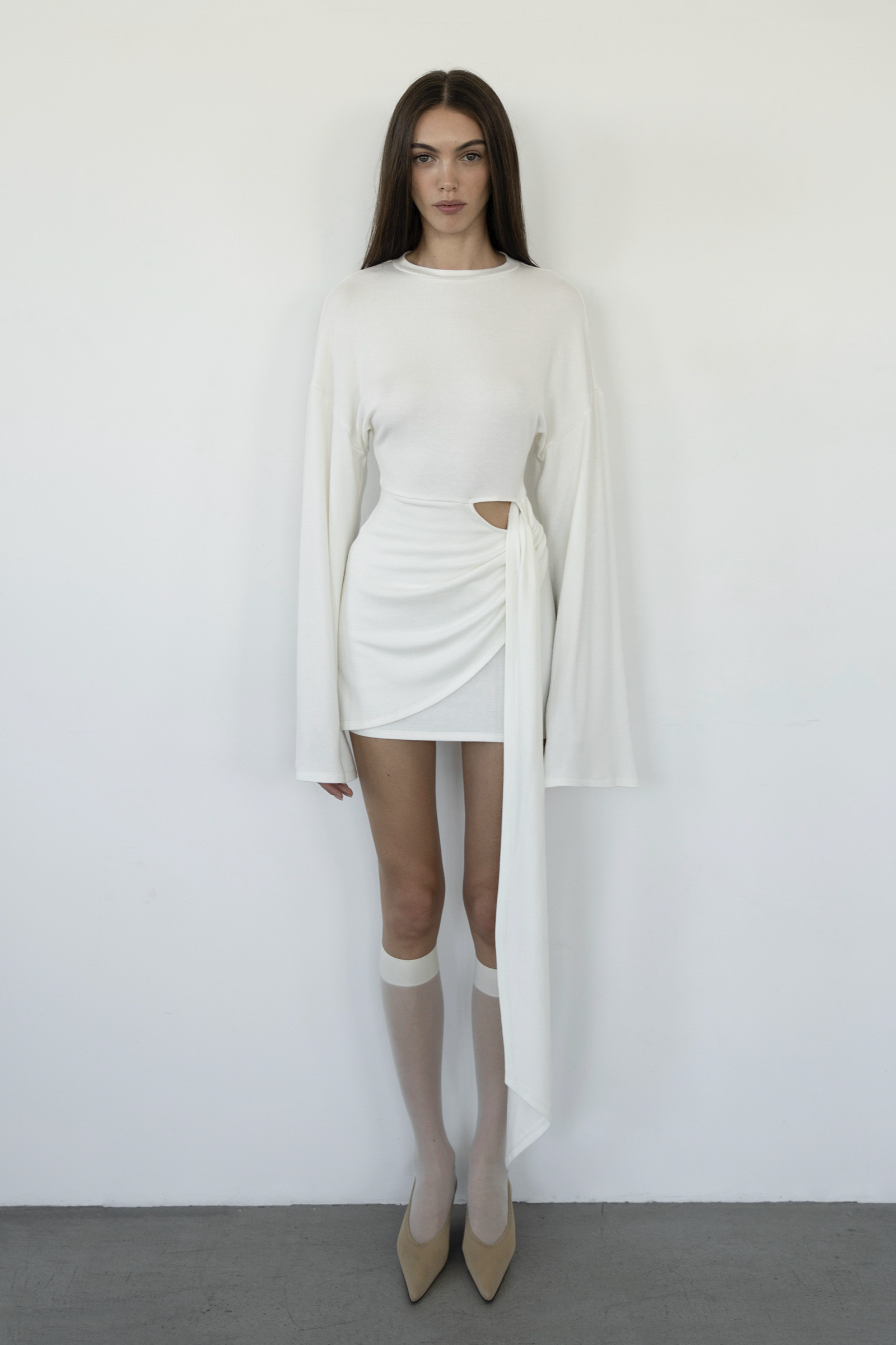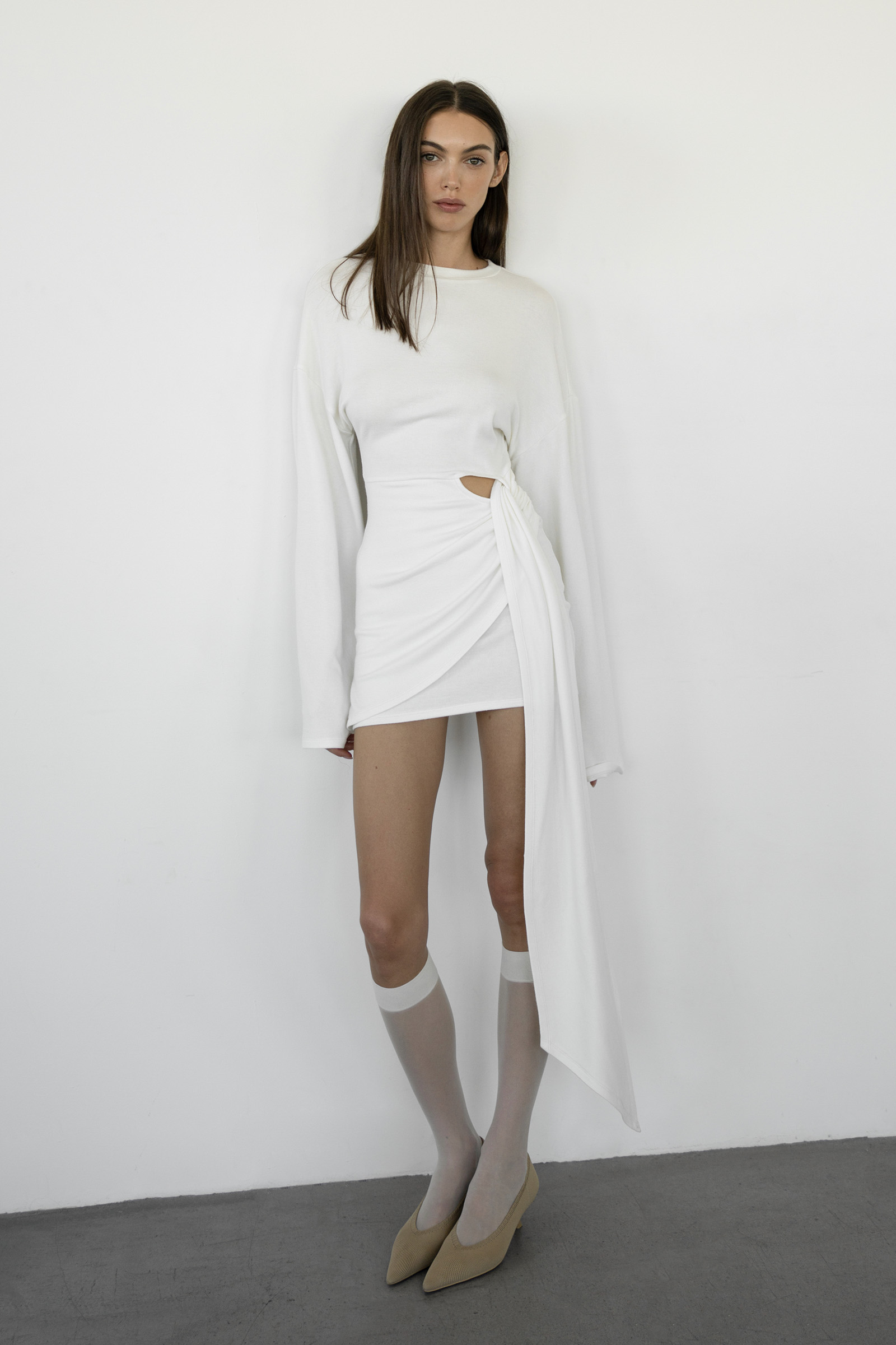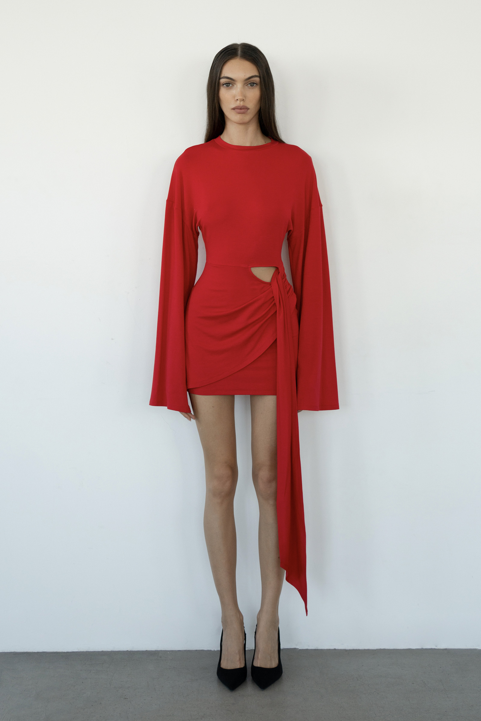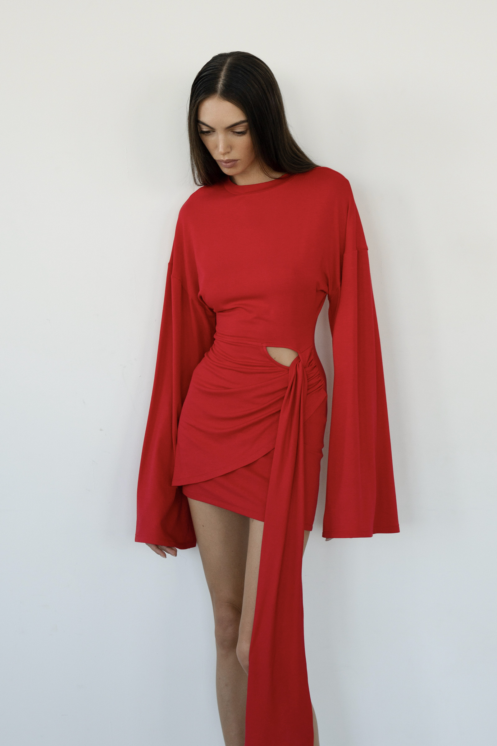A mini dress with long, flared sleeves and asymmetric draping at the hem, simulating a knotted effect with cascading folds. The dress is sewn from soft viscose knitwear.