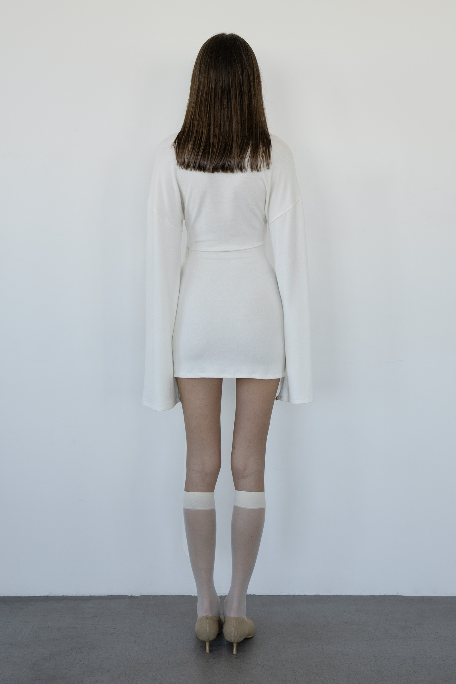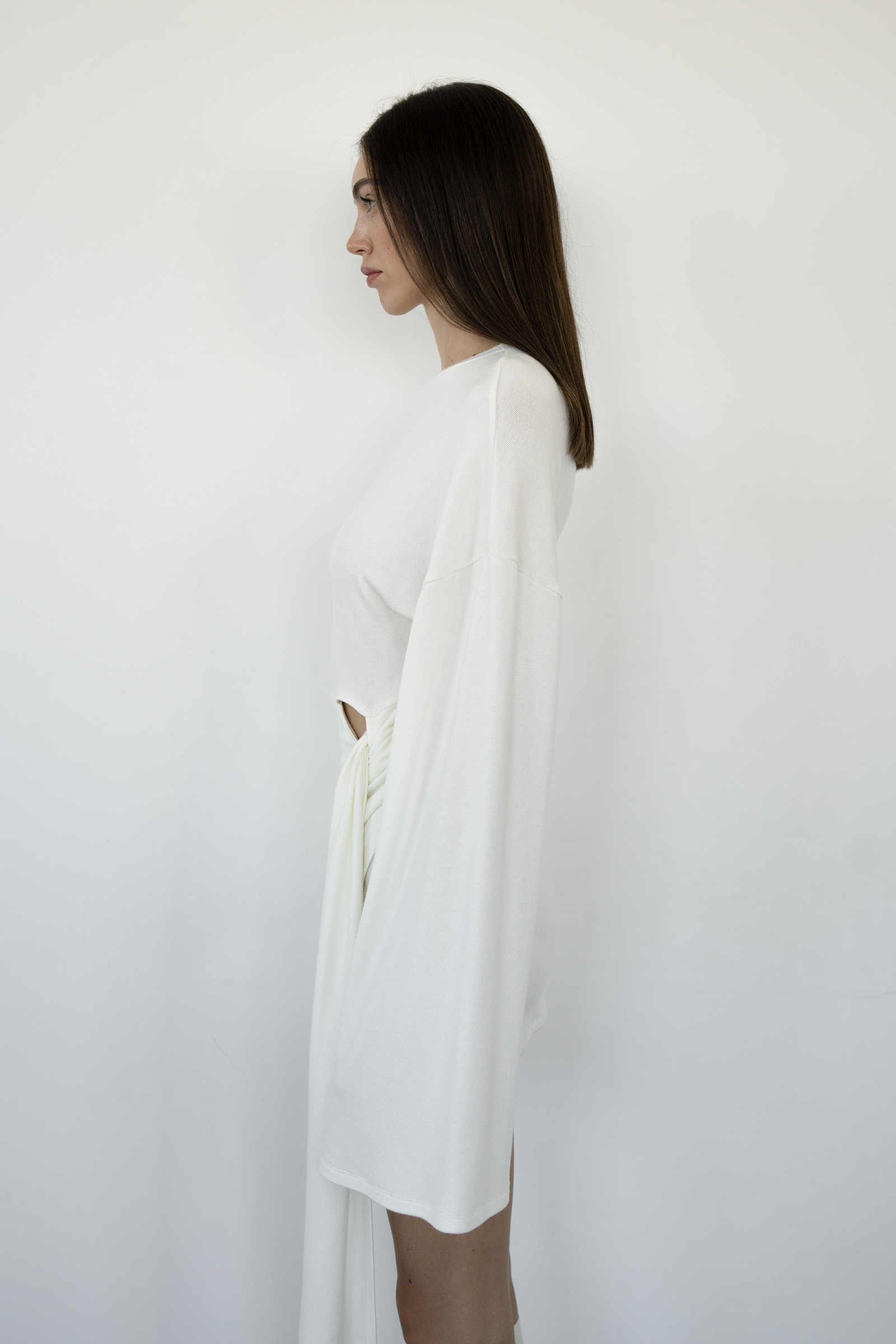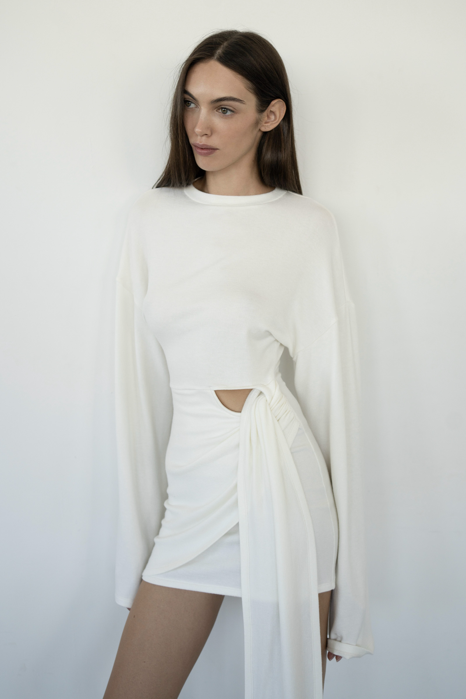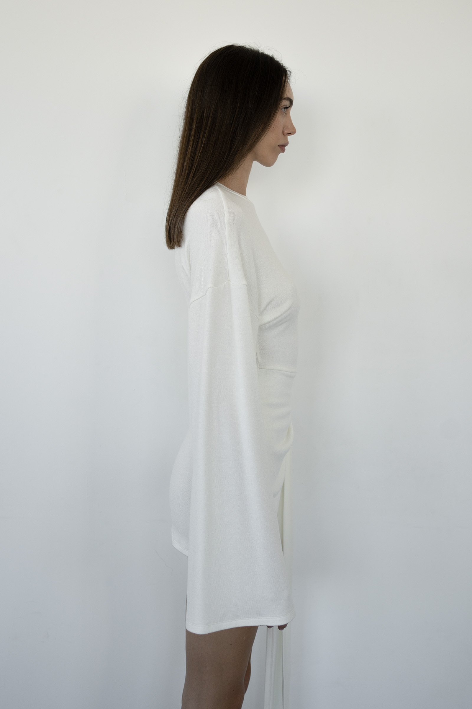 A mini dress with long, flared sleeves and asymmetric draping at the hem, simulating a knotted effect with cascading folds. The dress is sewn from soft viscose knitwear.