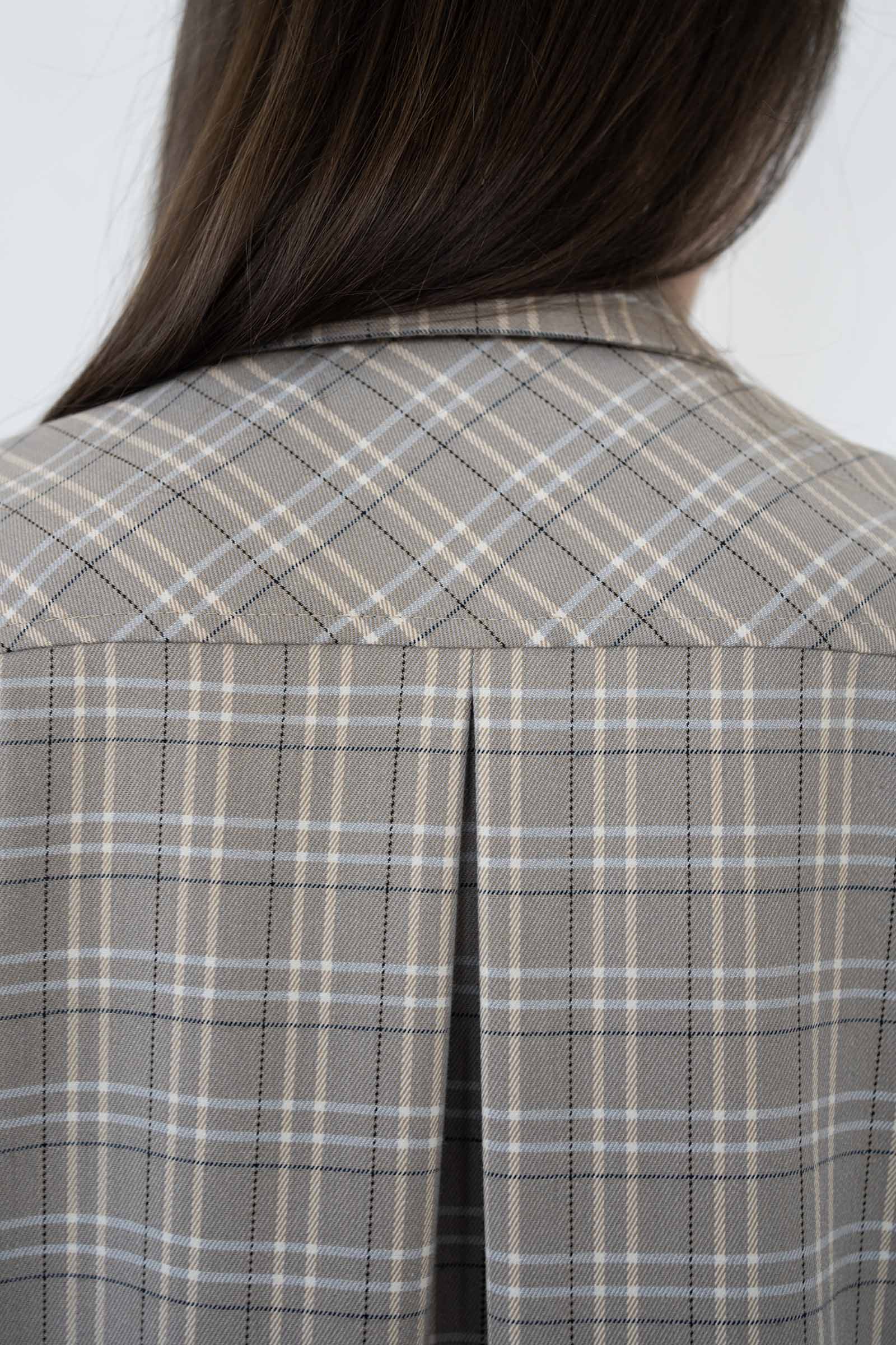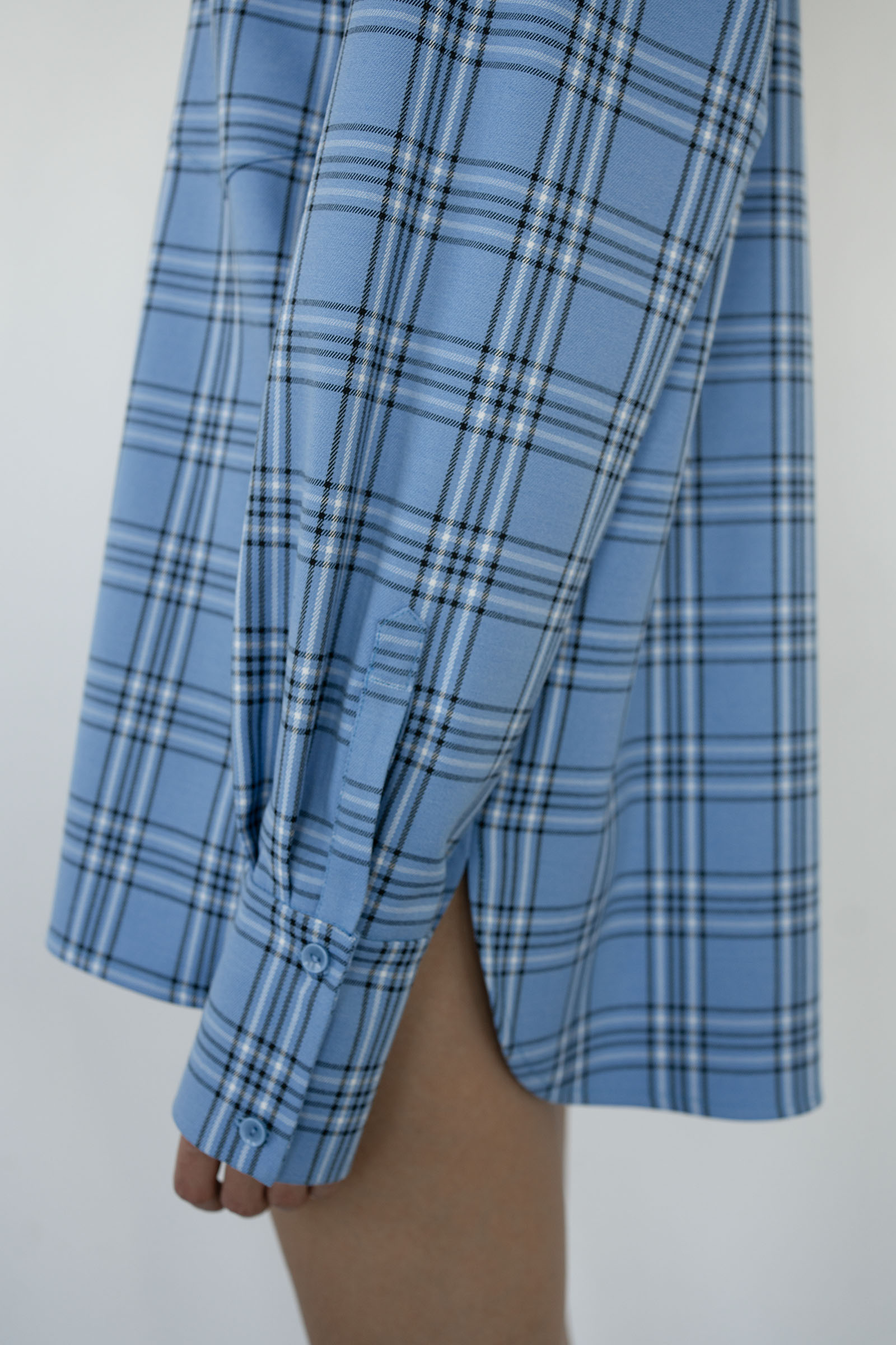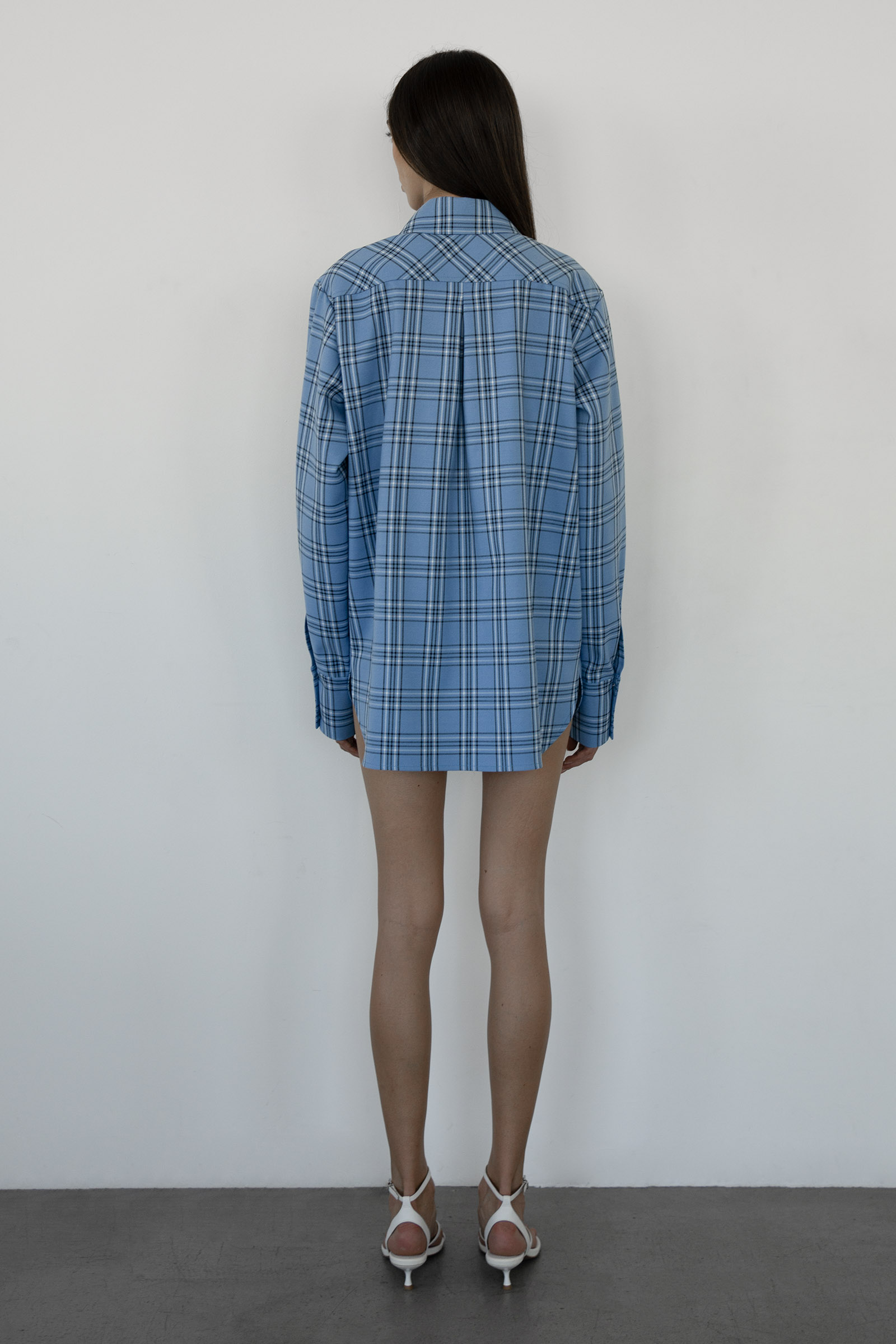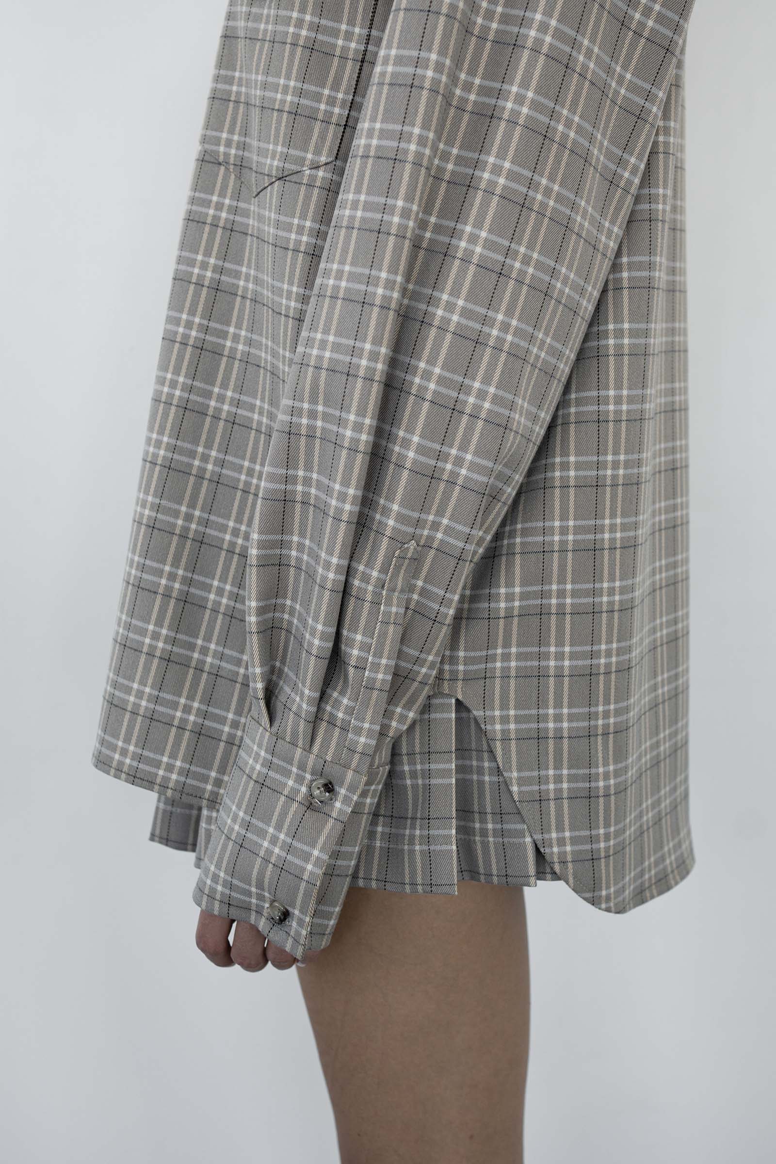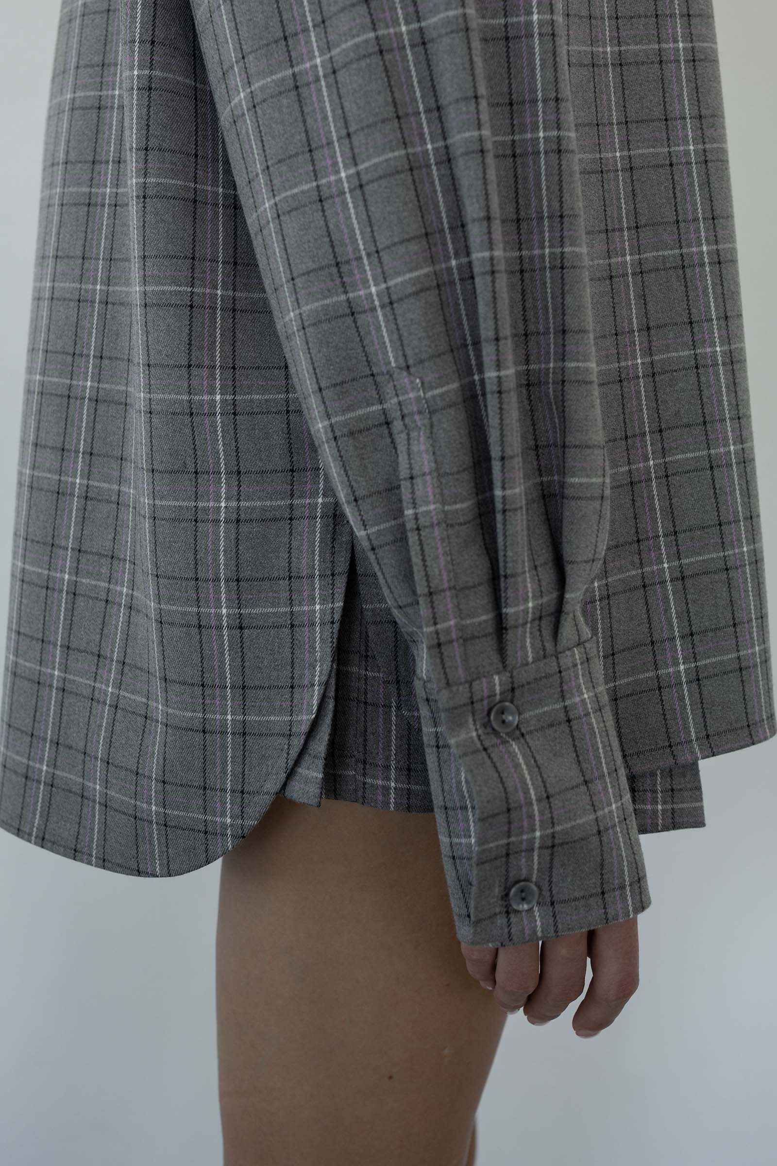 An elongated oversized shirt with side slits, made from checked cotton with viscose. The back features a box pleat and elongated cuffs.