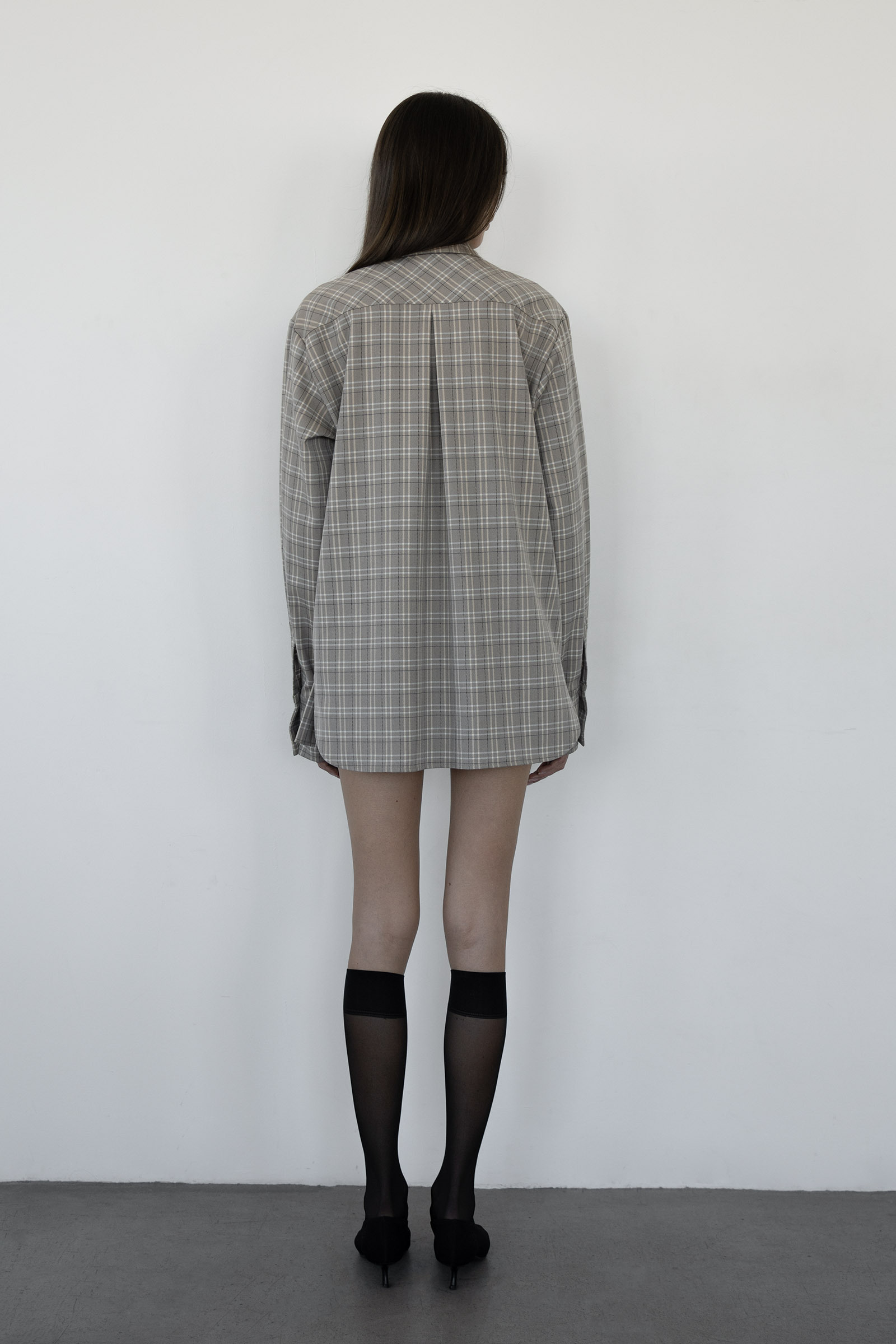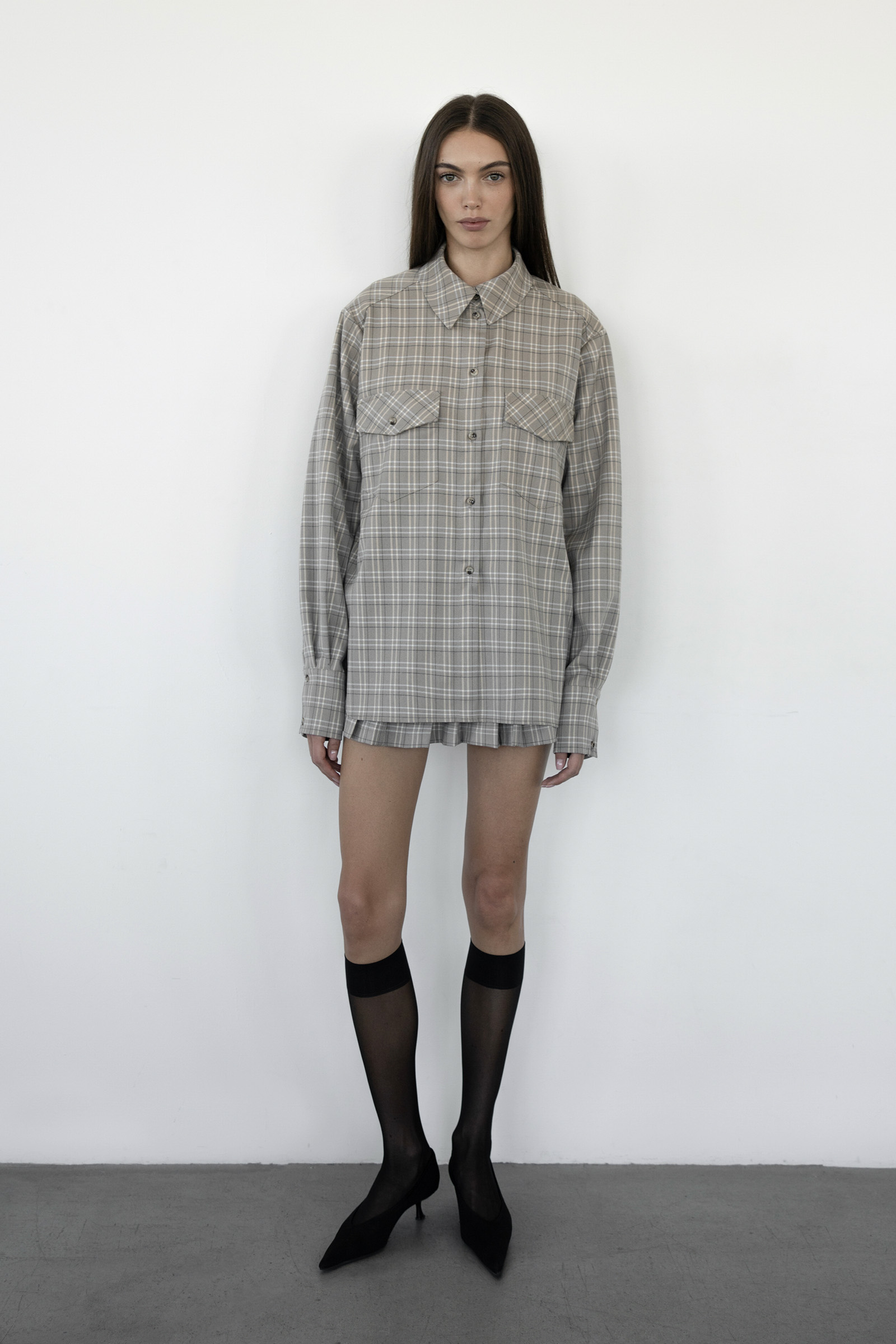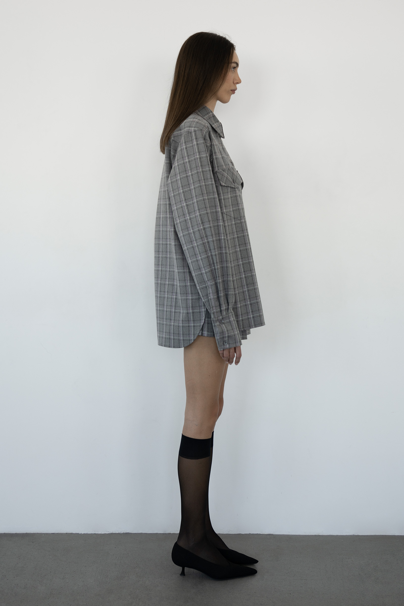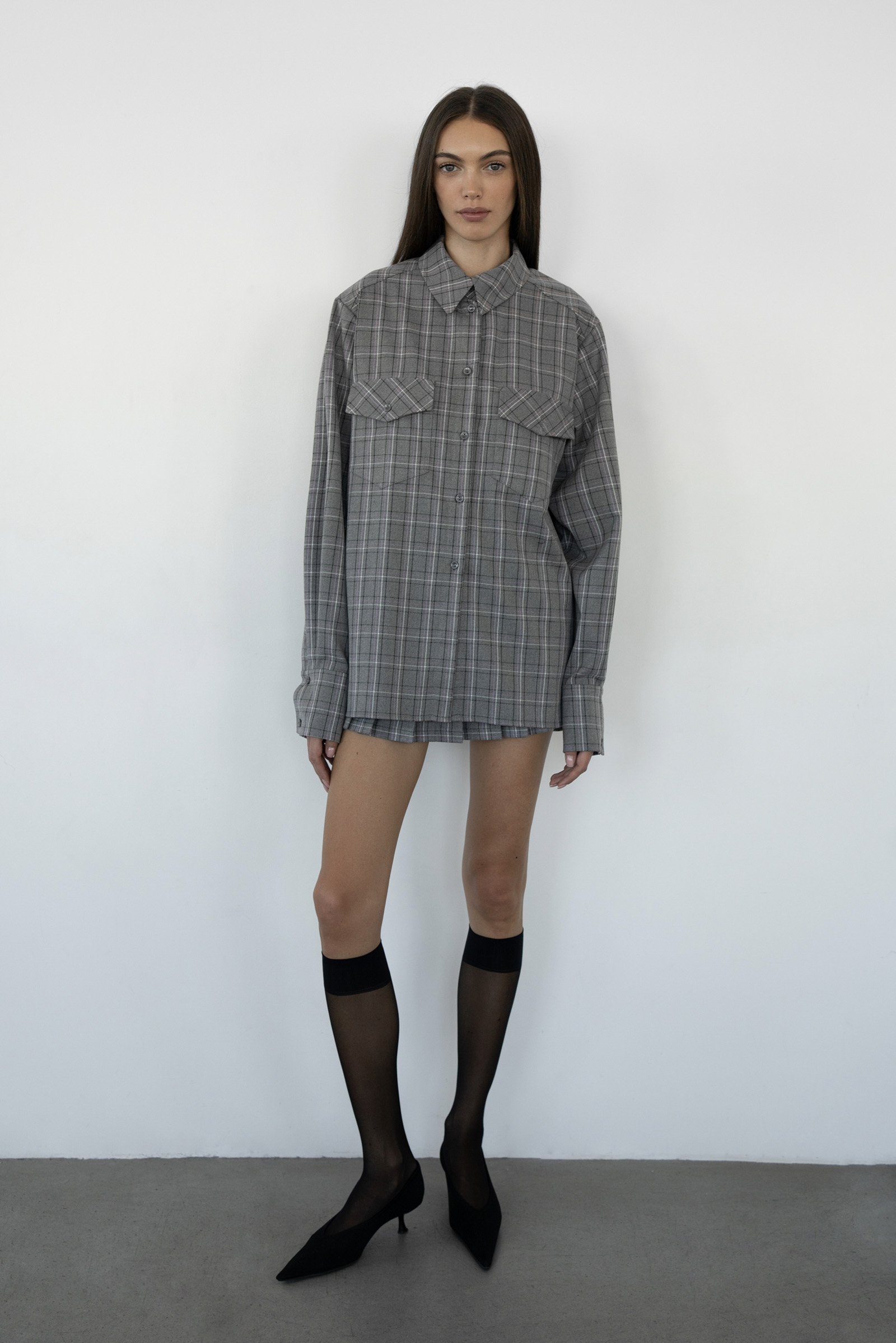 An elongated oversized shirt with side slits, made from checked cotton with viscose. The back features a box pleat and elongated cuffs.