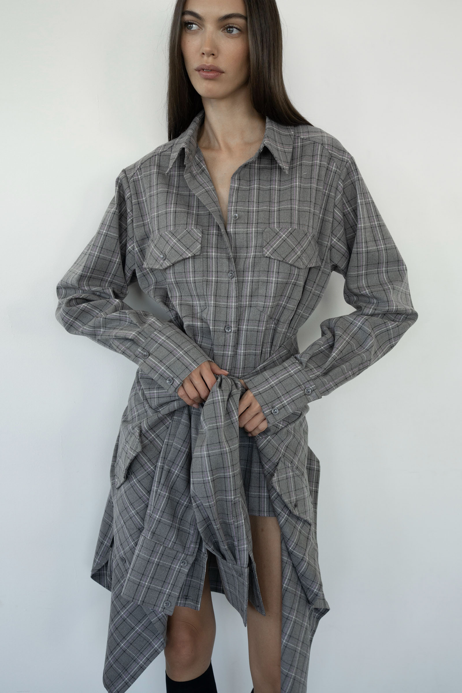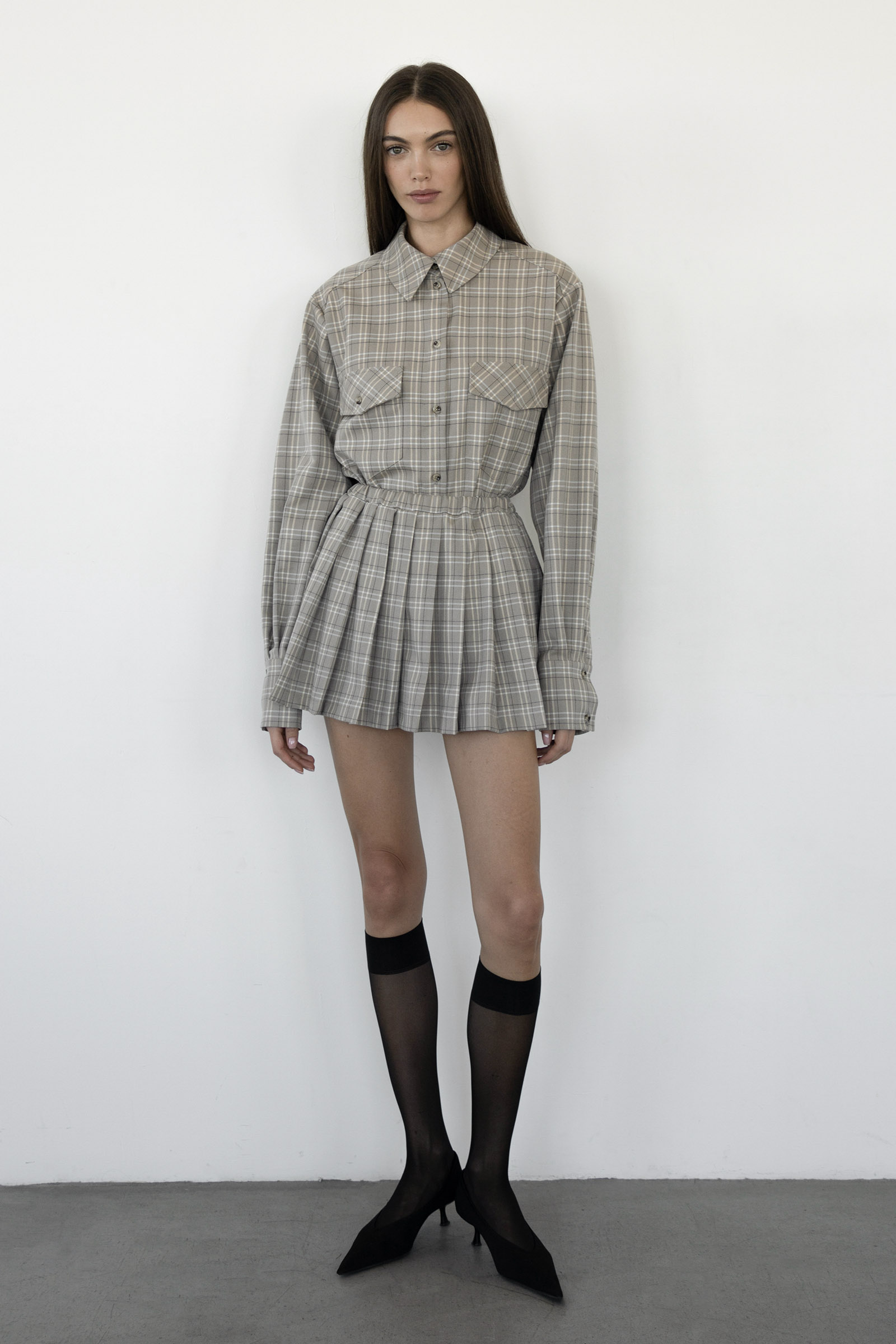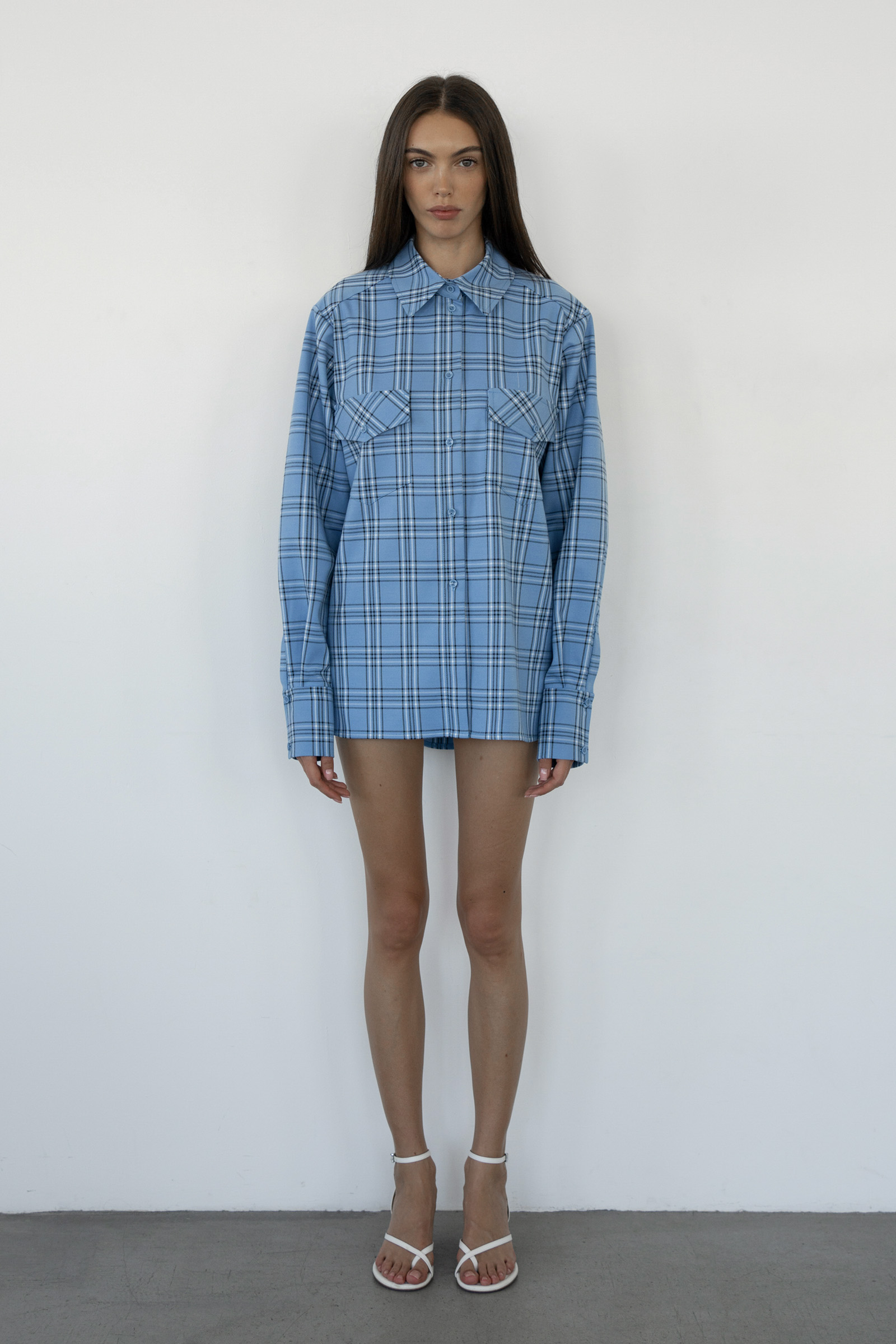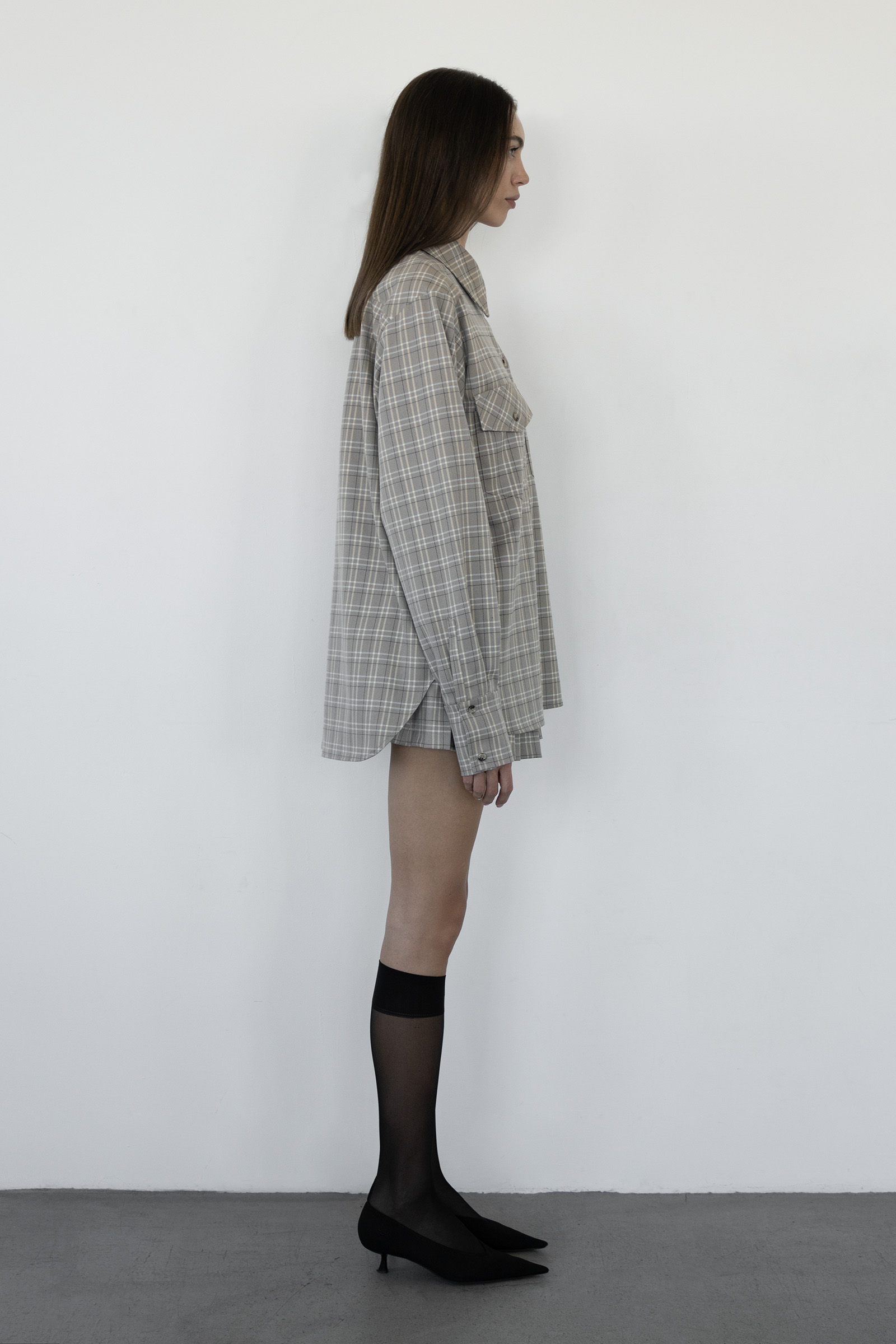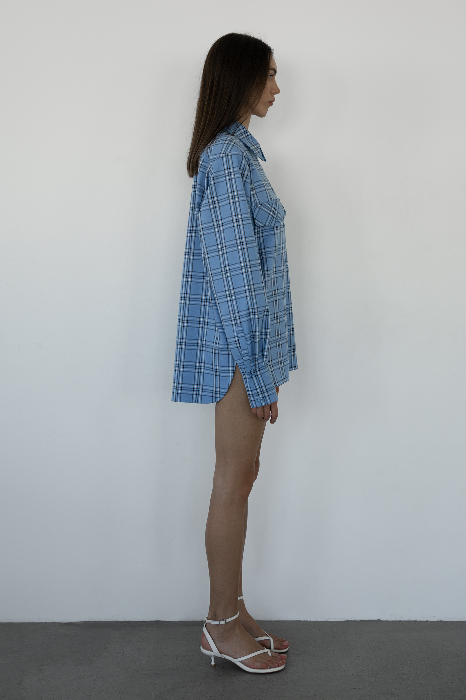 An elongated oversized shirt with side slits, made from checked cotton with viscose. The back features a box pleat and elongated cuffs.