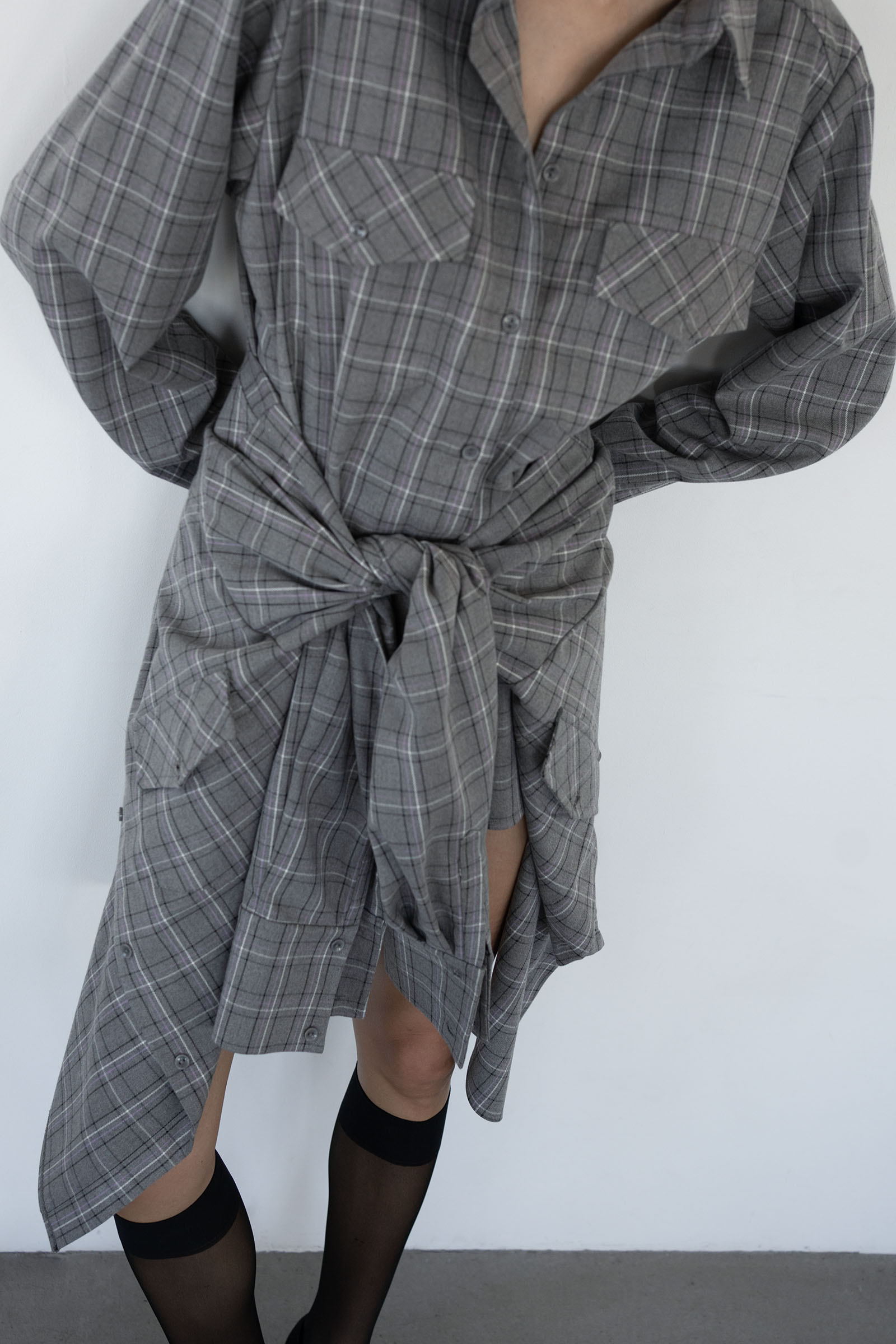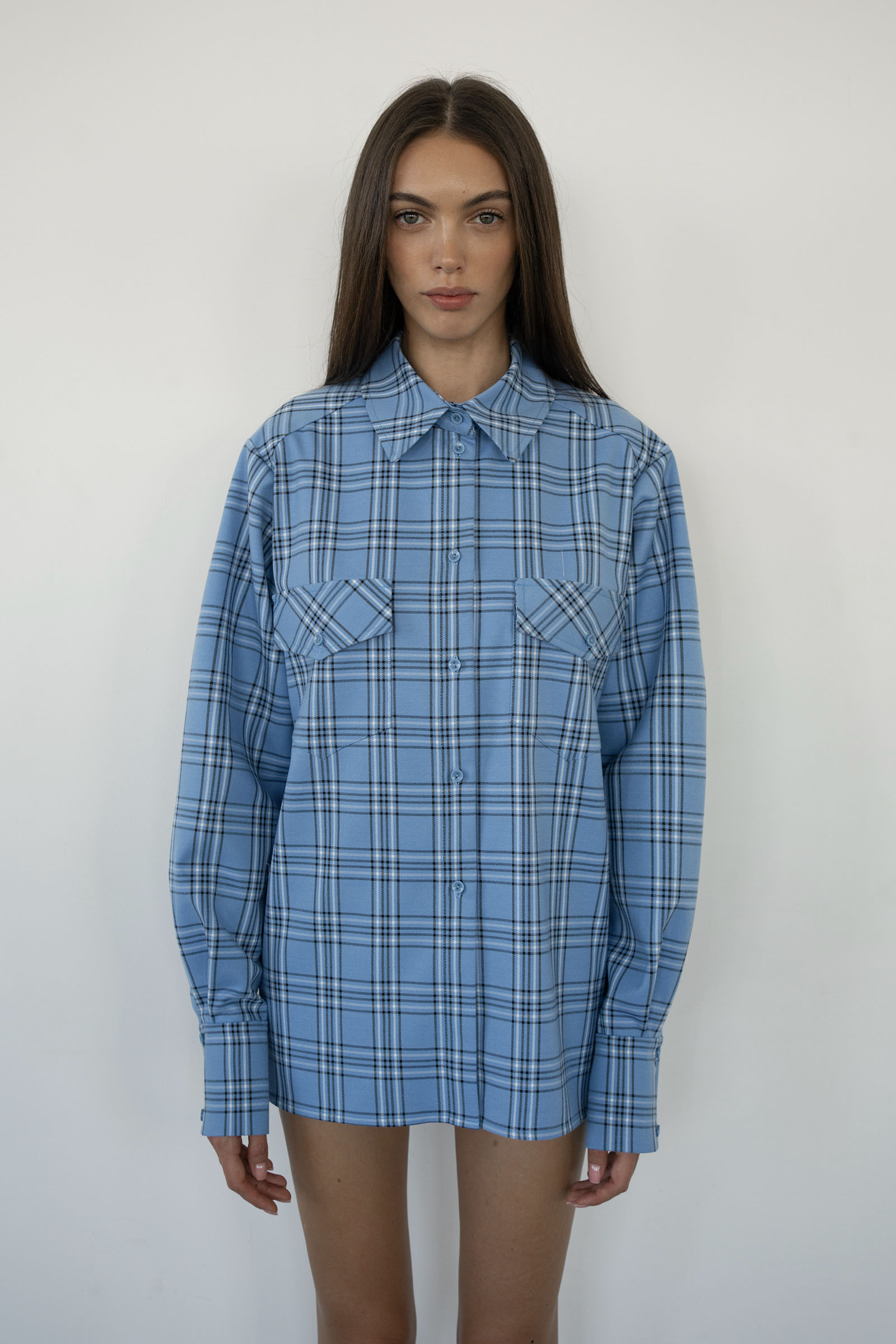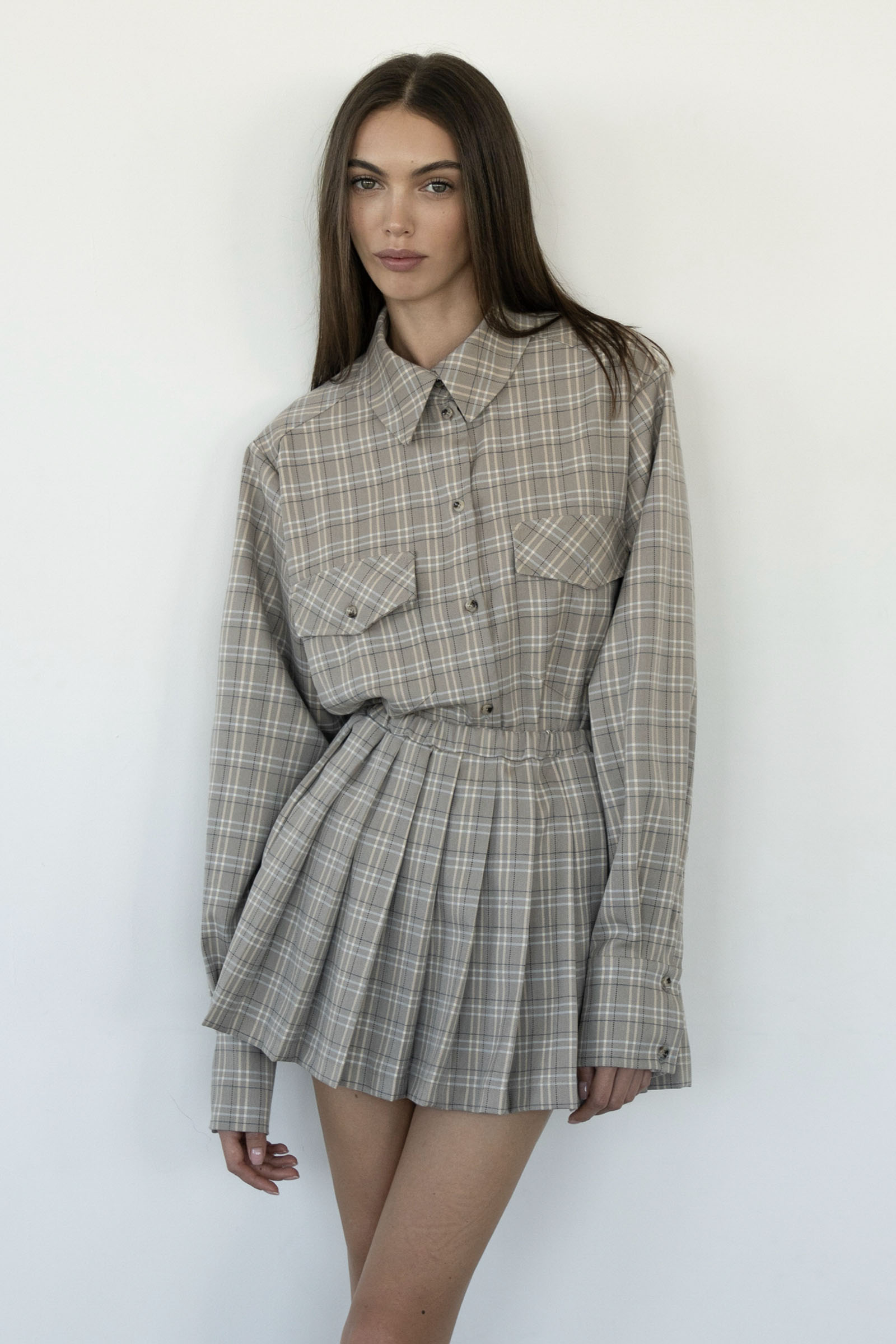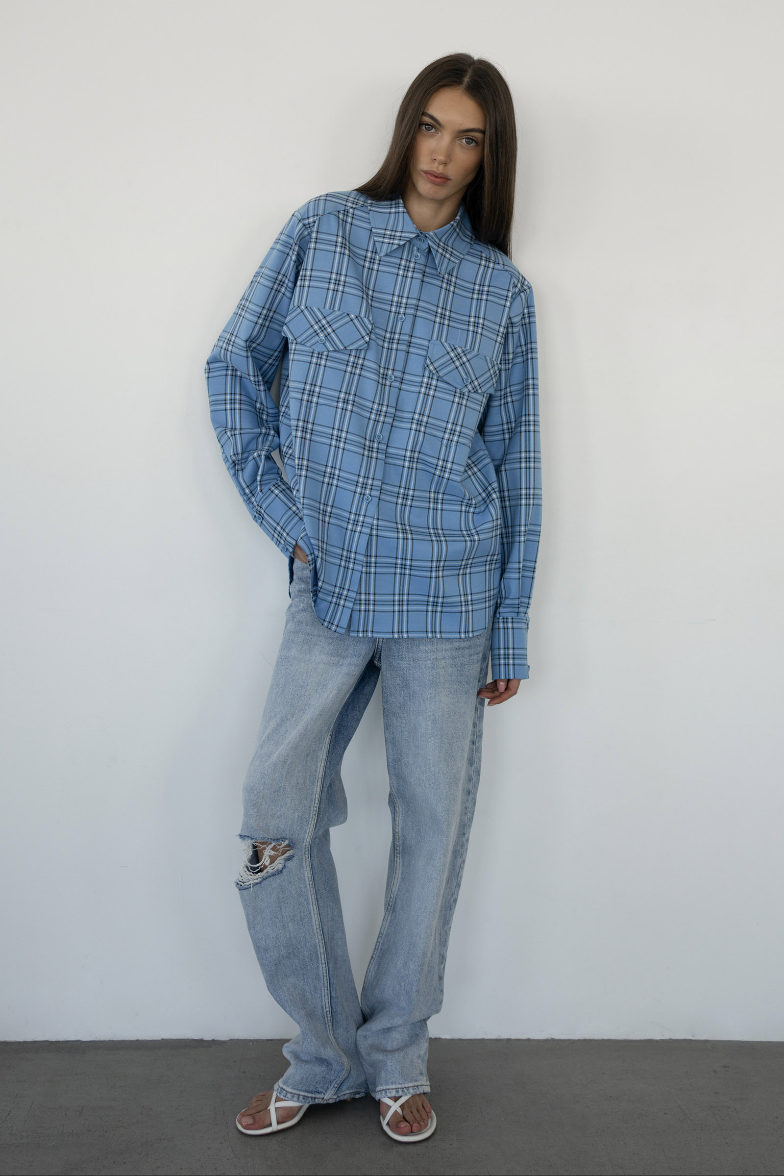 An elongated oversized shirt with side slits, made from checked cotton with viscose. The back features a box pleat and elongated cuffs.