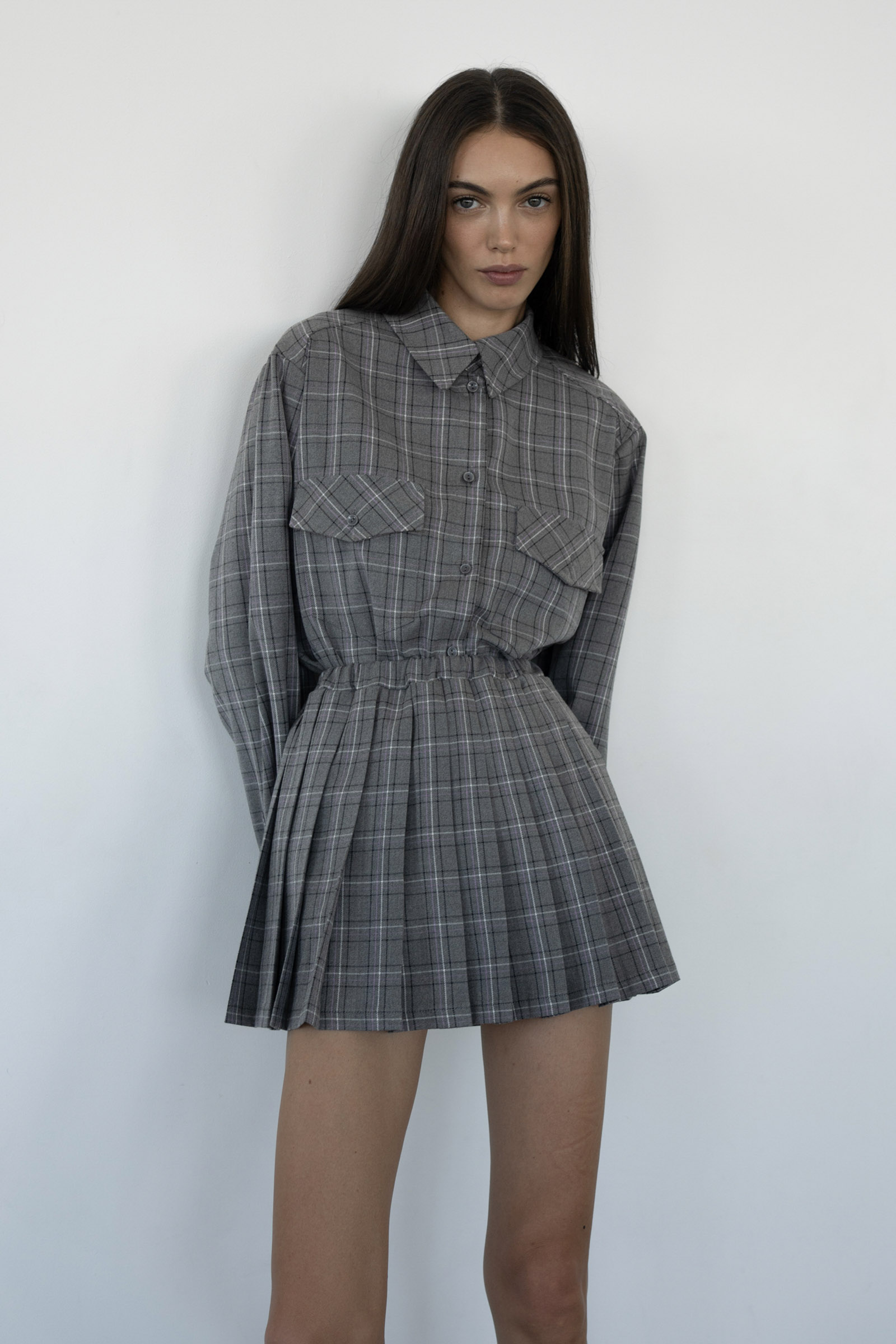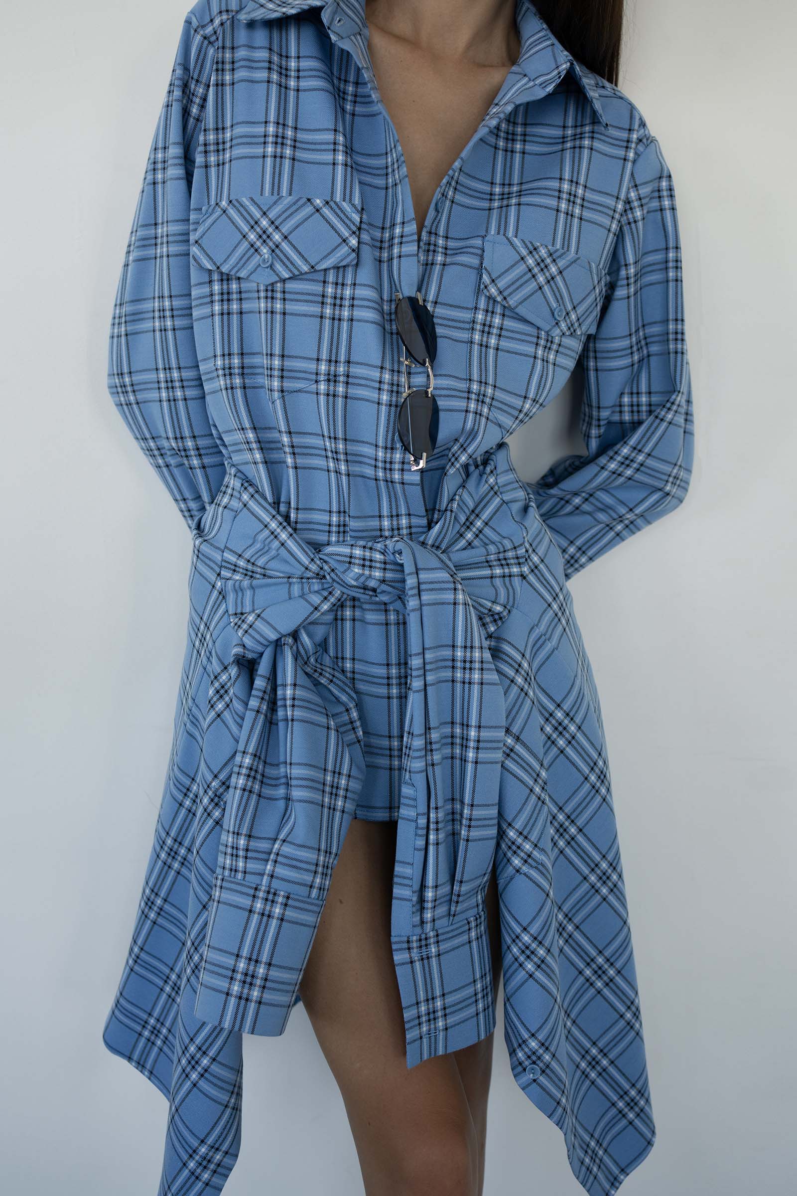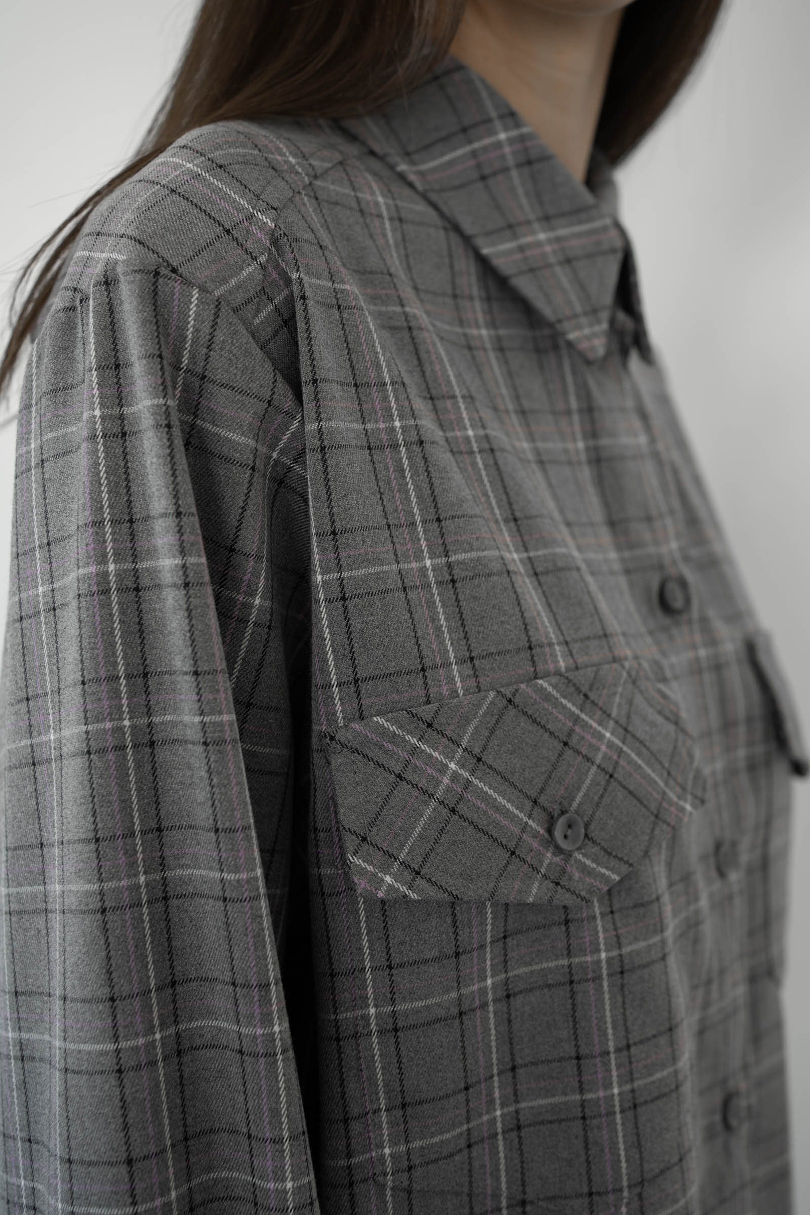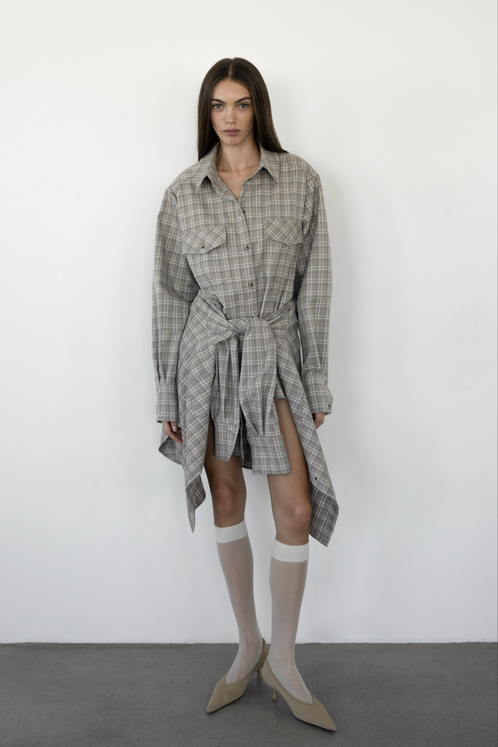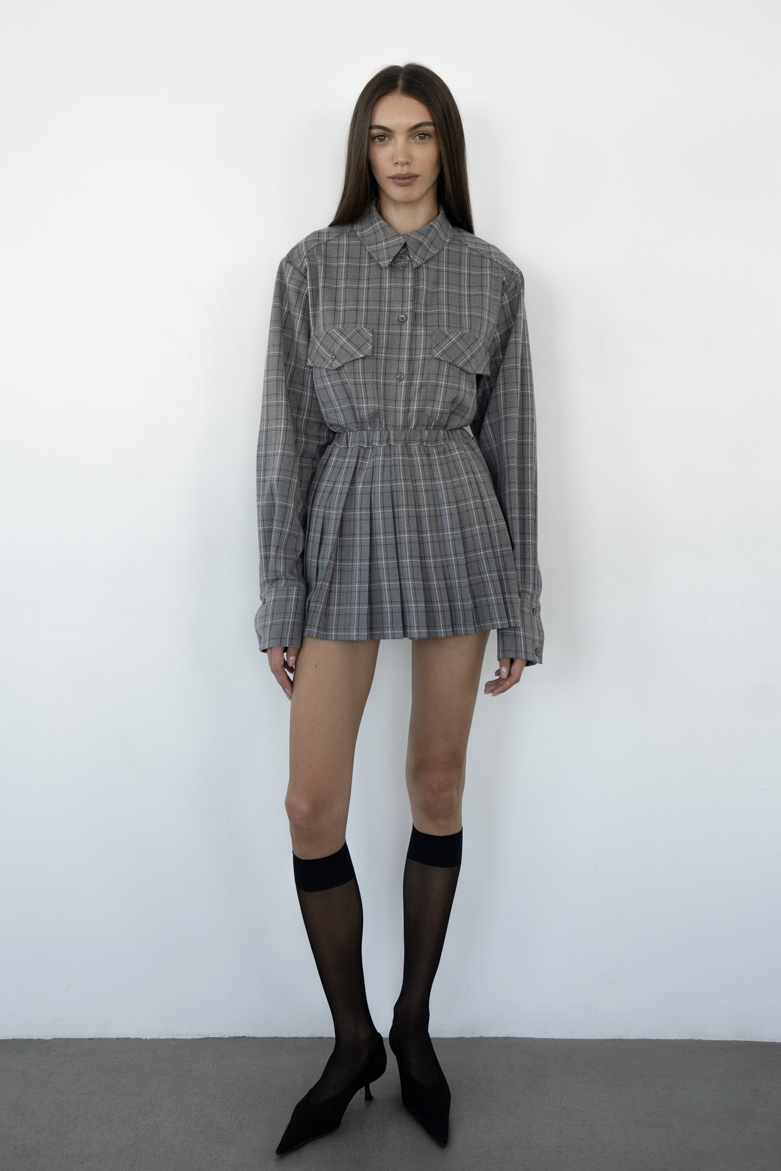 An elongated oversized shirt with side slits, made from checked cotton with viscose. The back features a box pleat and elongated cuffs.