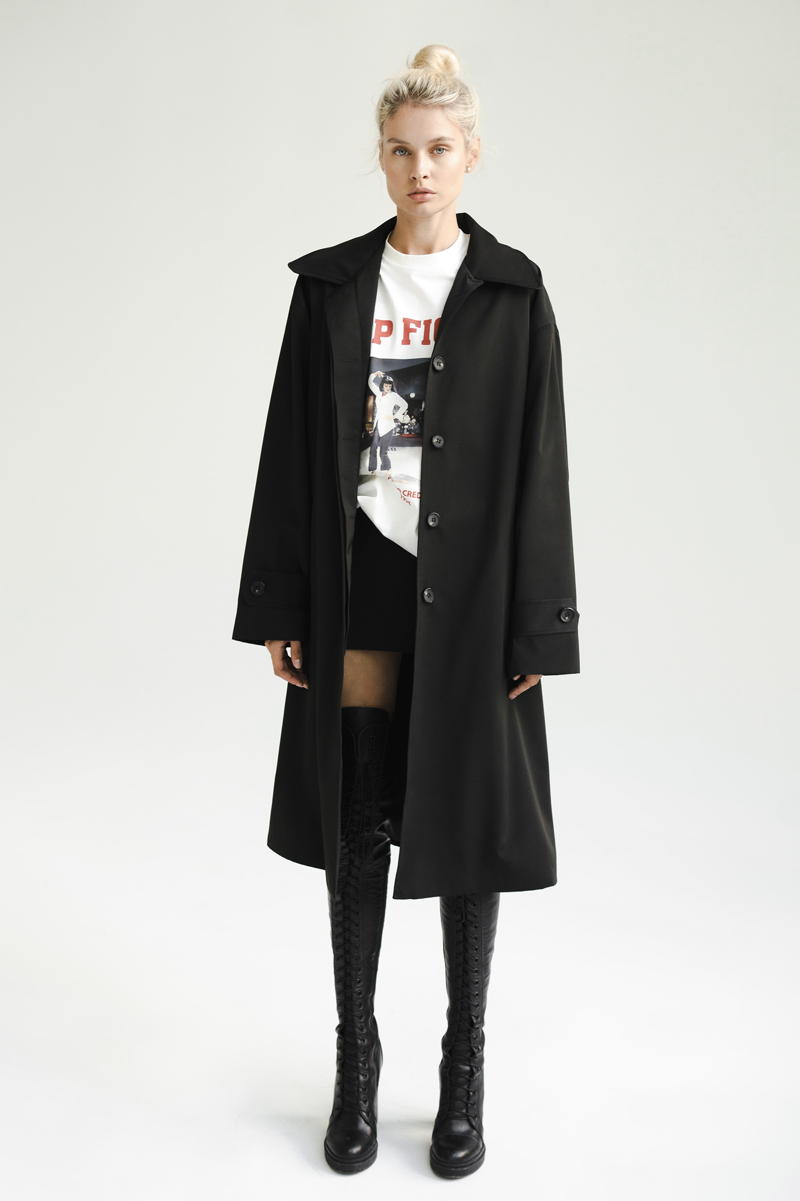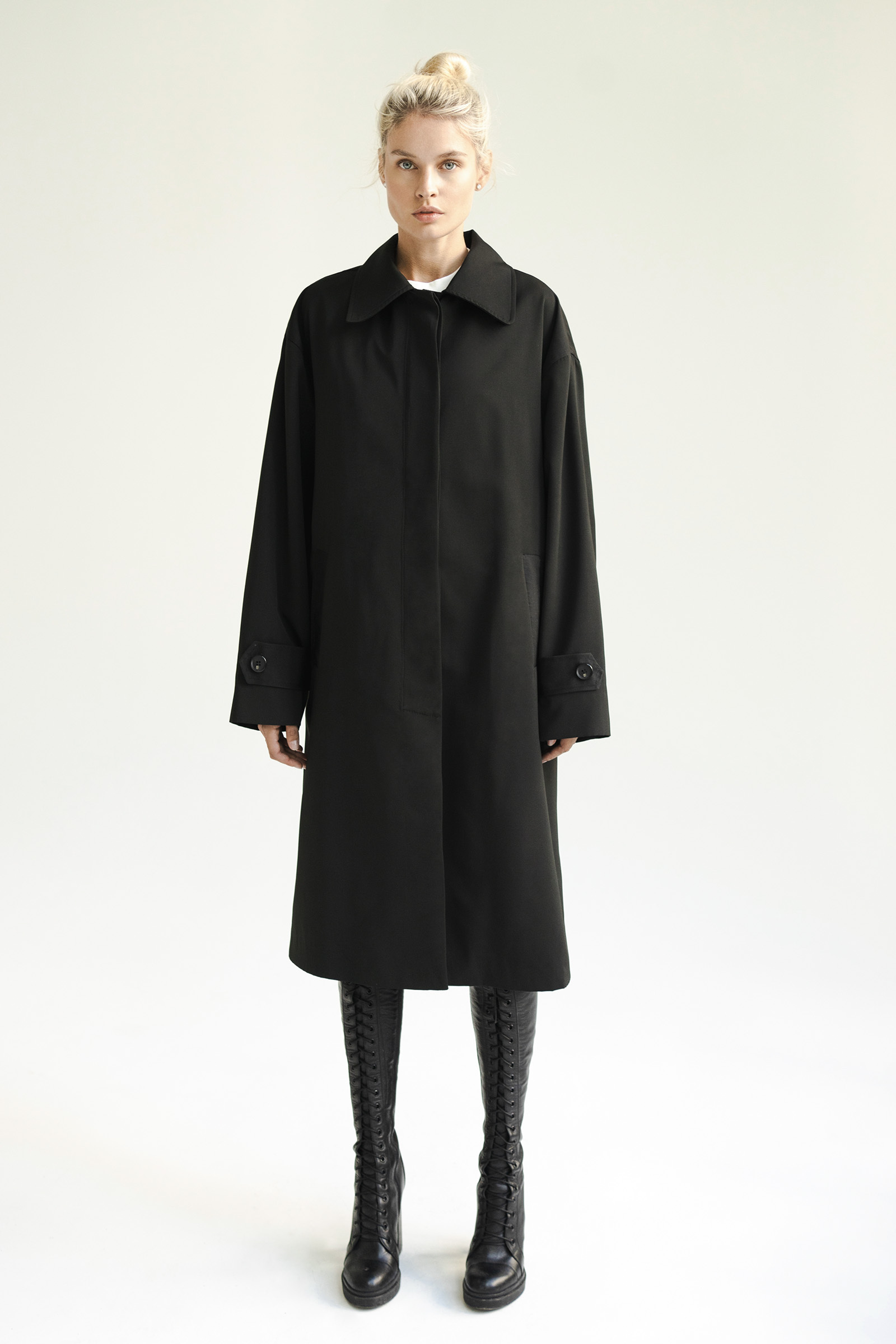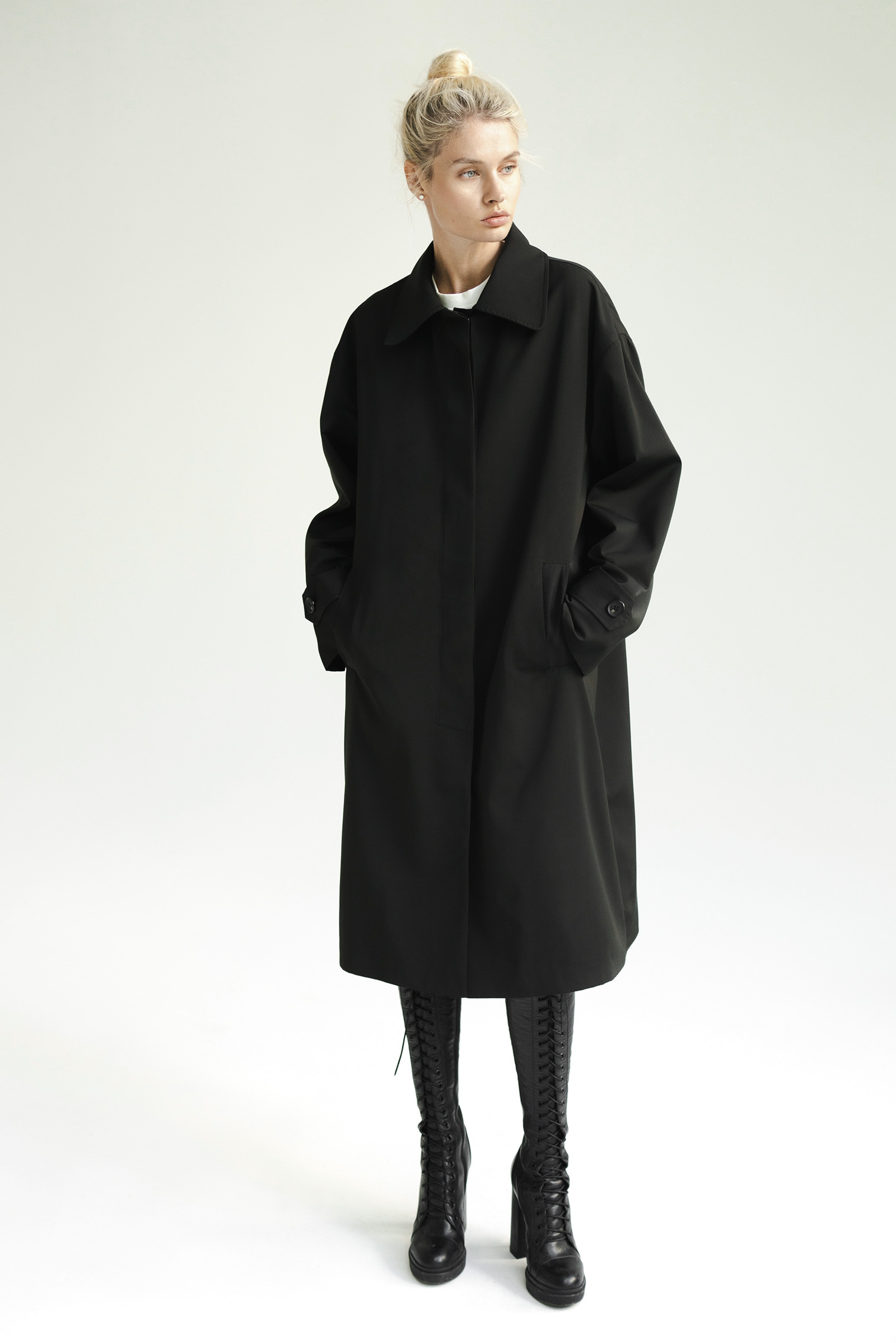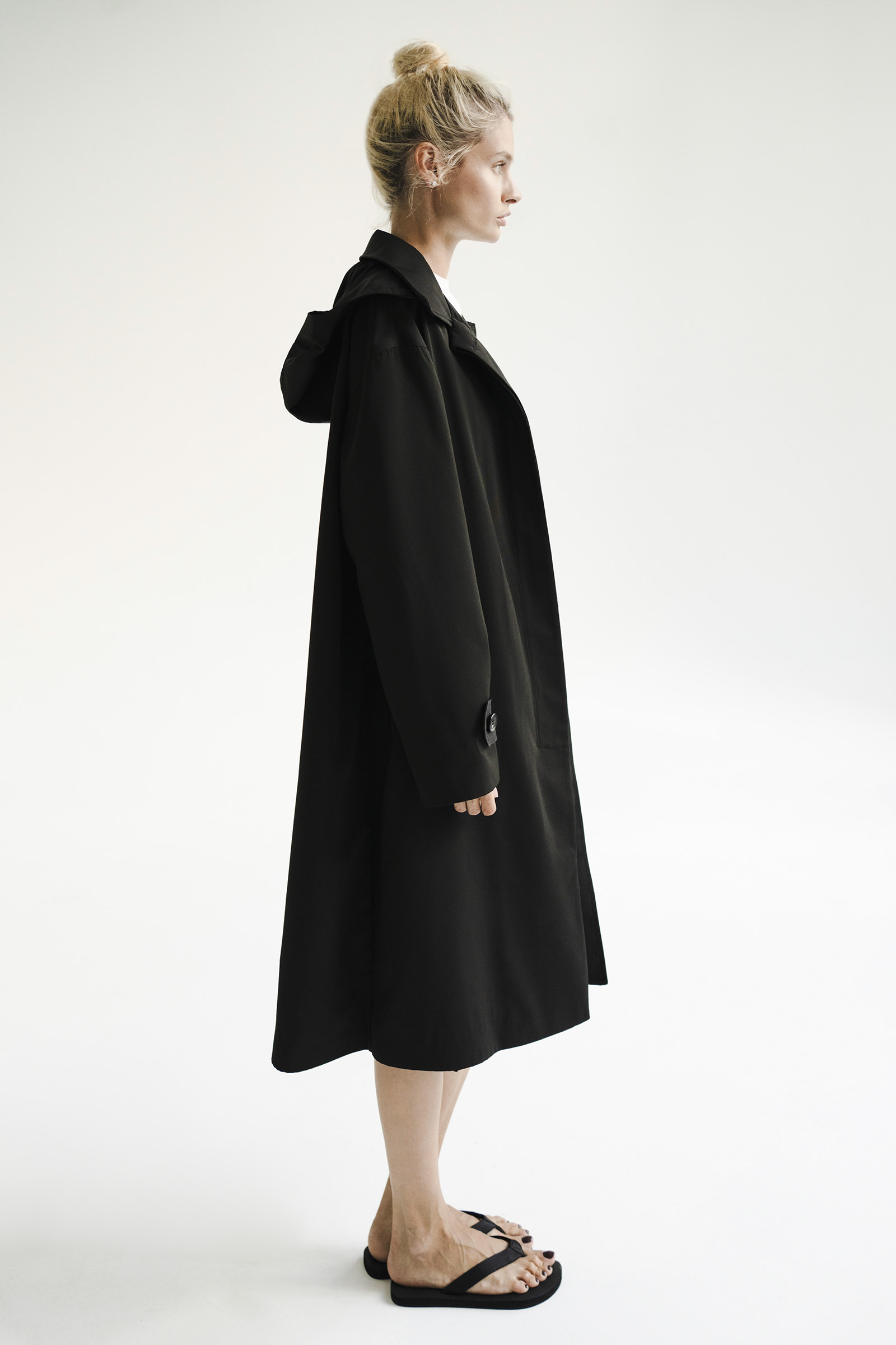 A trench coat with a dropped shoulder line, a hidden button placket, and a detachable hood, featuring two side inset pockets. The model is crafted from a waterproof material. Lining: 100% viscose.