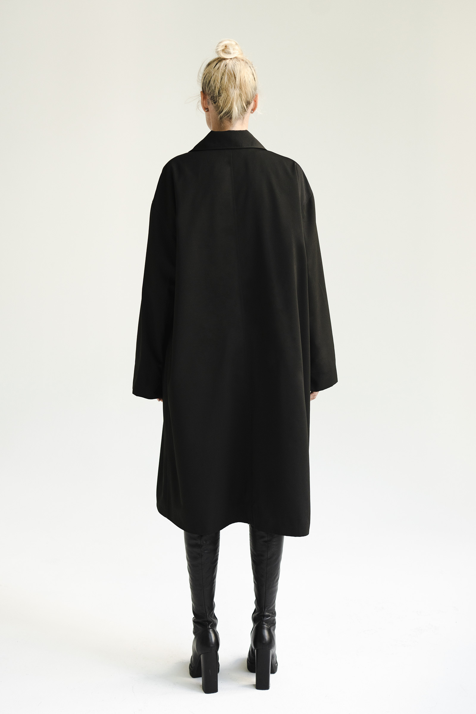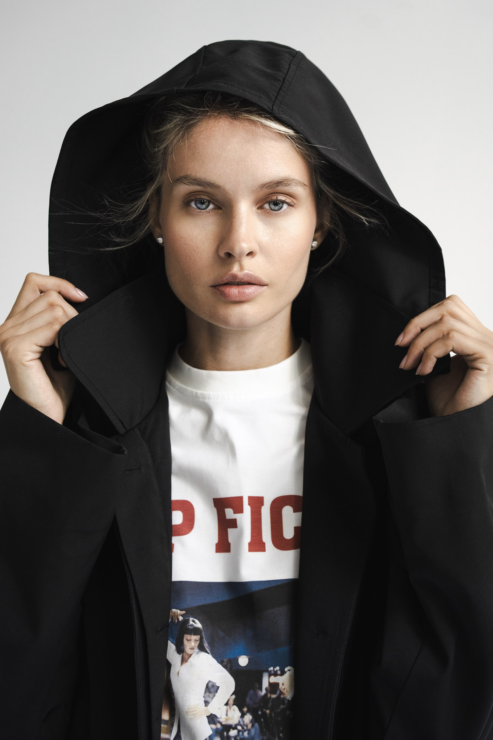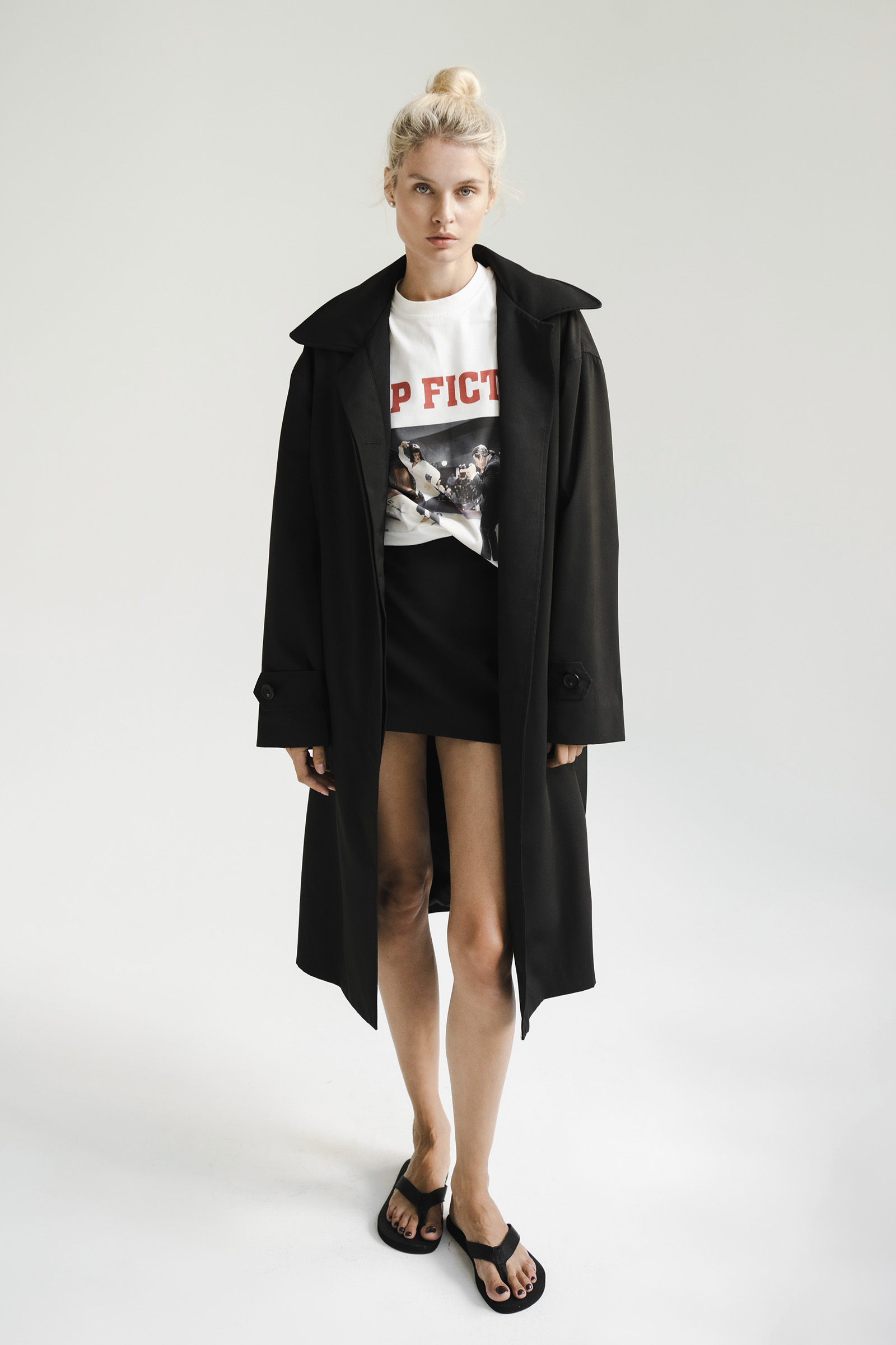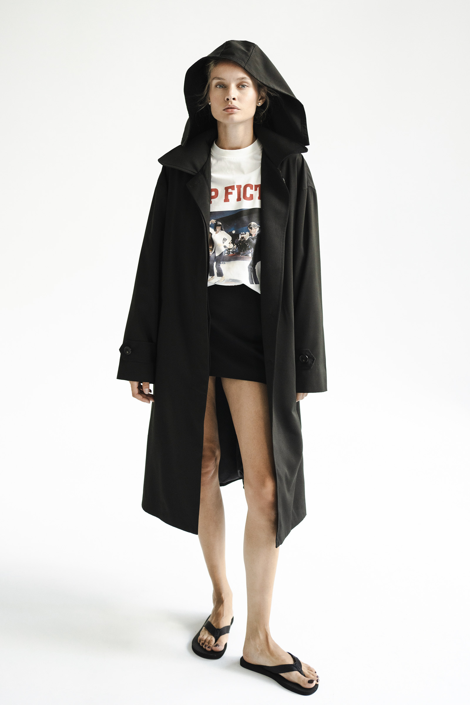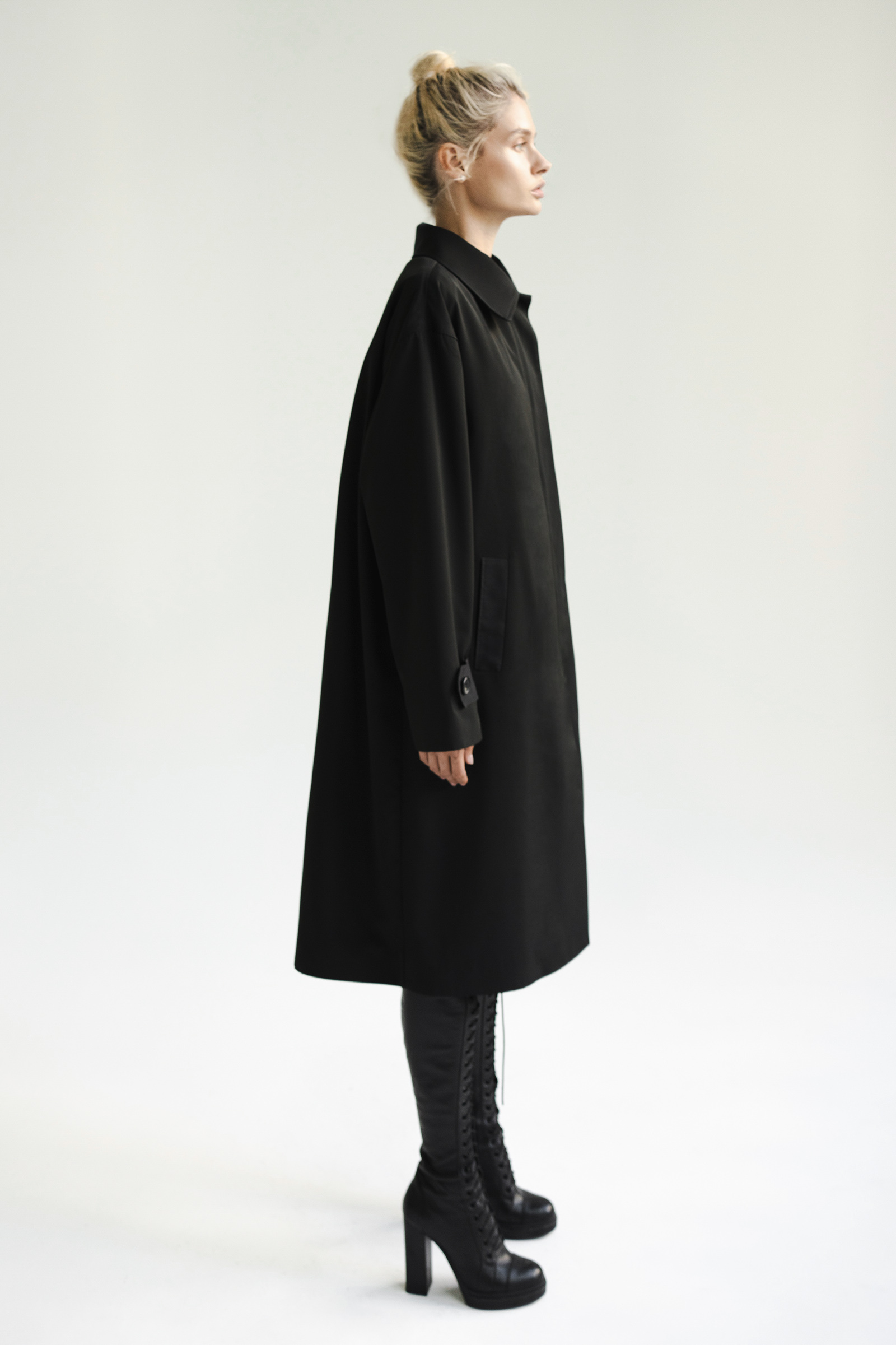 A trench coat with a dropped shoulder line, a hidden button placket, and a detachable hood, featuring two side inset pockets. The model is crafted from a waterproof material. Lining: 100% viscose.