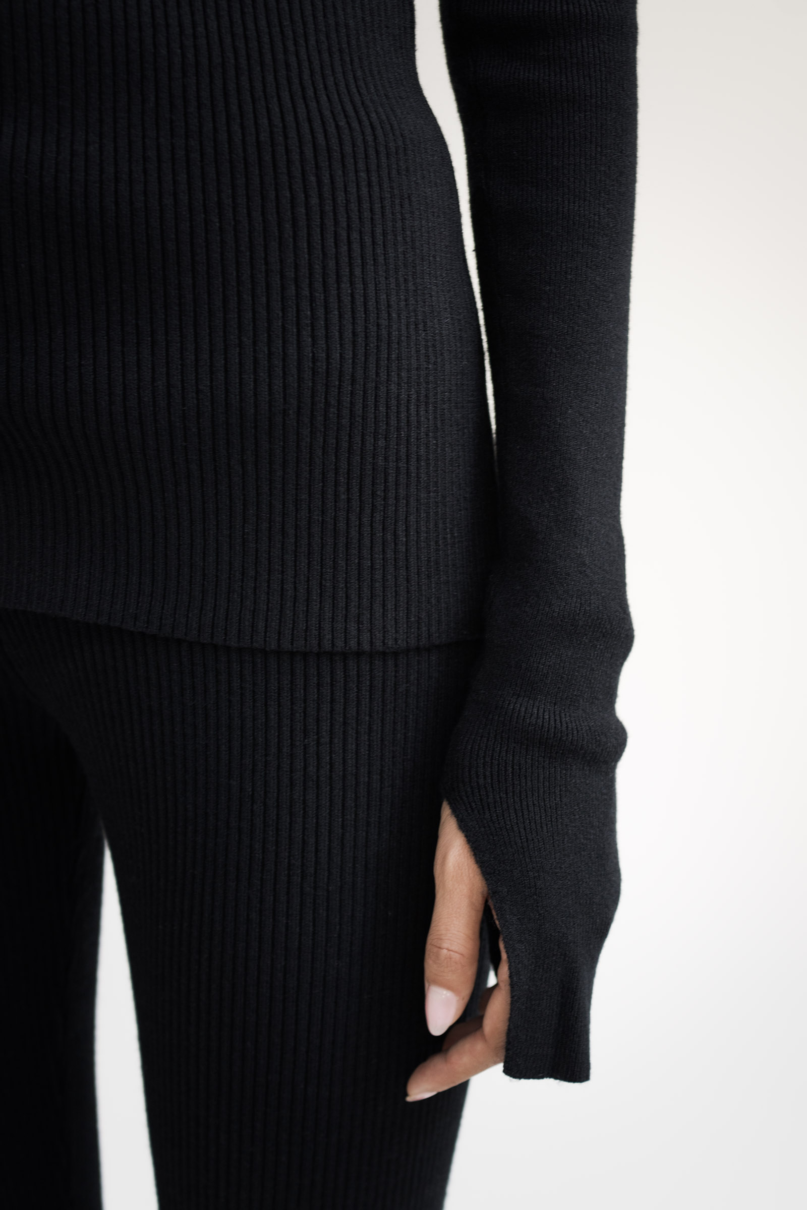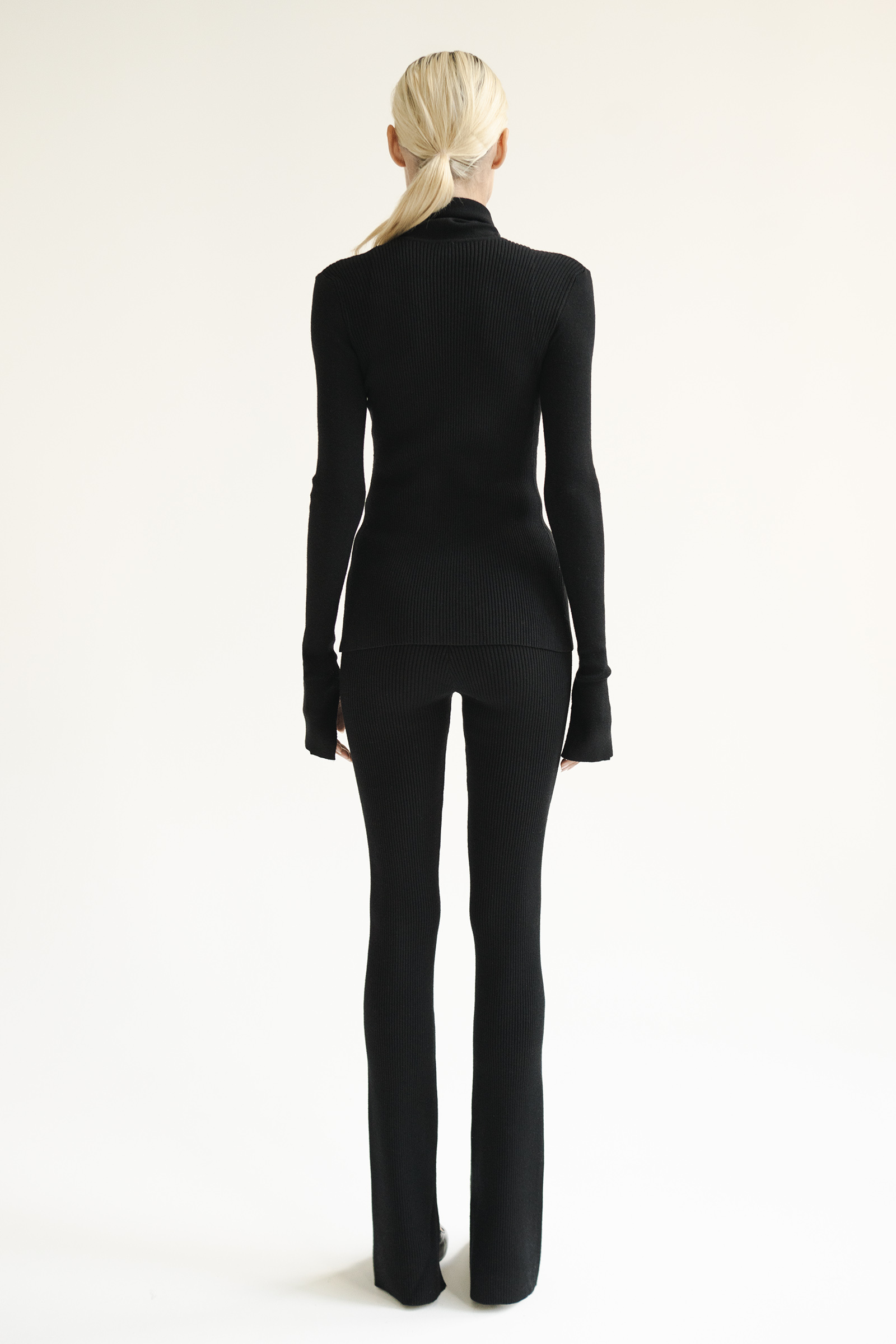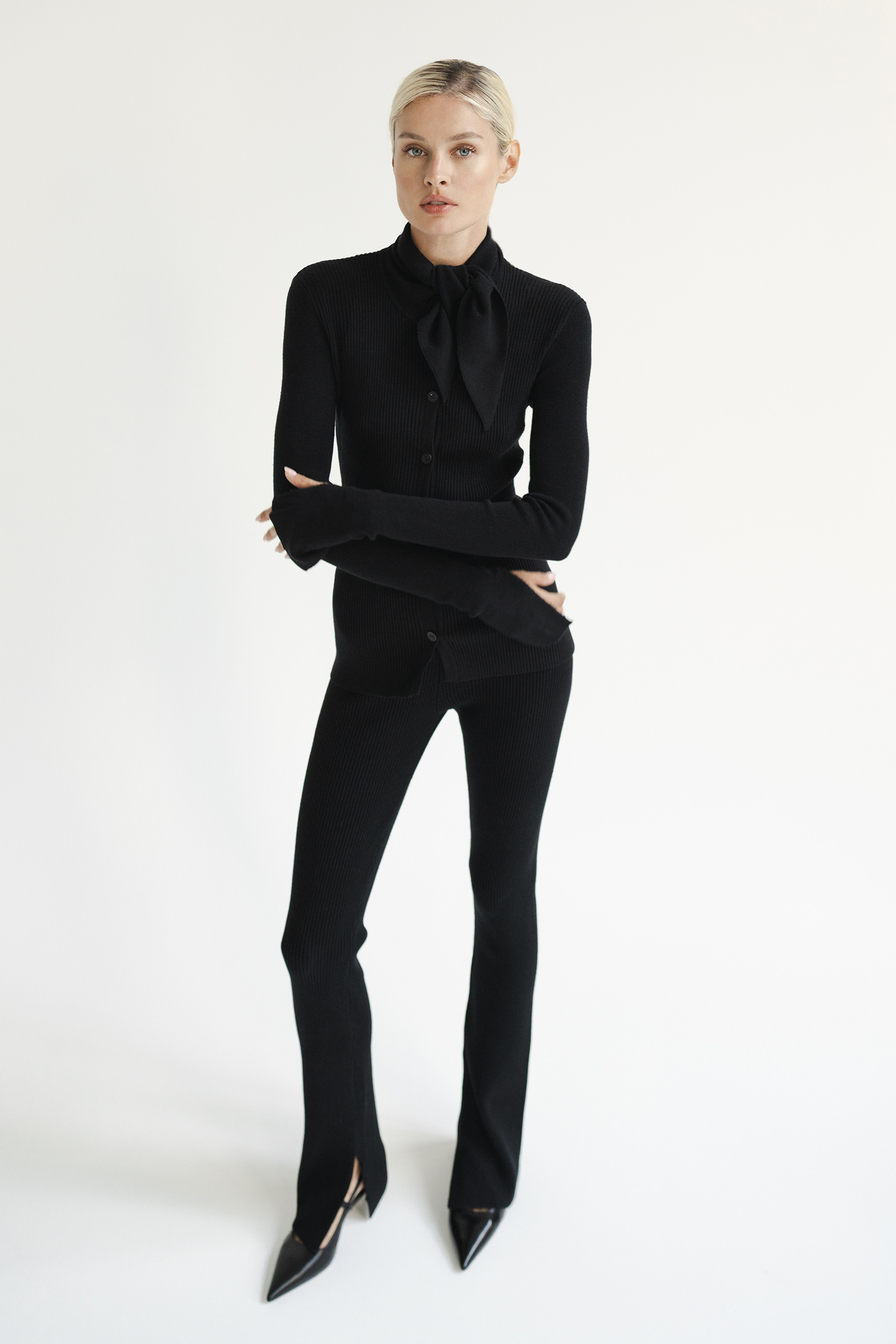 Ribbed trousers made of viscose knit with a slight flare. The model features slits at the hem and an elasticated waistband for a comfortable fit.
