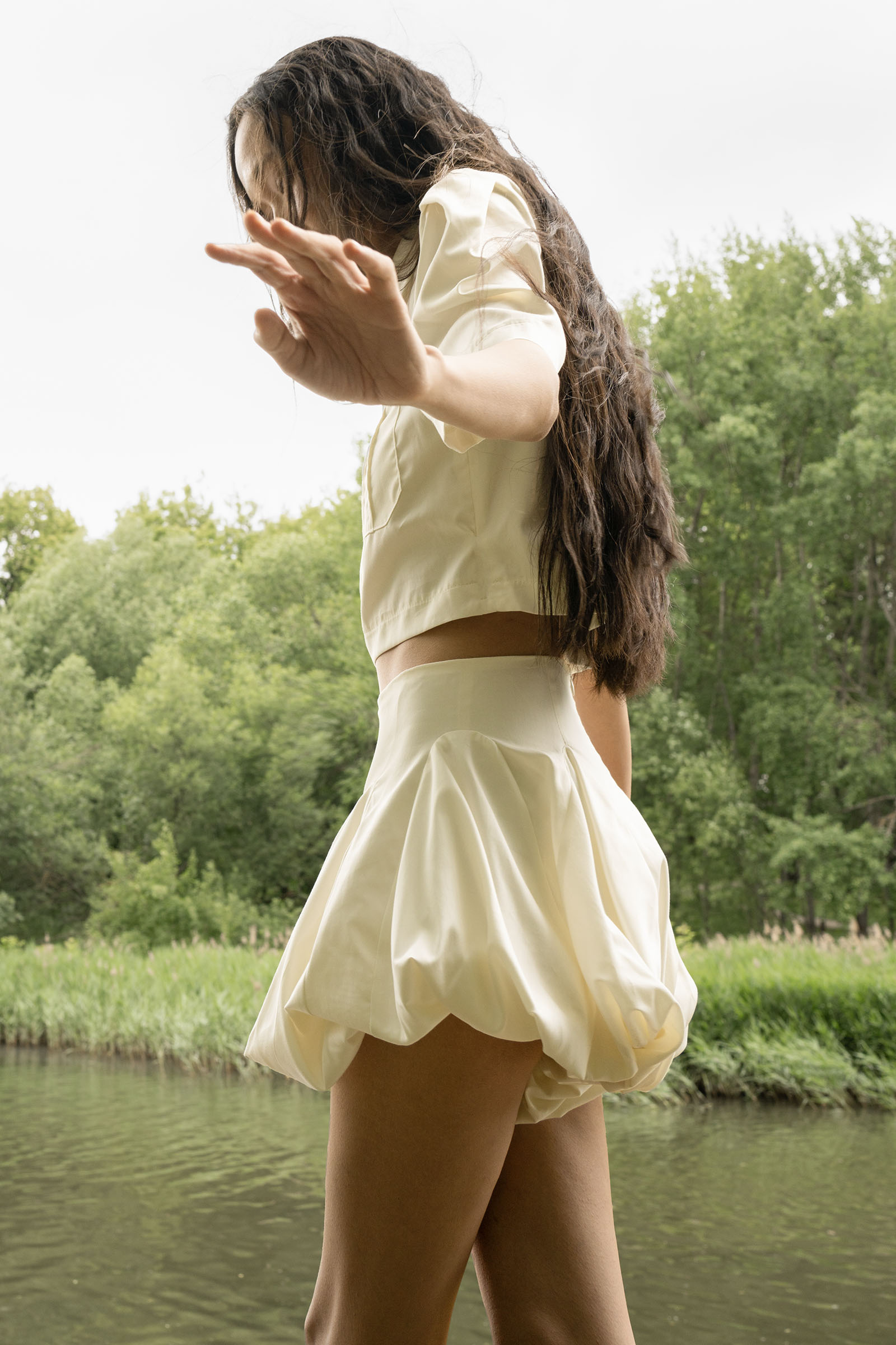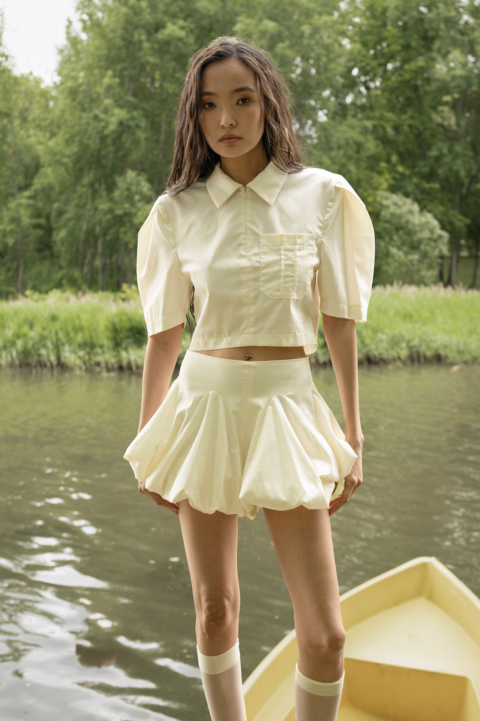 A bubble-hem skort sewn from lightweight shirting cotton. Fastens with a hidden zipper.