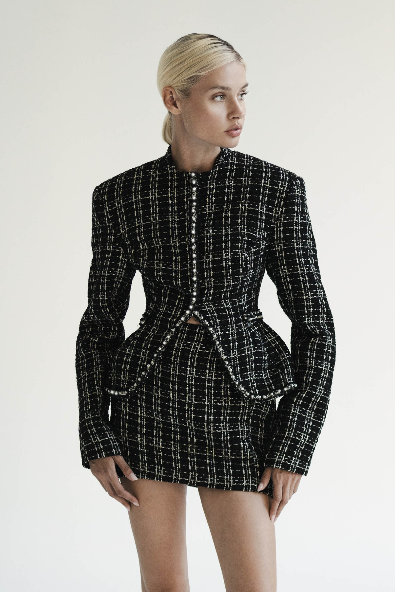 A cropped tweed jacket with a defined, fitted cut and a sharp shoulder line. The piece fastens with hidden buttons.
