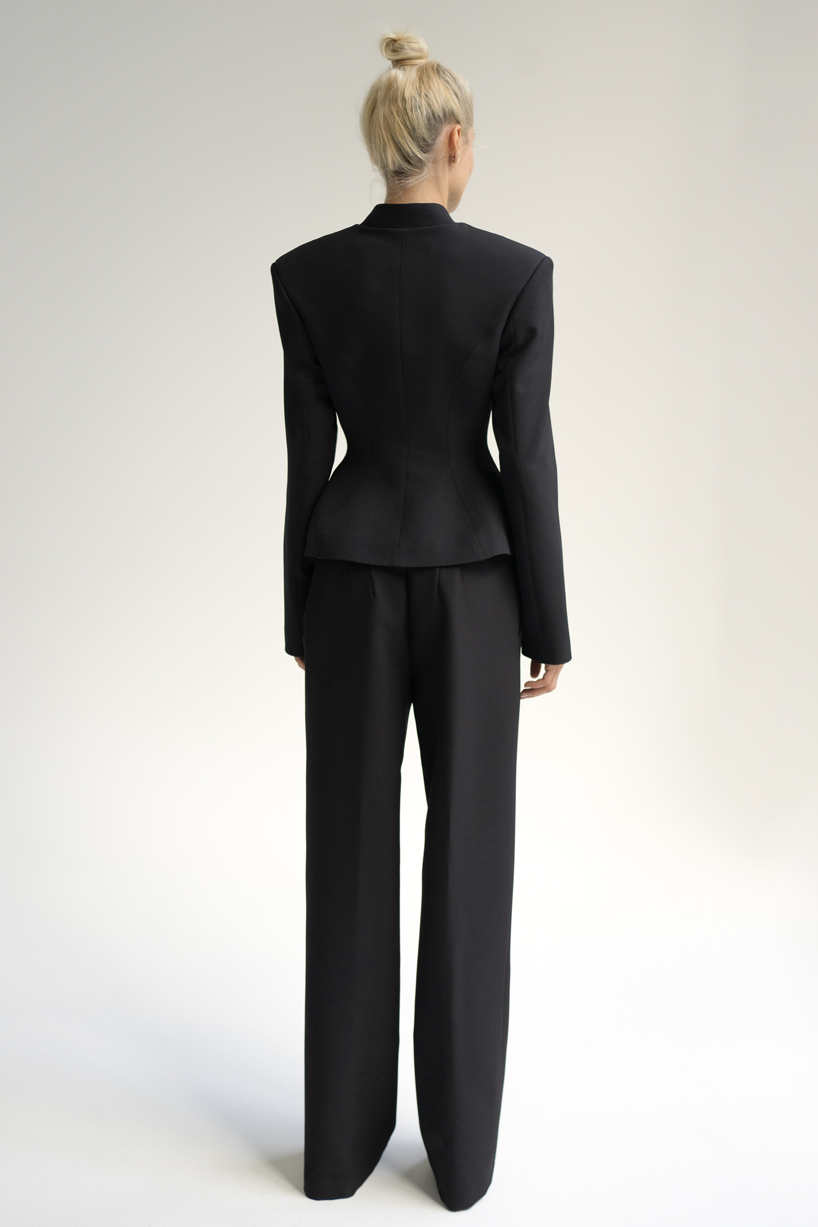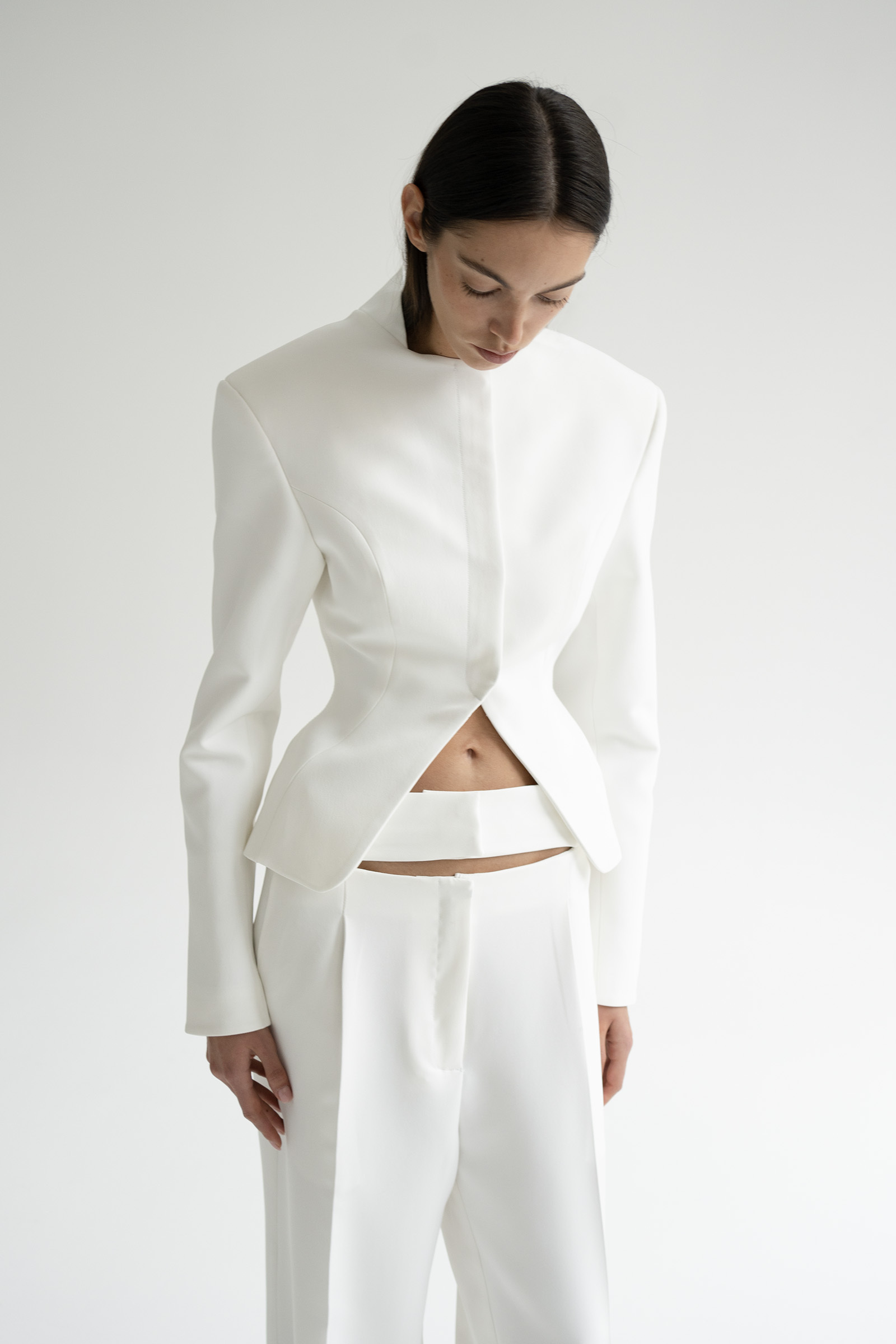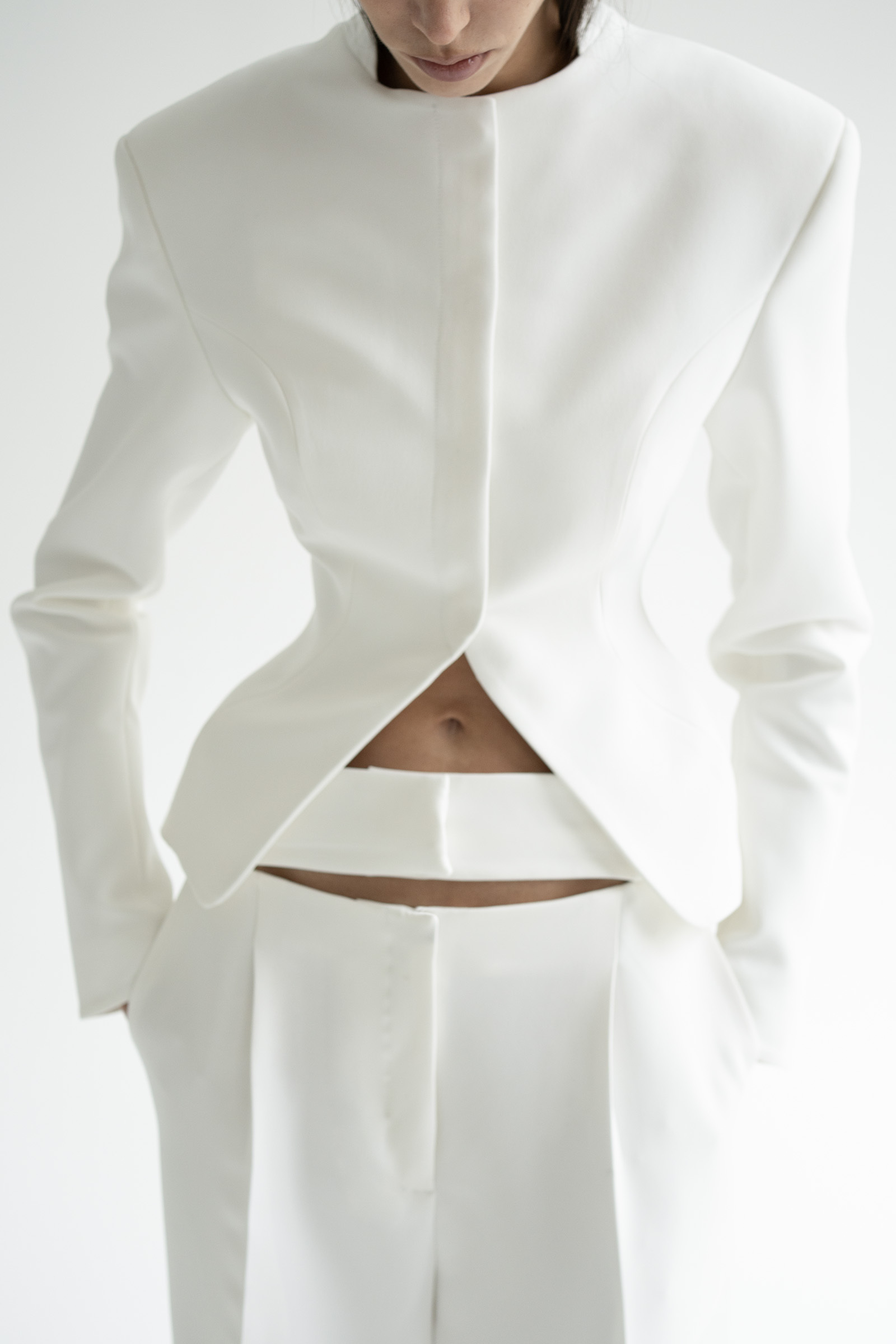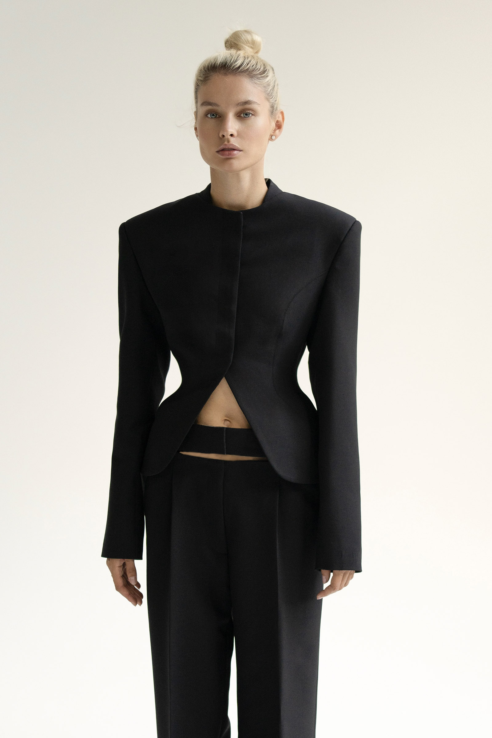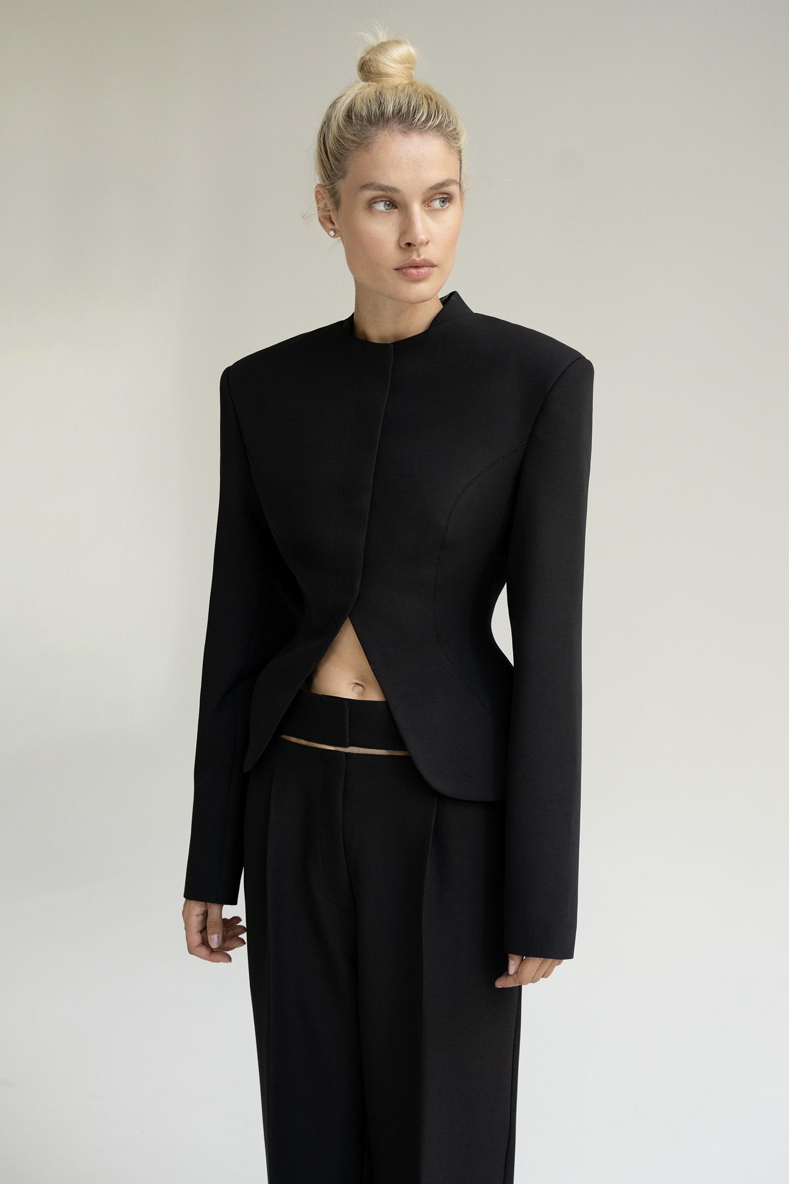 A cropped jacket with a defined, fitted cut and a sharp shoulder line. The piece fastens with hidden buttons. It is crafted from a dense viscose-based suiting fabric. This jacket pairs perfectly with the Blanche top and trousers from our collection.