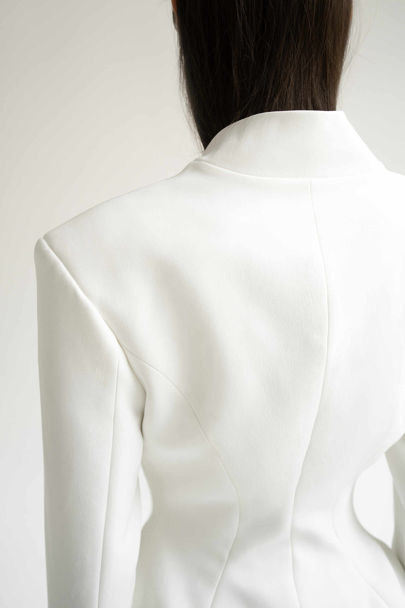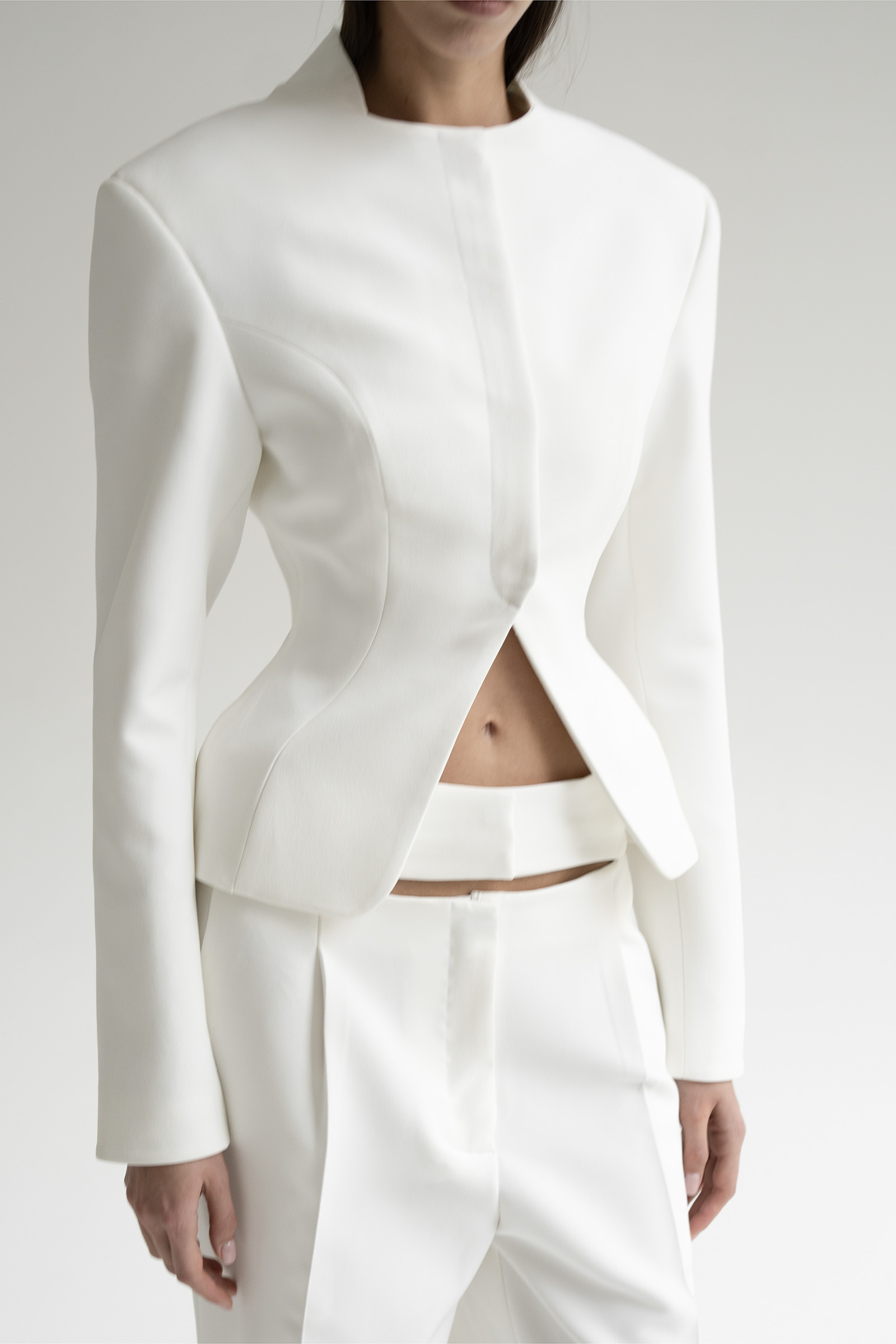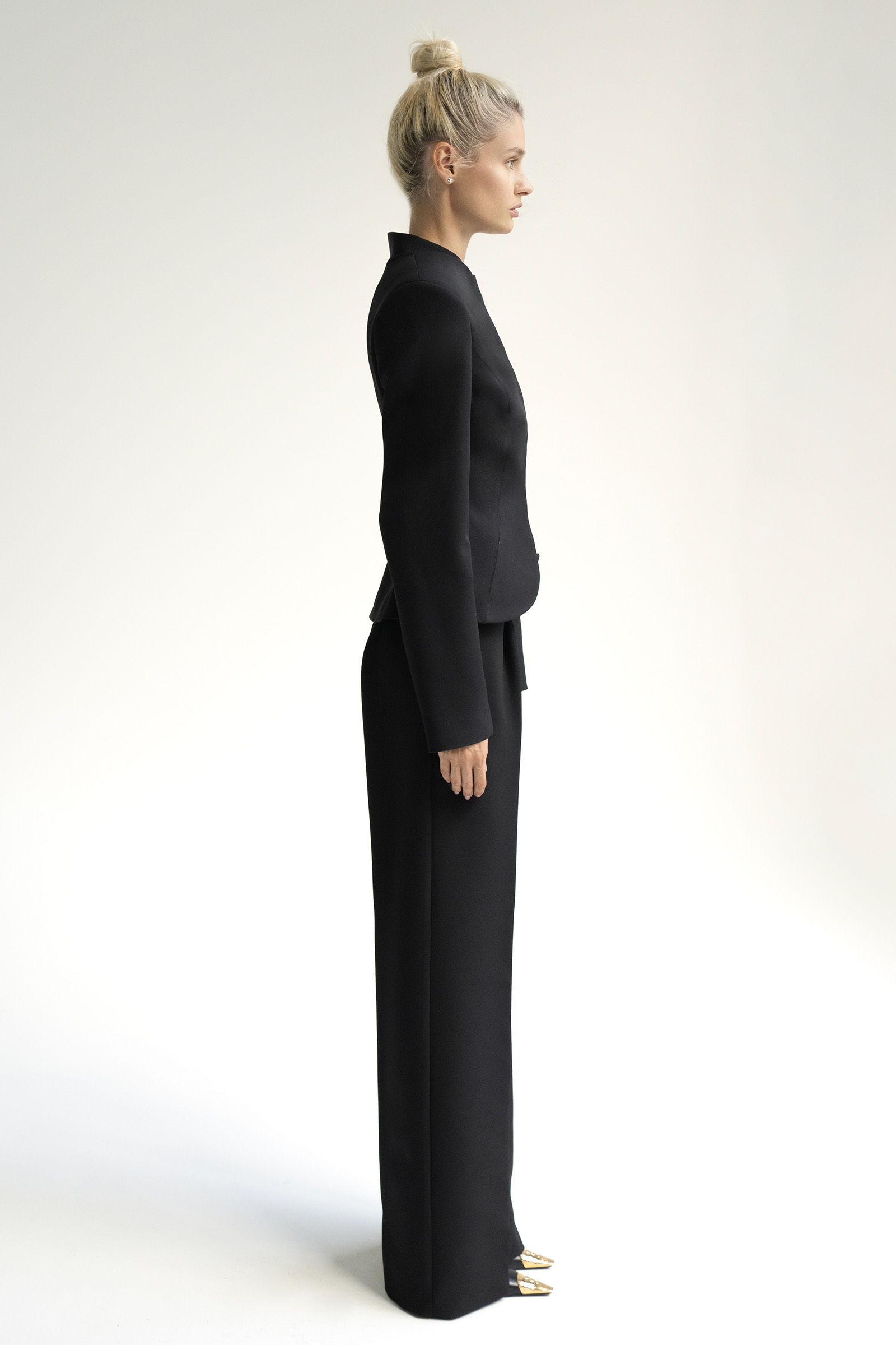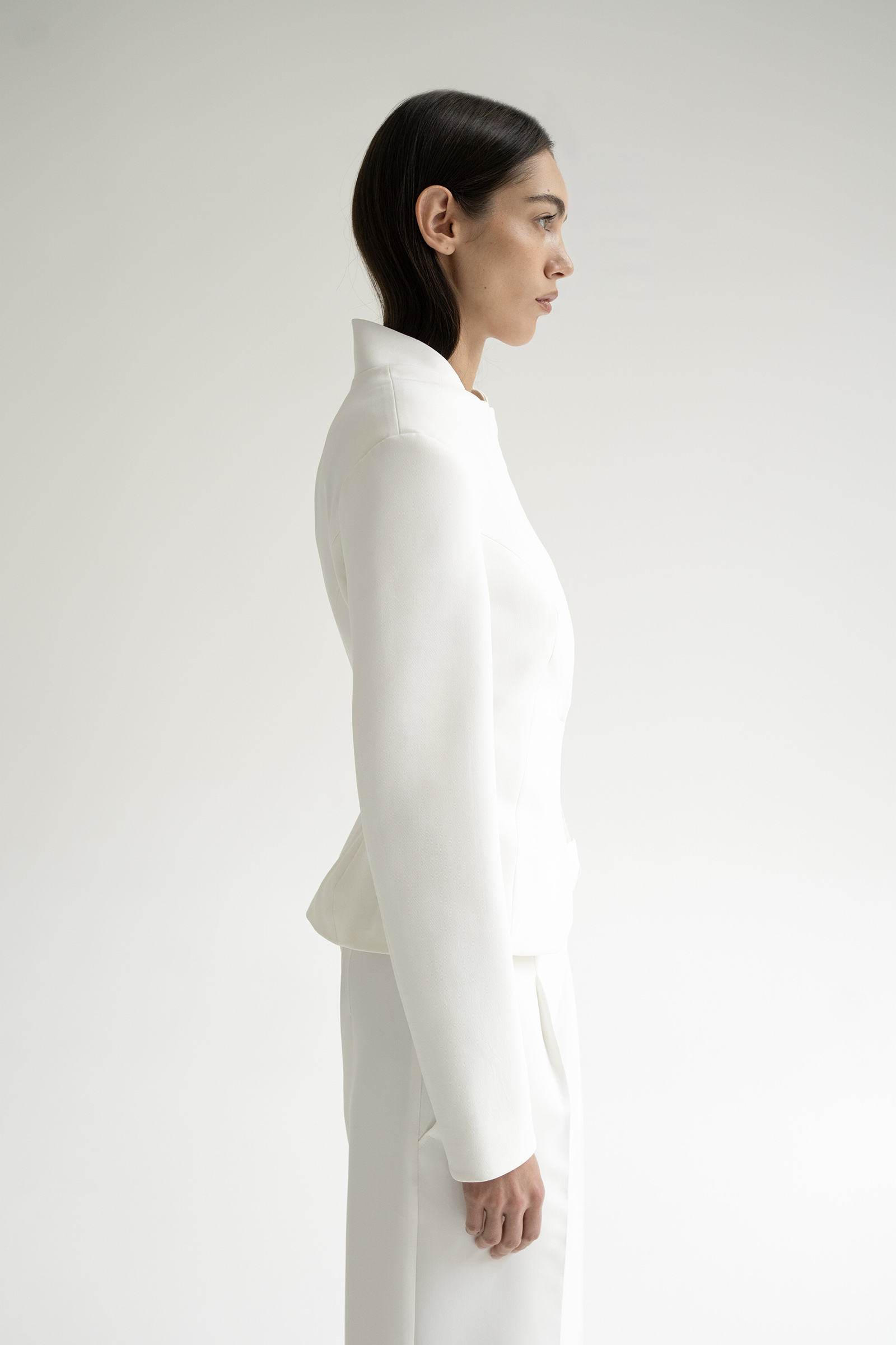 A cropped jacket with a defined, fitted cut and a sharp shoulder line. The piece fastens with hidden buttons. It is crafted from a dense viscose-based suiting fabric. This jacket pairs perfectly with the Blanche top and trousers from our collection.