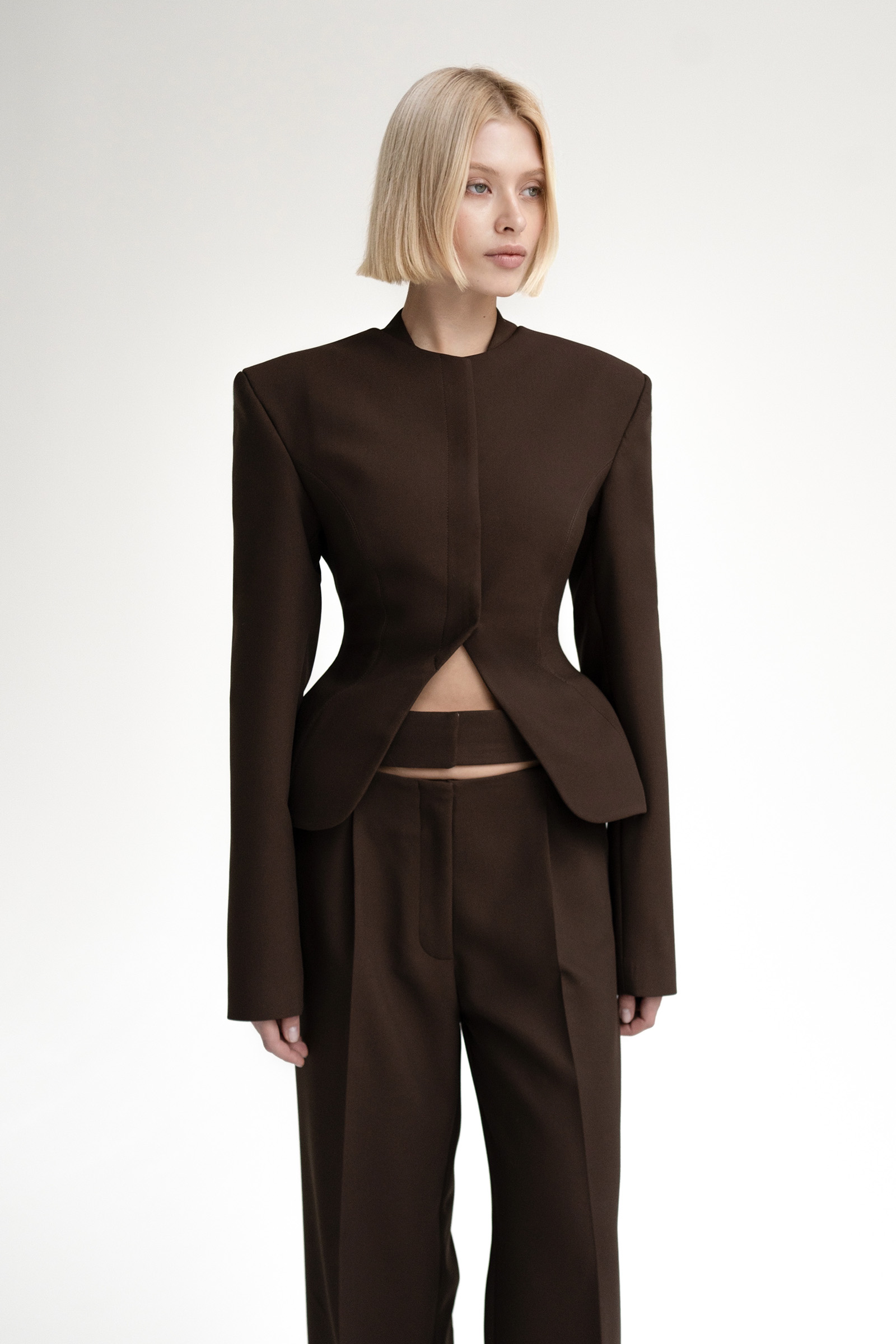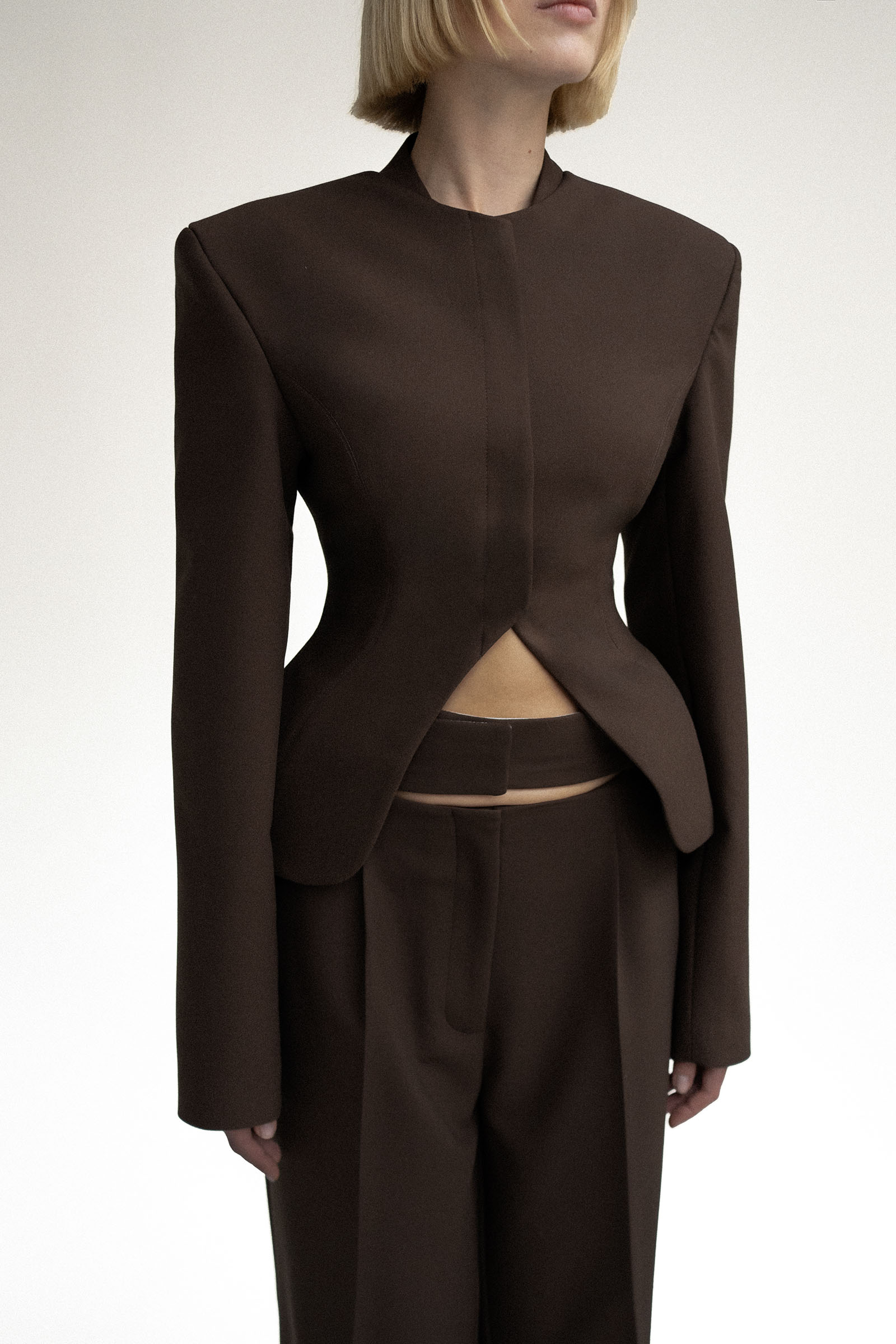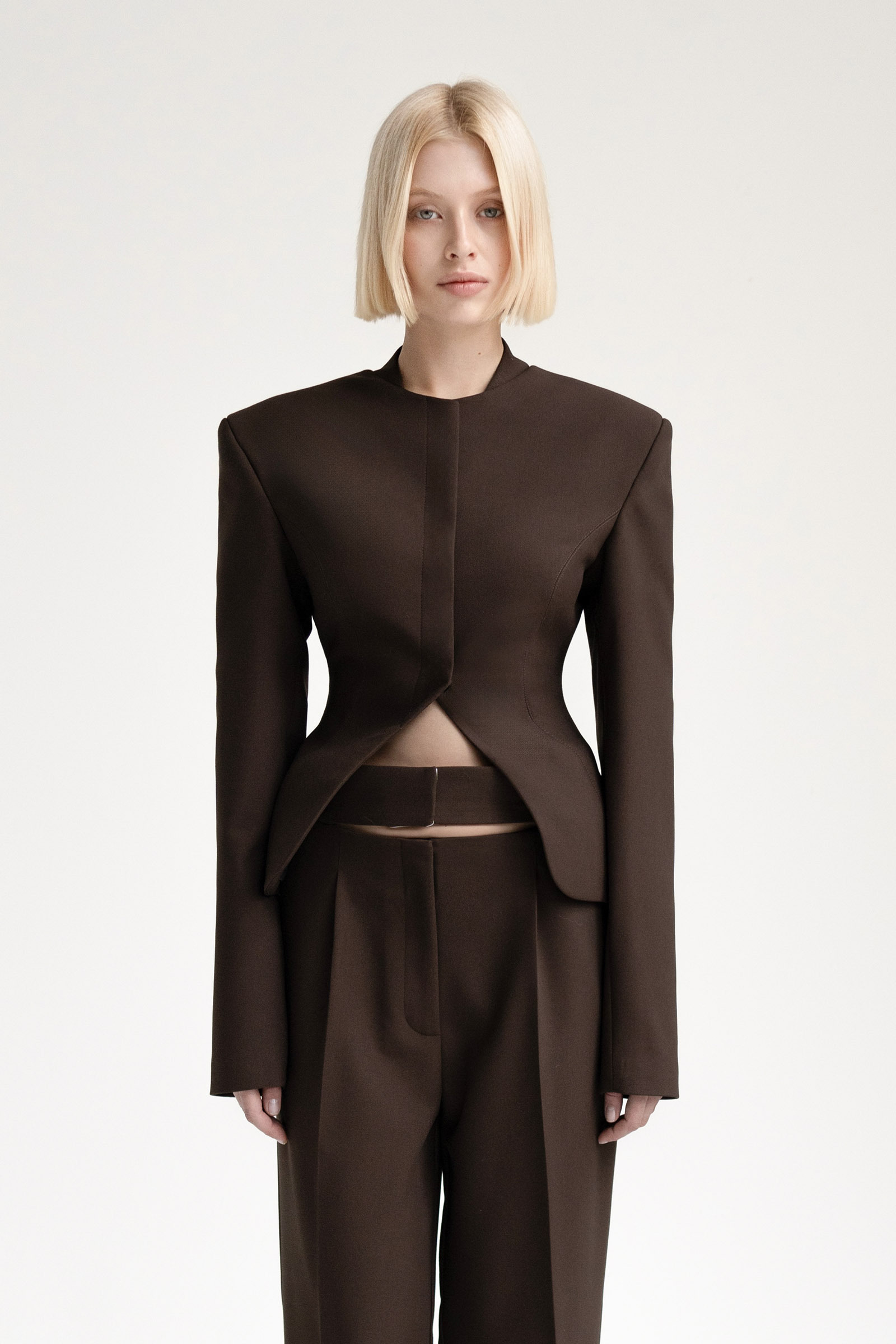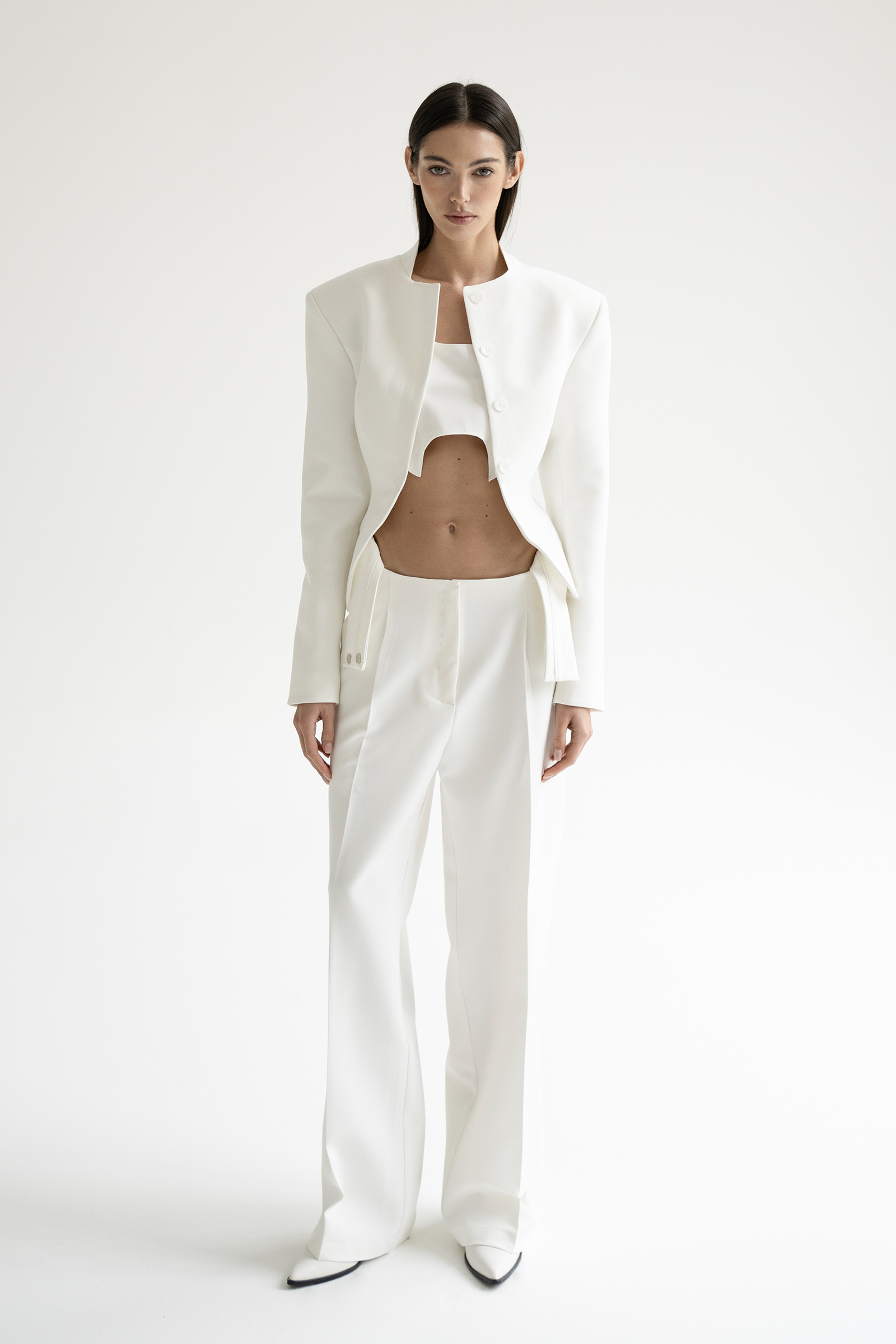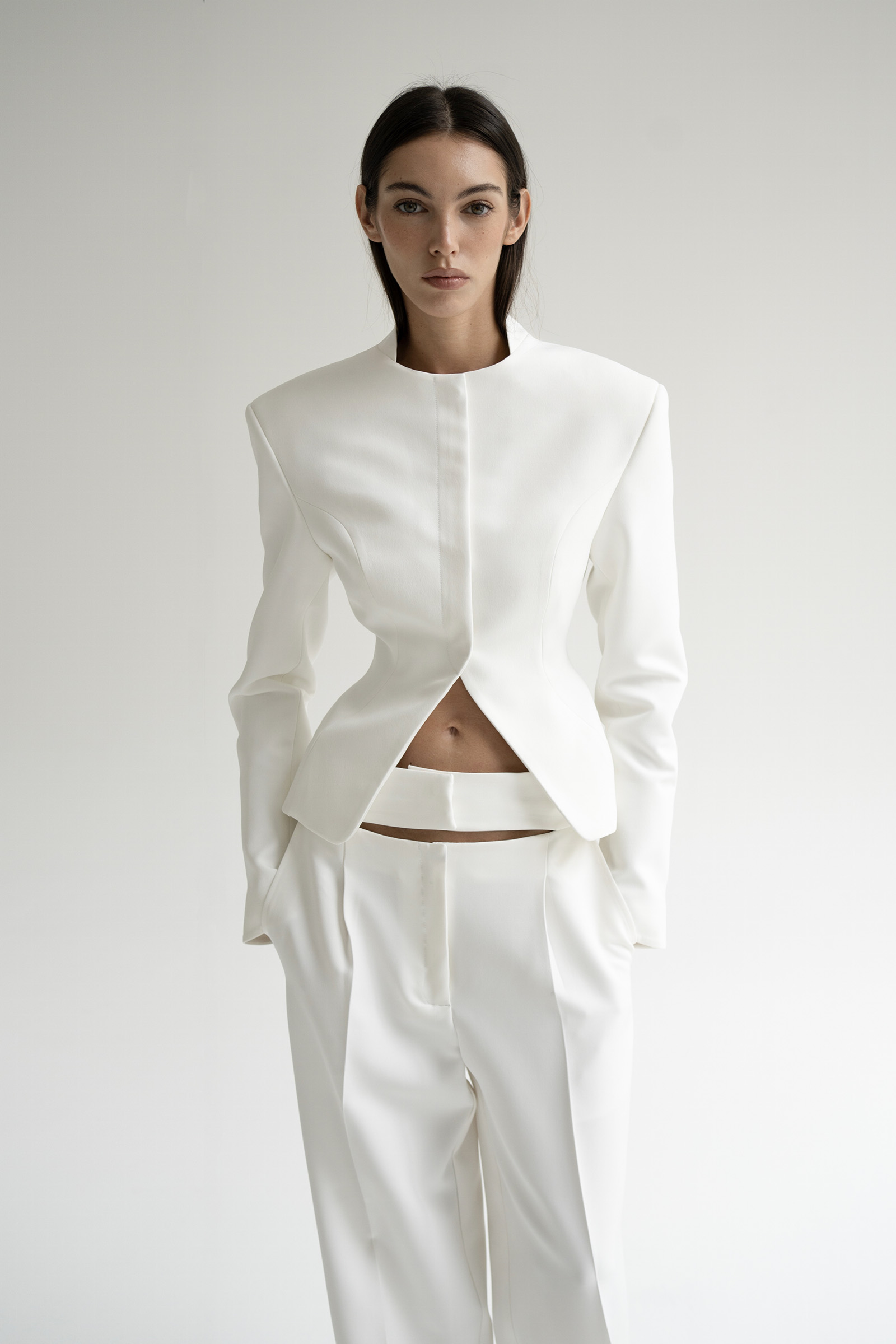 A cropped jacket with a defined, fitted cut and a sharp shoulder line. The piece fastens with hidden buttons. It is crafted from a dense viscose-based suiting fabric. This jacket pairs perfectly with the Blanche top and trousers from our collection.