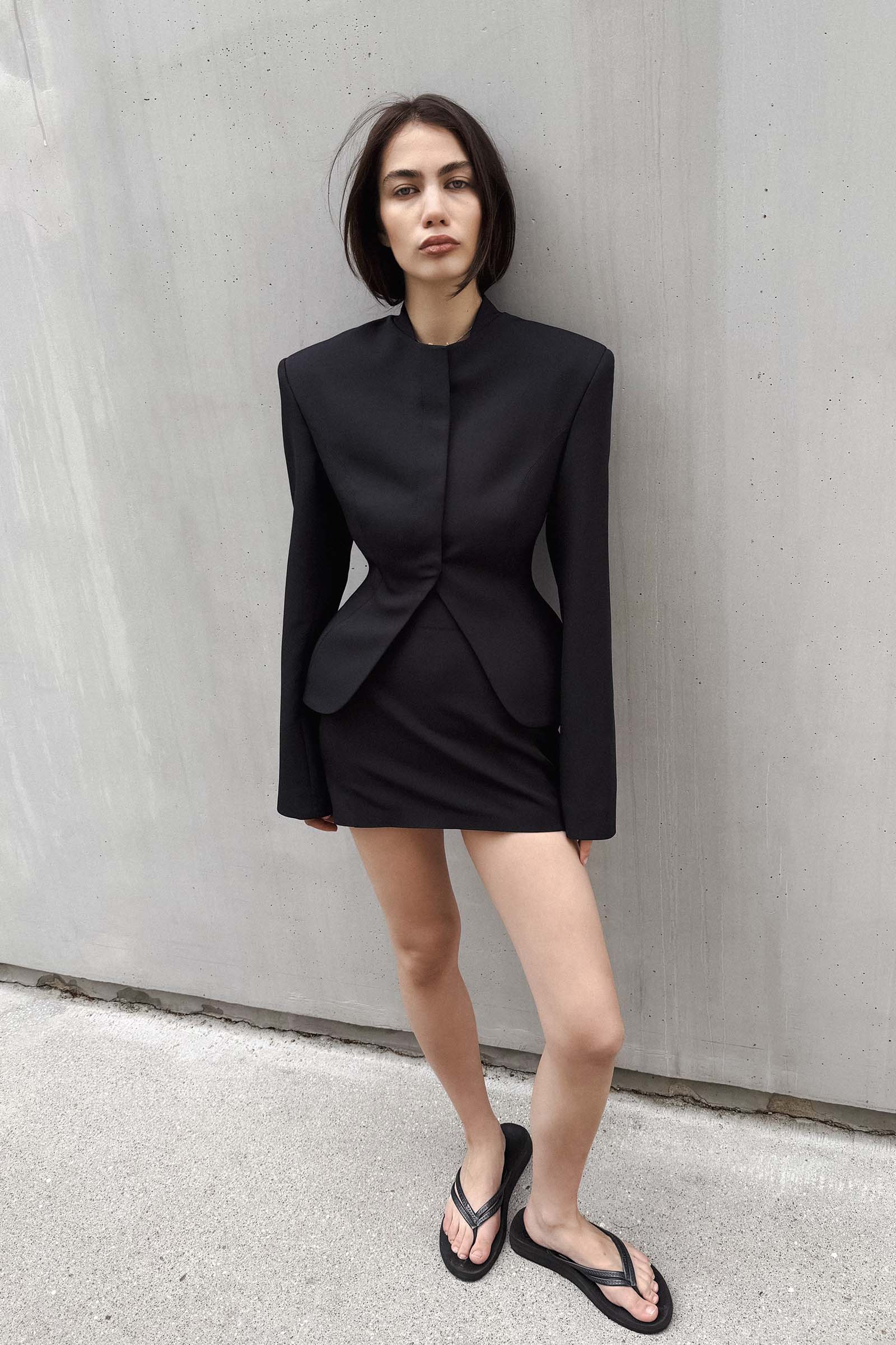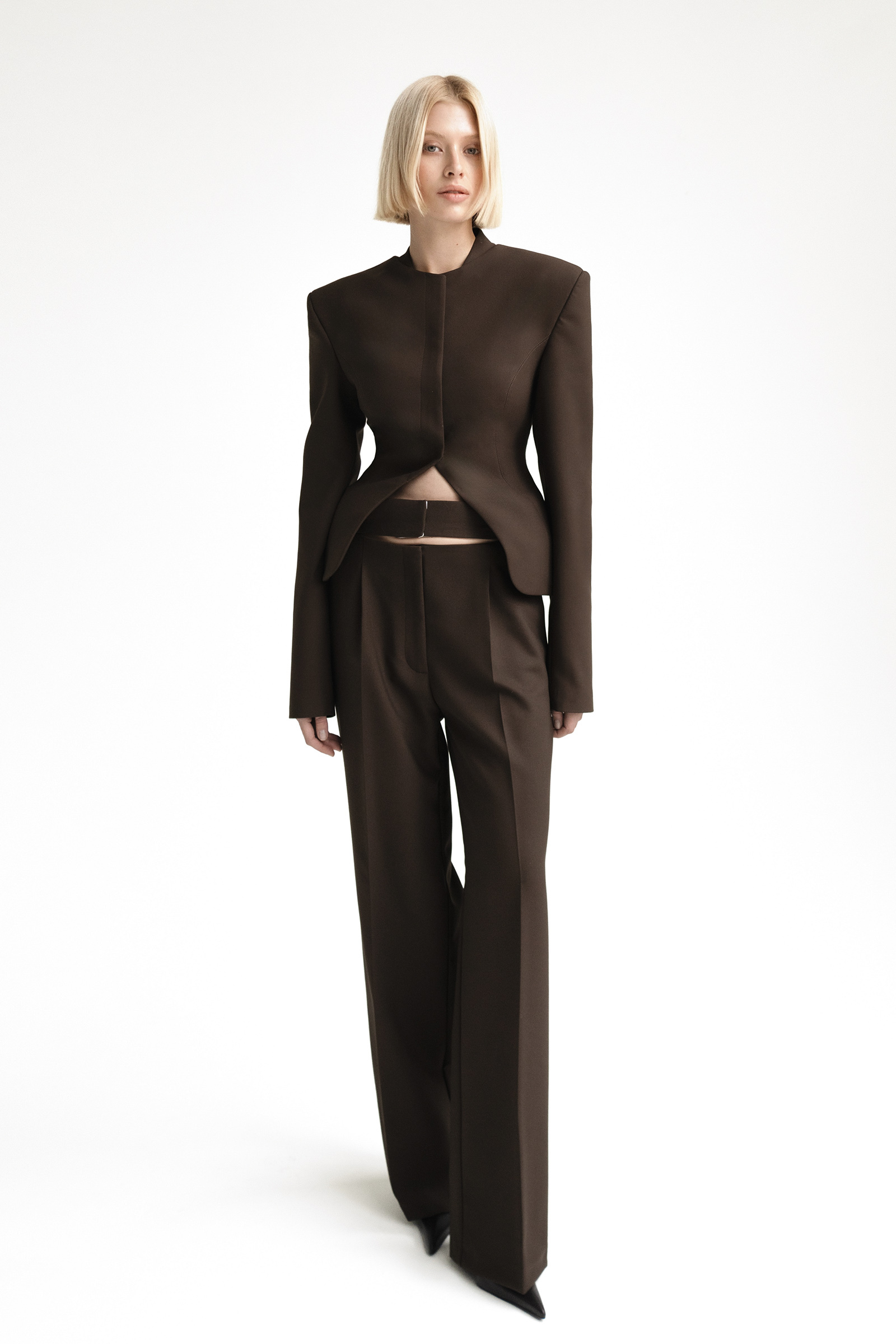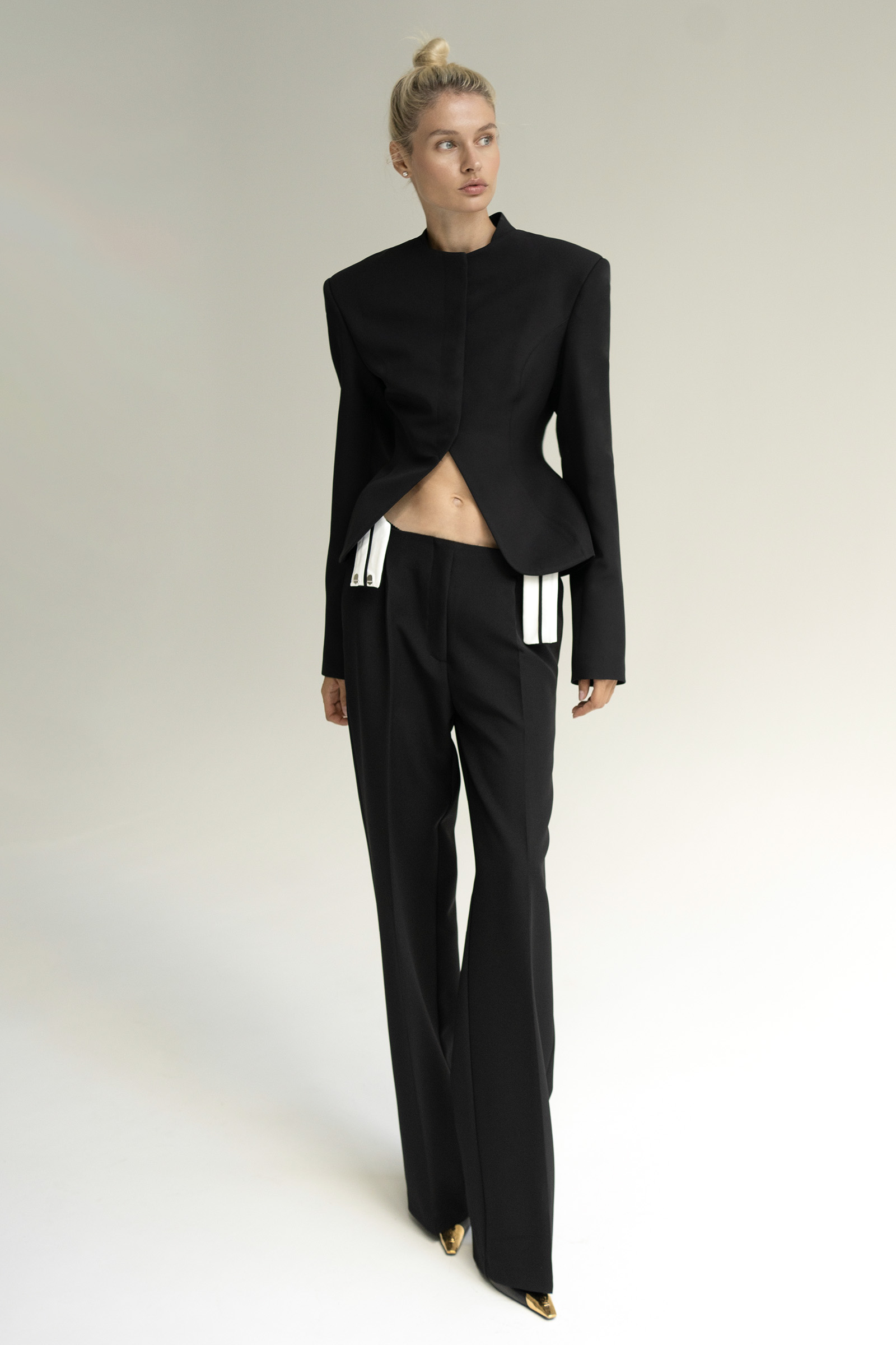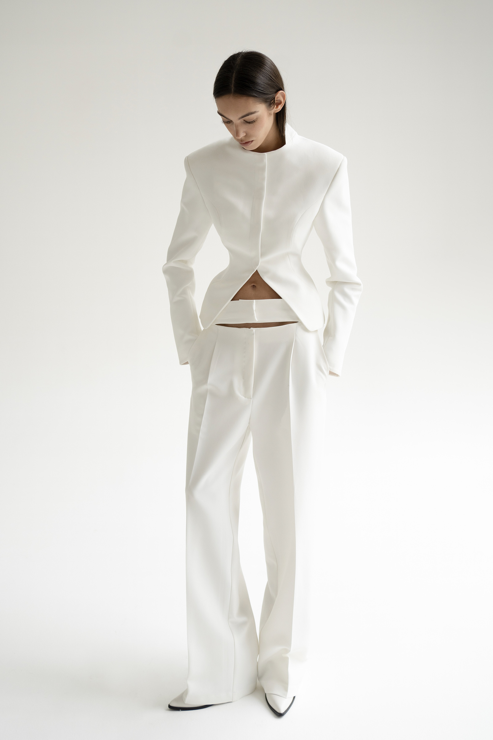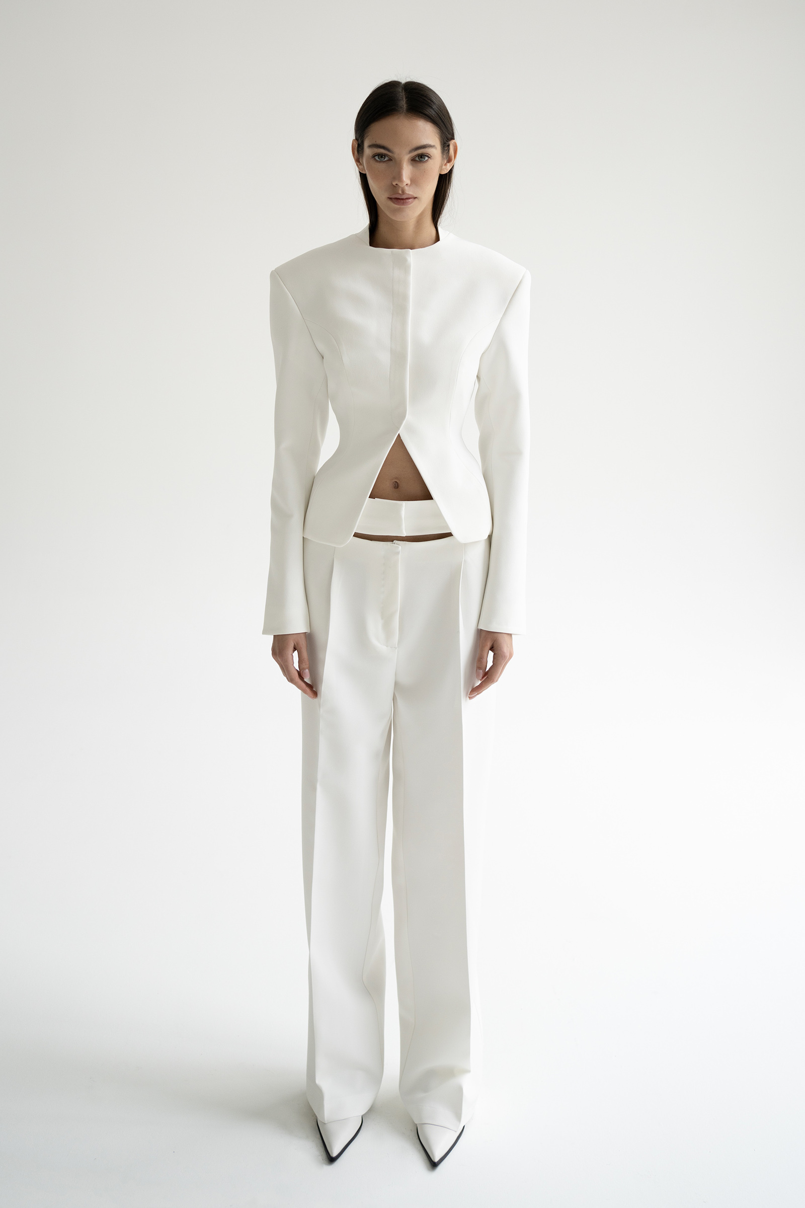 A cropped jacket with a defined, fitted cut and a sharp shoulder line. The piece fastens with hidden buttons. It is crafted from a dense viscose-based suiting fabric. This jacket pairs perfectly with the Blanche top and trousers from our collection.